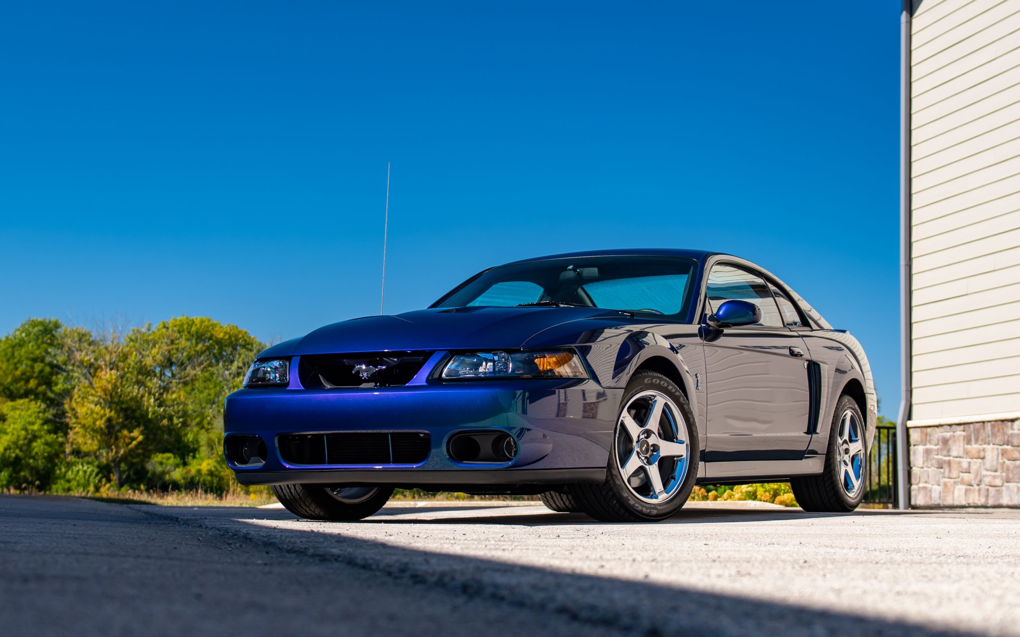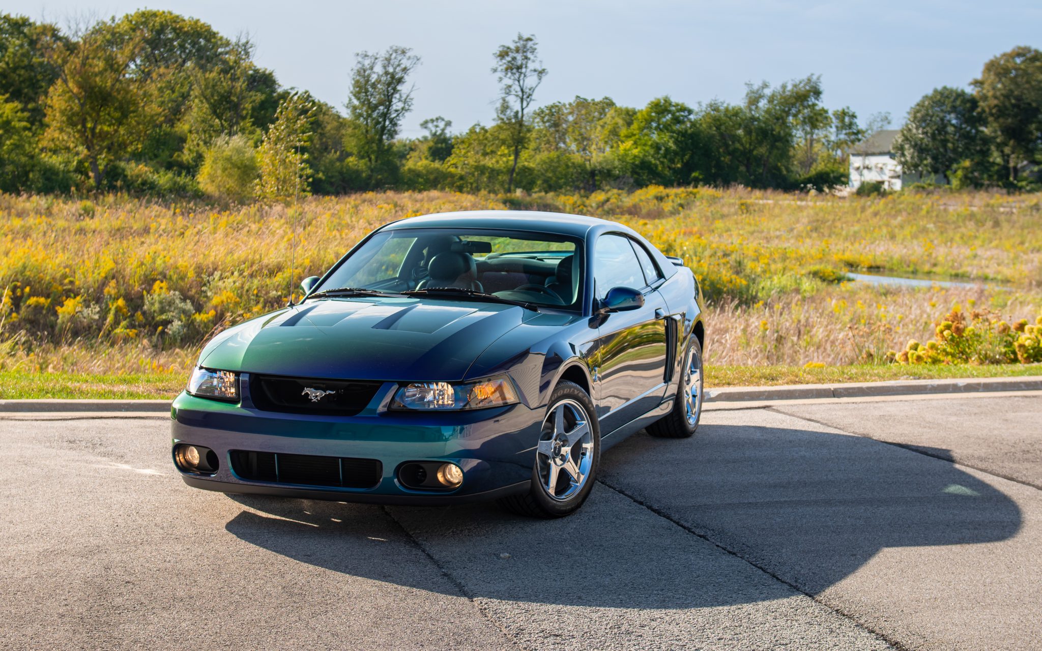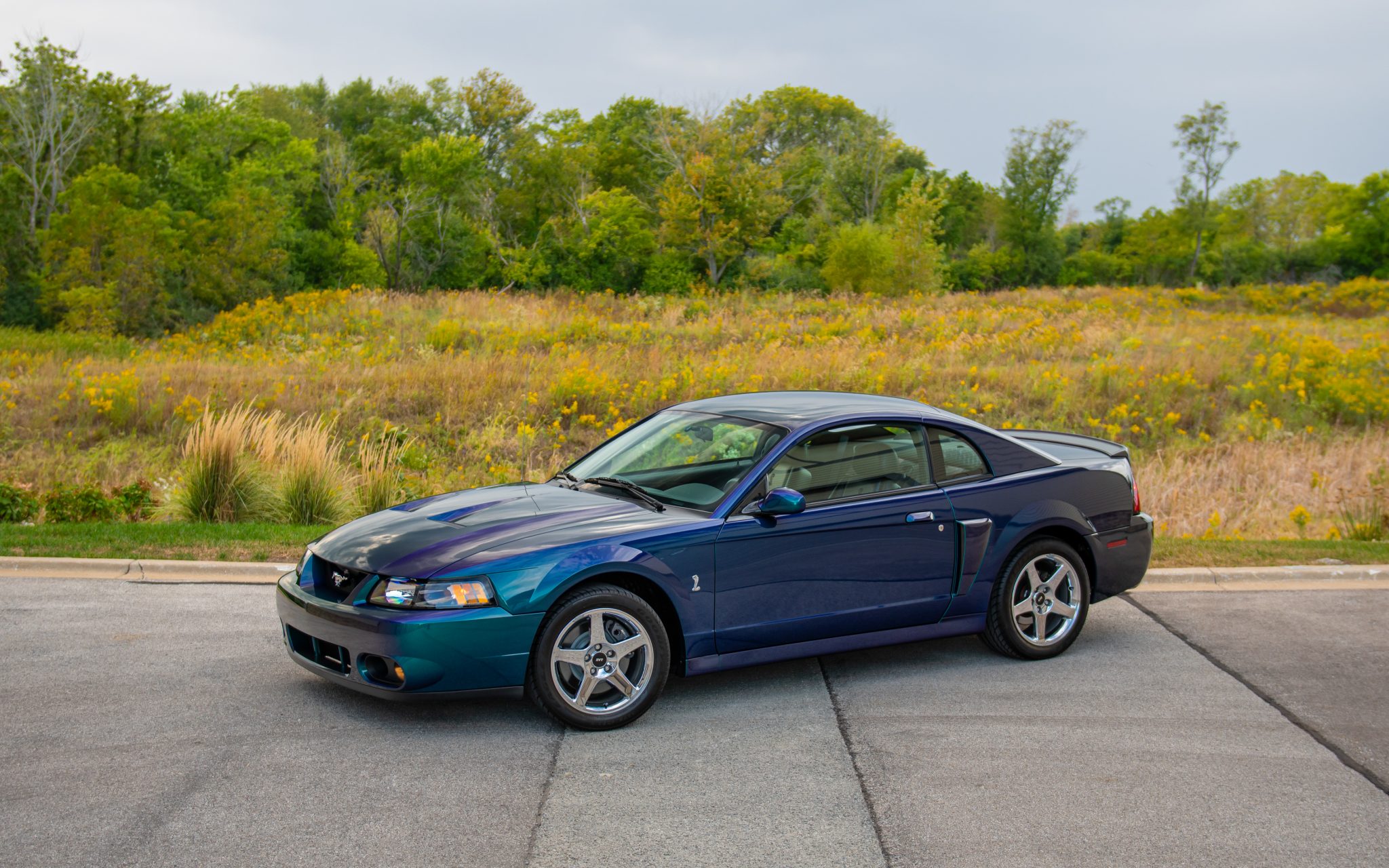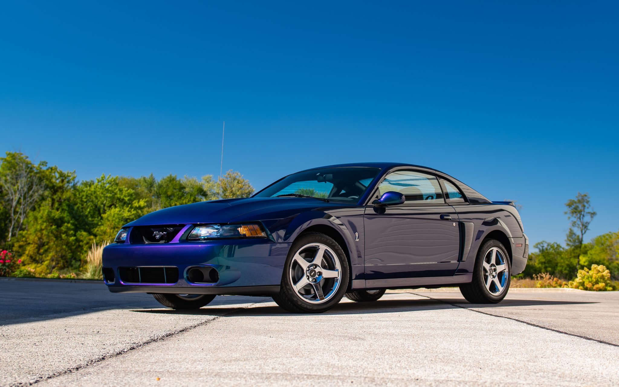 Chrome 17″ five-spoke wheels with SVT-logo center caps are mounted with 275/40 Goodyear Eagle F1 tires. Stopping power comes from four-wheel disc brakes with Cobra-branded calipers up front, and the car is equipped with a traction control system. SVT-specific suspension components consist of linear-rate springs, gas-pressurized front struts and rear shocks, and an independent rear suspension.