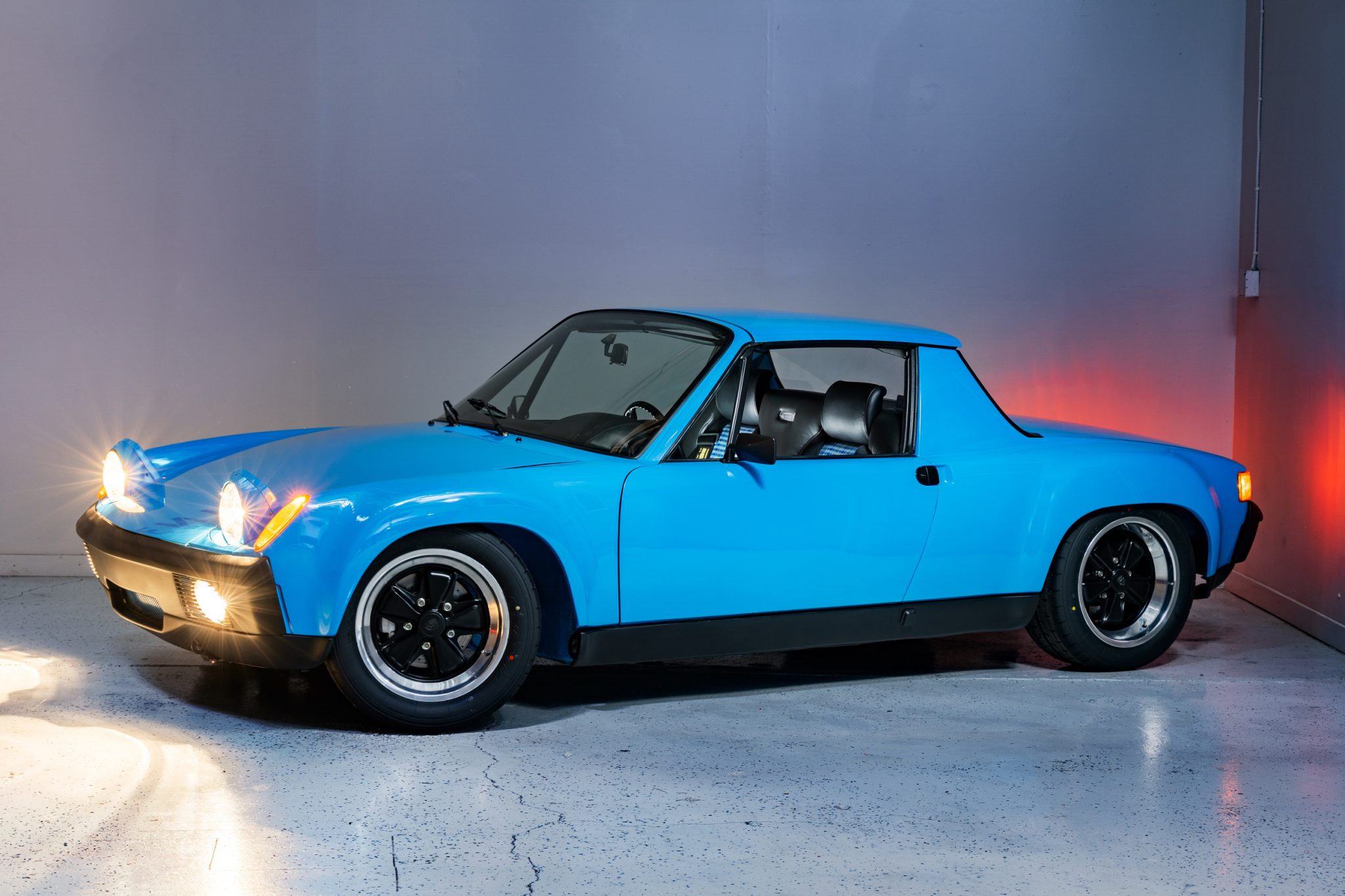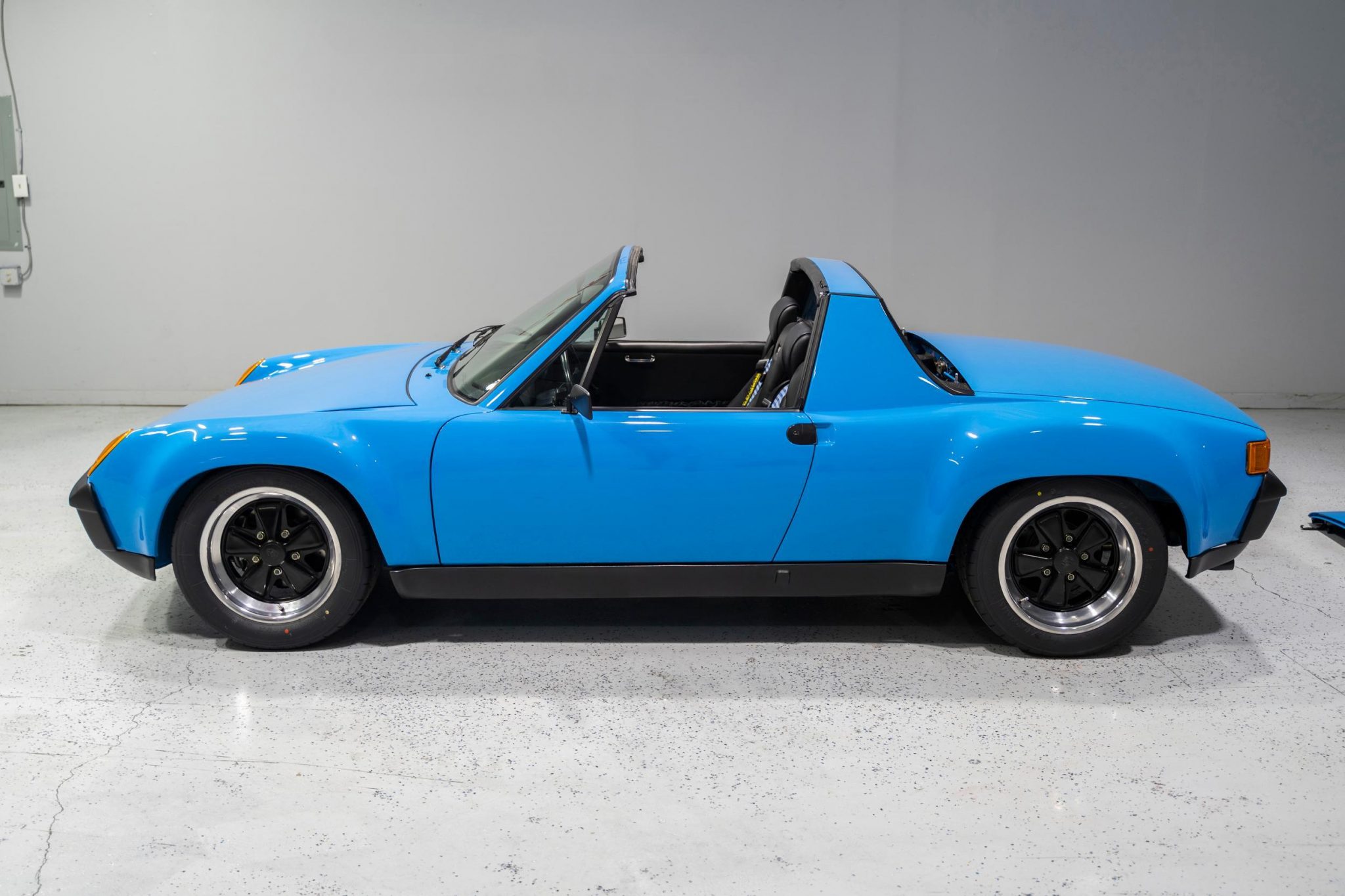 Fuchs 16″ alloy wheels measure 7″ wide up front and 9″ out back and feature black centers with polished lips. Yokohama Advan A052 tires are said to have been recently mounted, and stopping power is provided by 911S calipers paired with cross-drilled rotors at all four corners. The seller notes that a handbrake is not currently installed, though associated components are included in the sale. Suspension, steering, and chassis modifications include the following: