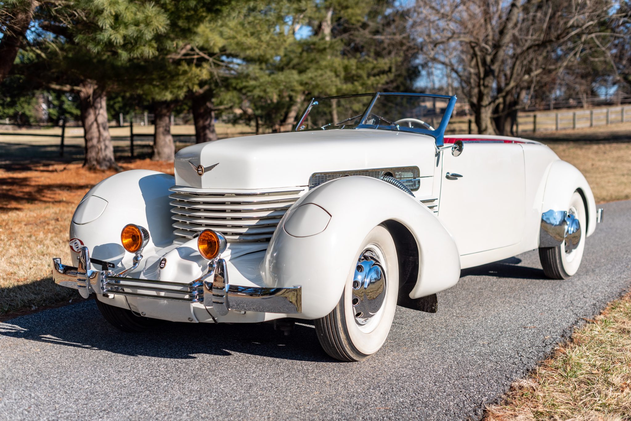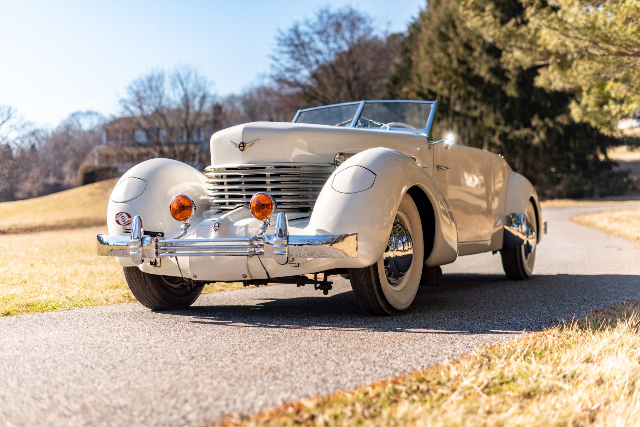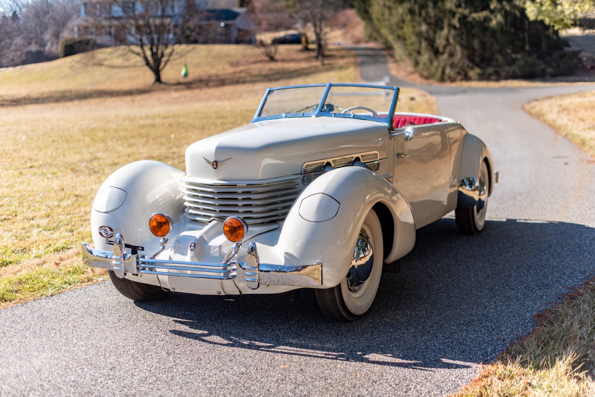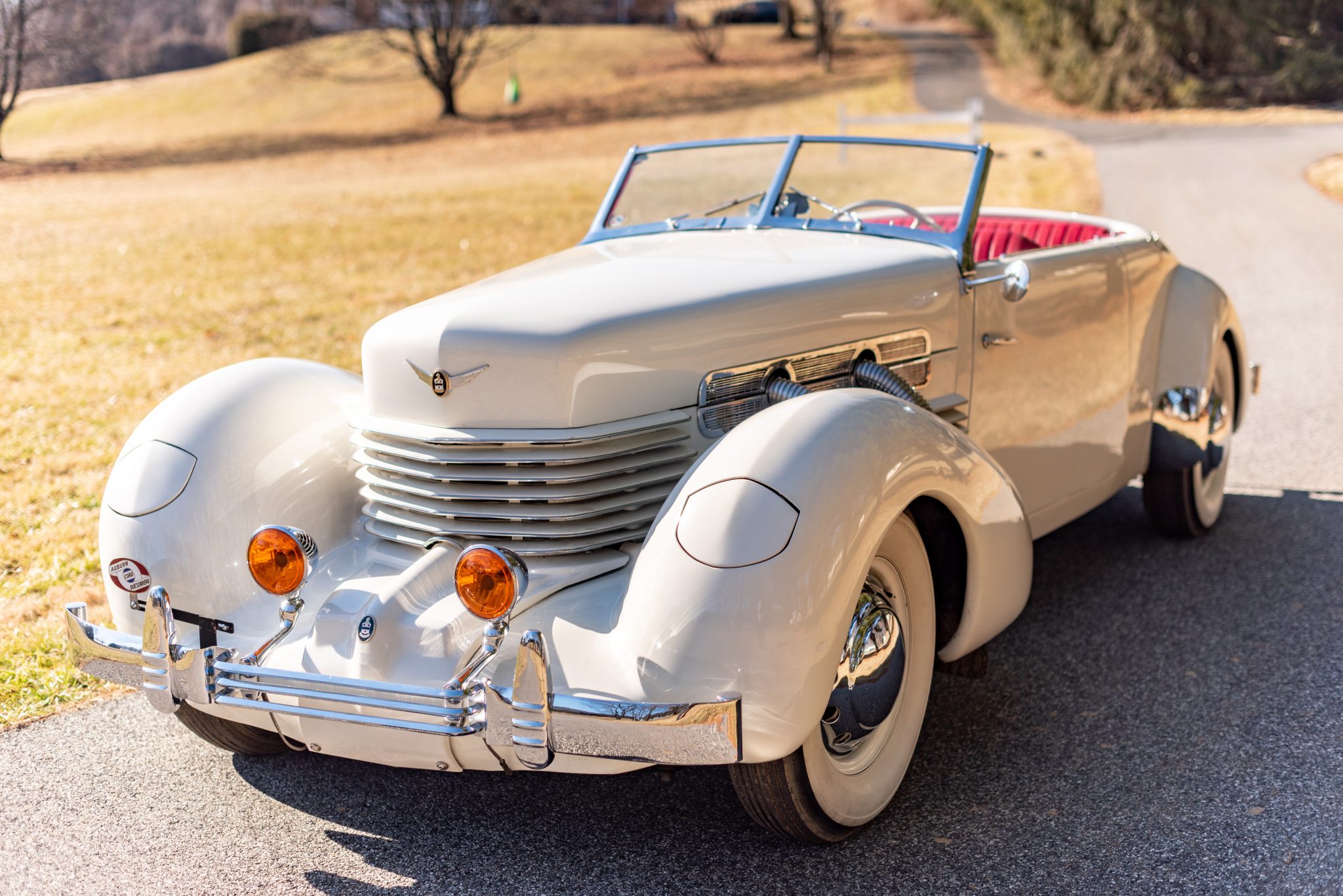 The two-door Phaeton bodywork was repainted ivory during the 2000 refurbishment. Features include chrome bumpers and rear fender stone guards, rear-hinged doors, pop-up headlights, and fog lights. A black soft top was reportedly installed in 2000 and can be seen raised in the gallery.