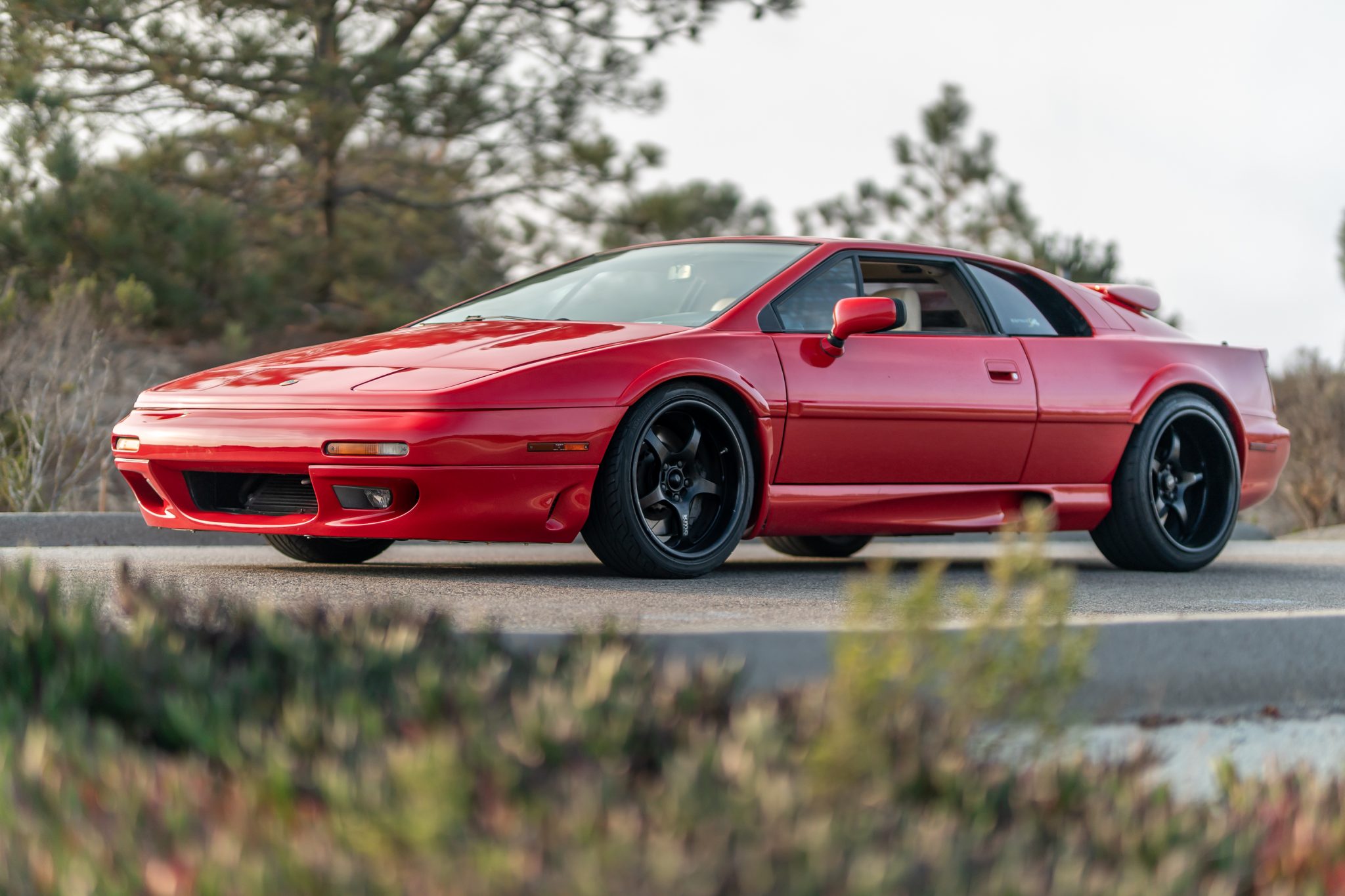 Aftermarket KMC Tracklite wheels measure 17×8.5″ up front and 18×10″ out back and are mounted with Yokohama S Drive tires sized 215/40 and 265/35 respectively. The car has been fitted with a 332mm Alcon front brake kit, and the ABS system has been removed. The left front wheel was repaired and the shocks, springs, upper ball joints, and radius arm bushings were replaced in 2019. The removed factory wheels are included in the sale.
