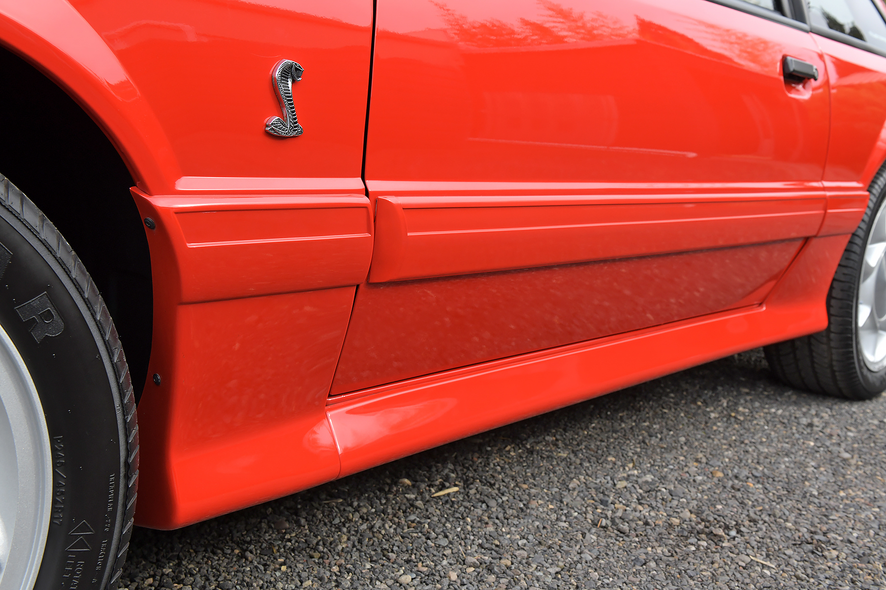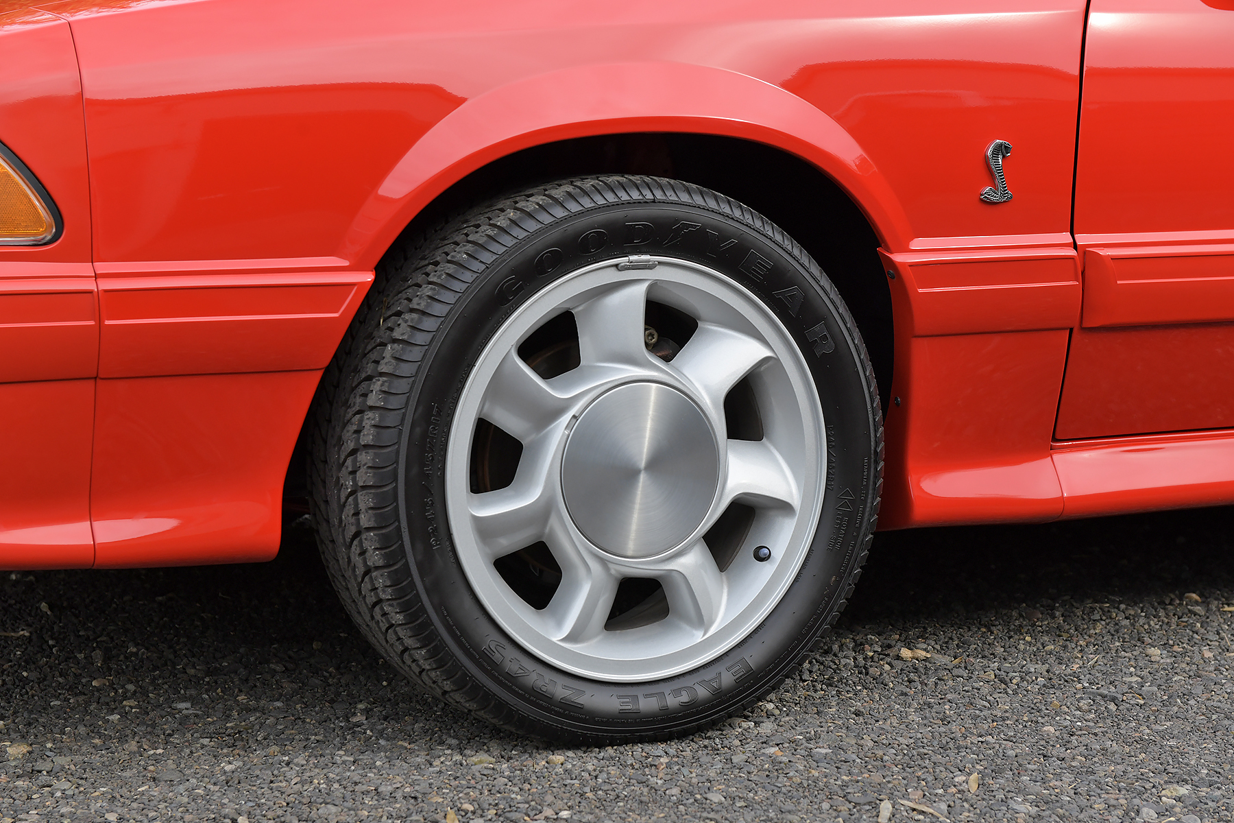 Directional 17×7.5″ cast-aluminum wheels are mounted with Goodyear Eagle ZR45 tires. Standard equipment on the SVT Cobra included power-assisted disc brakes and rack-and-pinion steering as well as variable-rate springs and gas-pressurized Tokico shocks and struts.