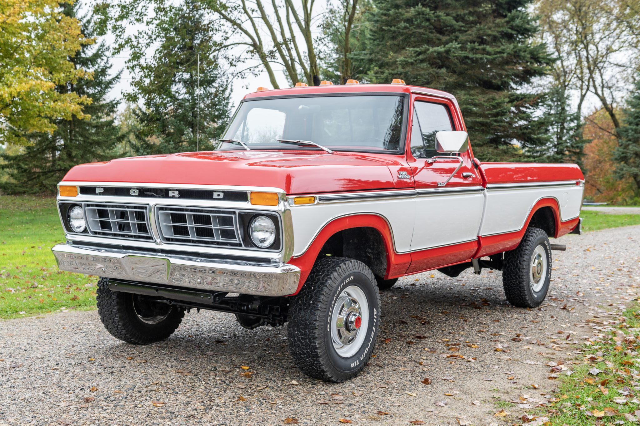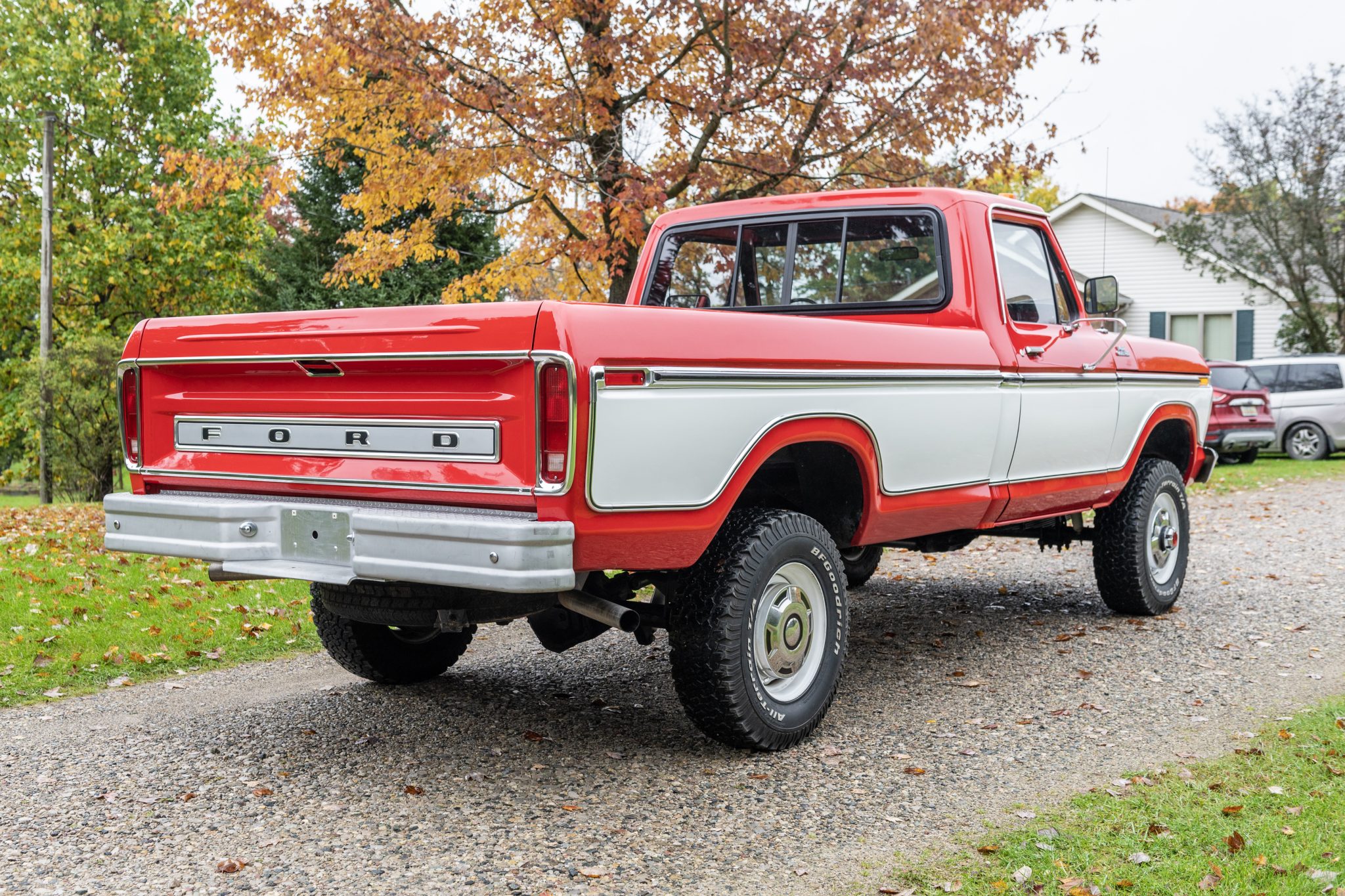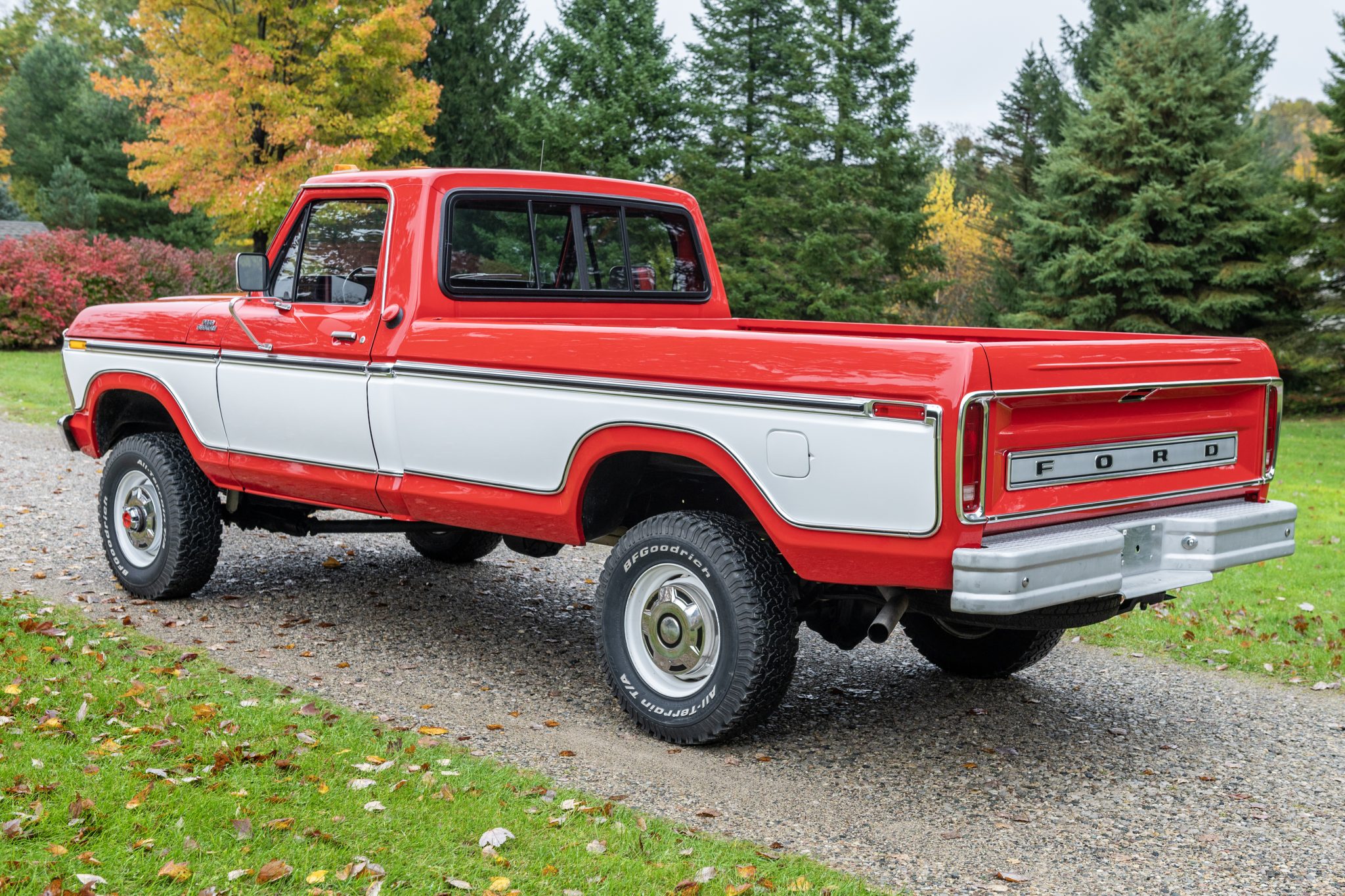 White-painted 16.5″ wheels wear polished hub caps and are mounted with BFGoodrich All-Terrain T/A 31×10.5 tires. A spare tire is mounted under the truck bed. The truck is equipped with a Borgeson steering shaft, and power steering was added using a rebuilt Ford gear box. Rancho shocks have been fitted, and two rear leaf springs that were removed by the seller are included with the truck.