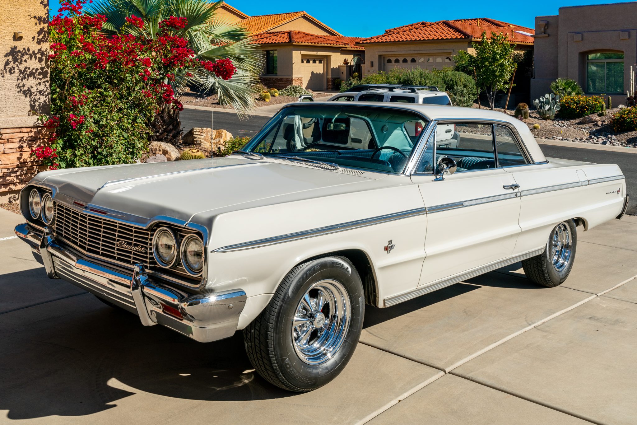 Cragar S/S wheels with a chrome finish are fitted with 15″ Primewell tires. Disc brakes with red-finished calipers are fitted up front, and the vehicle is also equipped with power-assisted steering and rear air shocks.