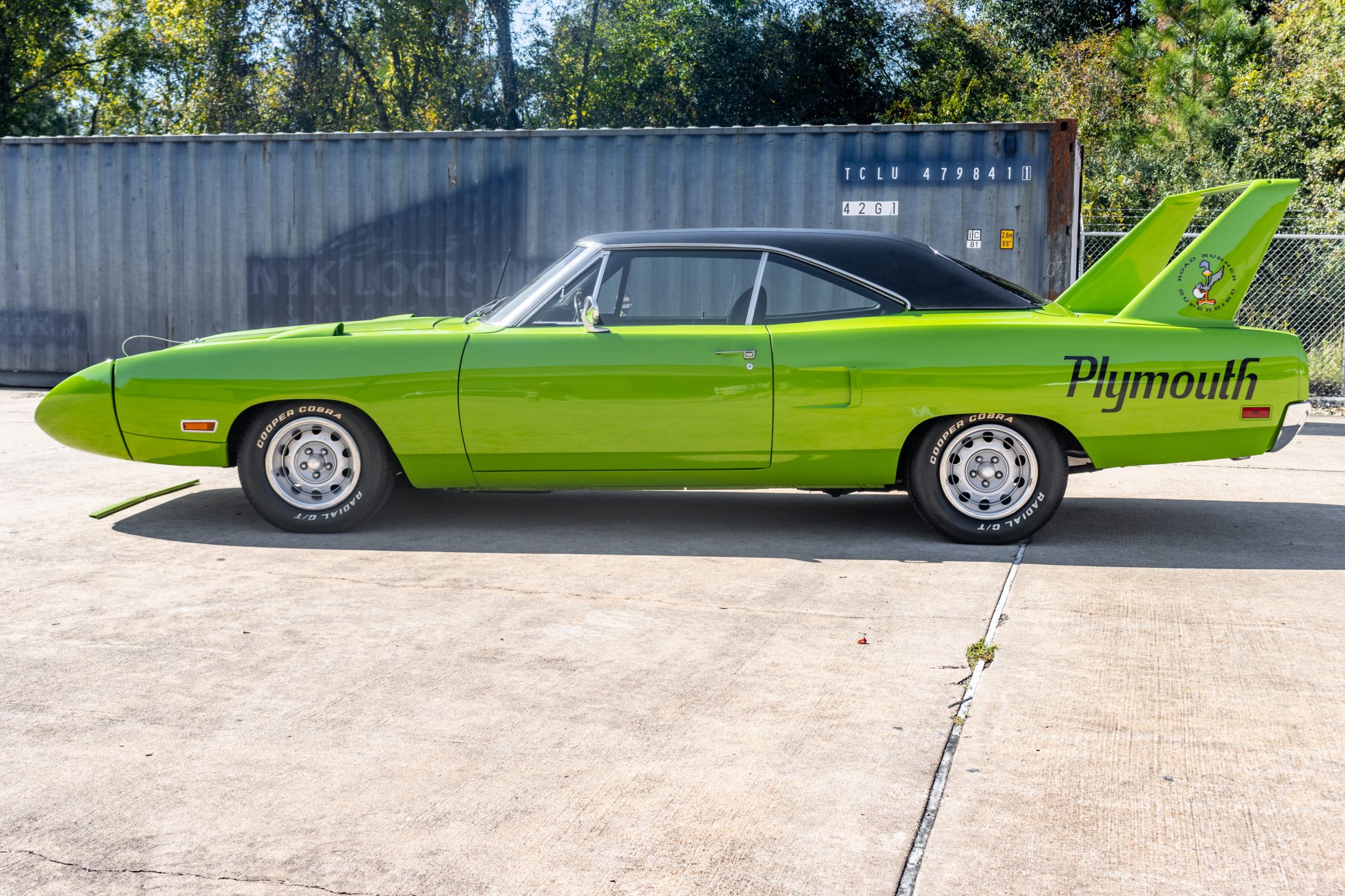 Gray-finished 15″ wheels wear chrome beauty rings and are mounted with Cooper Cobra Radial G/T white-letter tires. A full-size spare is mounted in the trunk. The car is equipped with power steering and braking is handled by power-assisted front discs and rear drums. The seller notes that the jack and jack stands are missing.