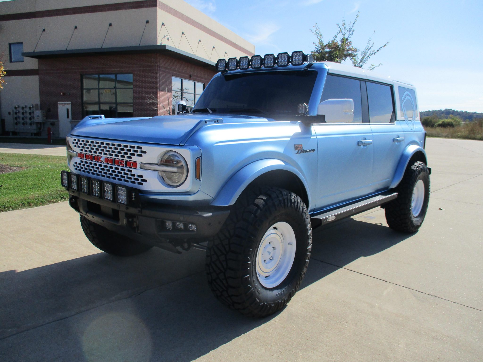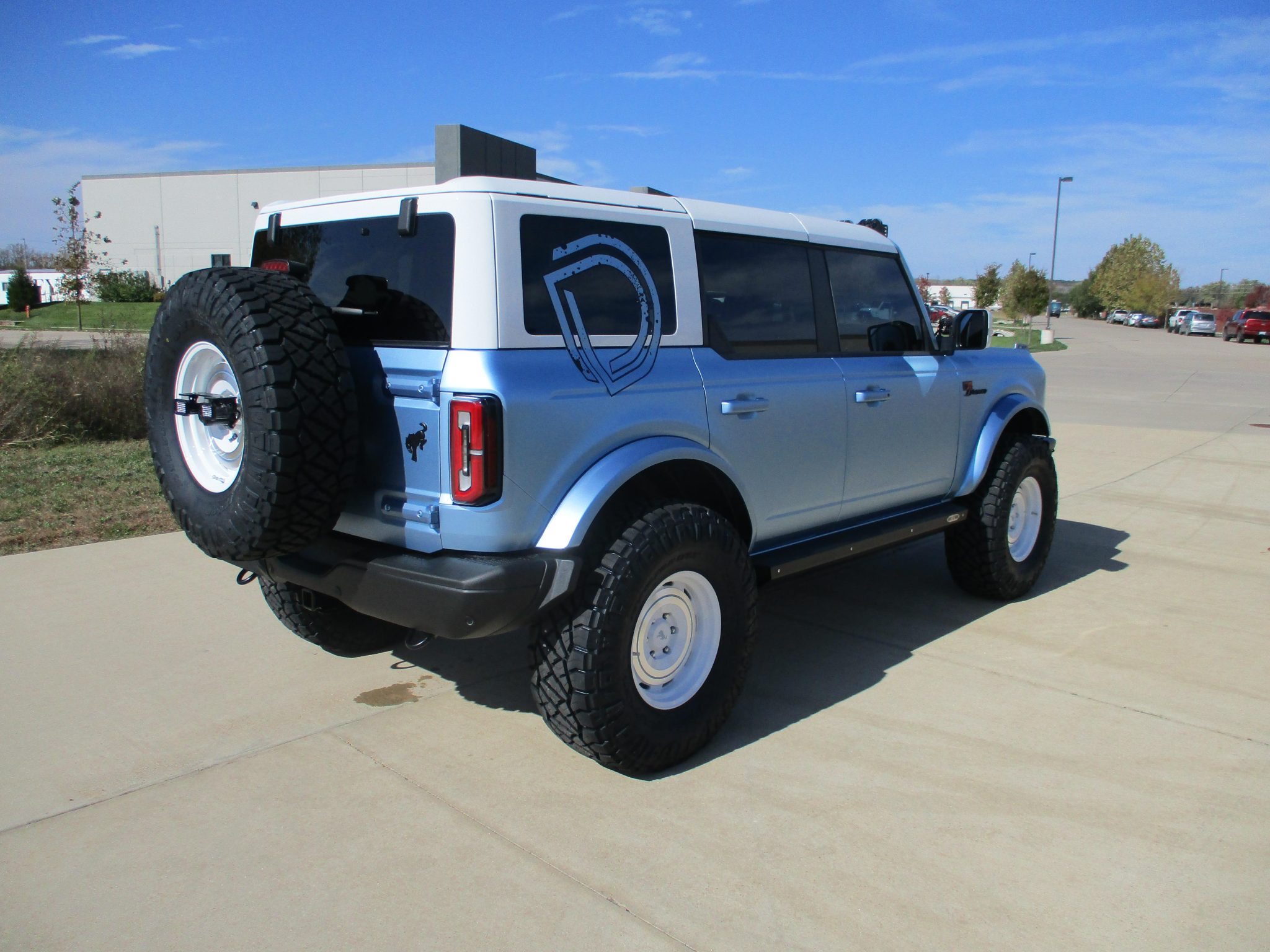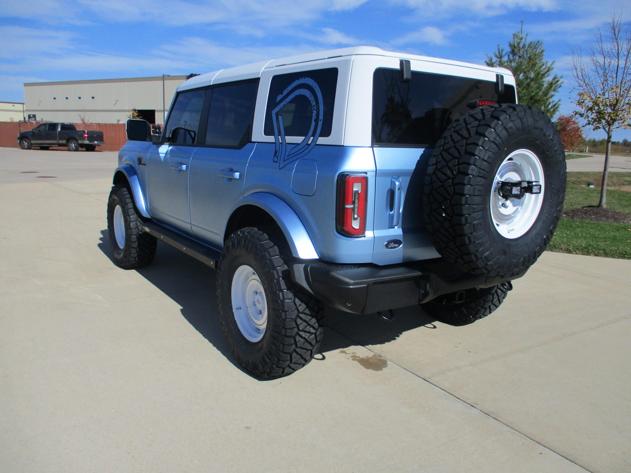 The 17″ KMC Roswell wheels were finished in white with Brittany Blue pinstriping by Dent Wizard of St. Louis, Missouri, and they are mounted with 37″ Nitto Ridge Grappler tires. A matching spare wheel is mounted with an LED third brake light out back. The suspension was reportedly modified by Hellbent Customs of Chesterfield, Missouri, with a 4 Wheel Parts 3.5″ coilover lift kit with control arms. The anti-lock braking system features discs at all four corners.
