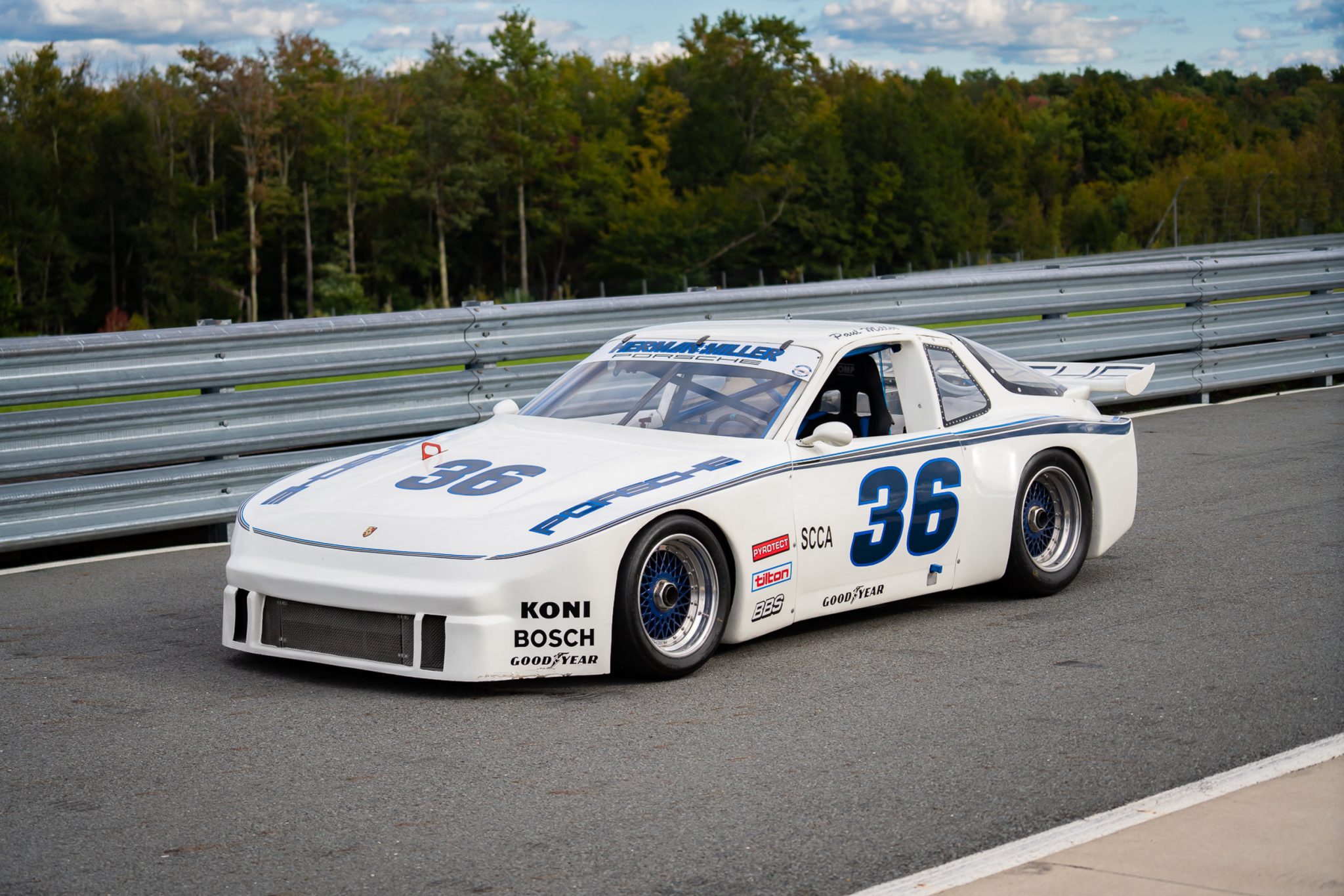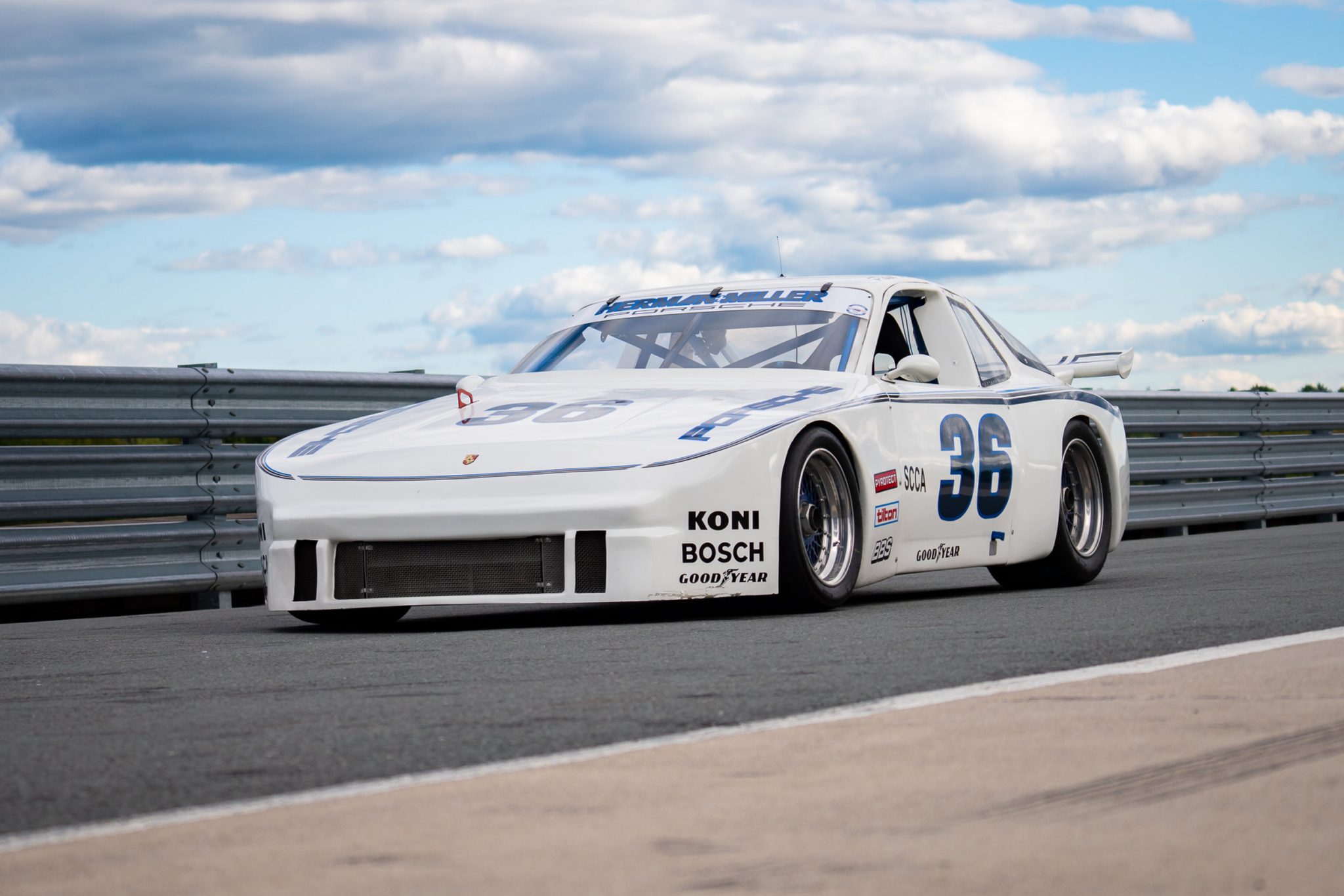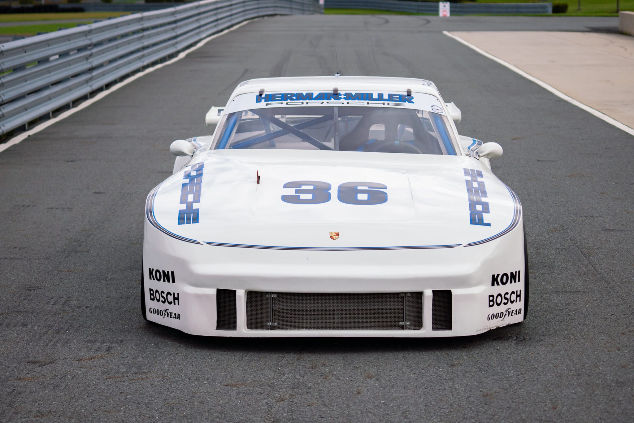 The car underwent revisions to its silhouette body and frame as permitted by Trans-Am rules during three seasons with Miller. For 1985, the chassis was revised by David Klym of Fabcar to accommodate a David Brun-designed double-wishbone suspension setup, while the body shell was updated to a lighter-weight composite material with reengineered aerodynamics. The 2012-2015 project was based on this 1985 configuration and included refinishing the tube frame in its period blue. Bodywork wears the 1985 Herman+Miller white and blue No. 36 graphics, which were reportedly provided by the same specialist who handled their application in period.