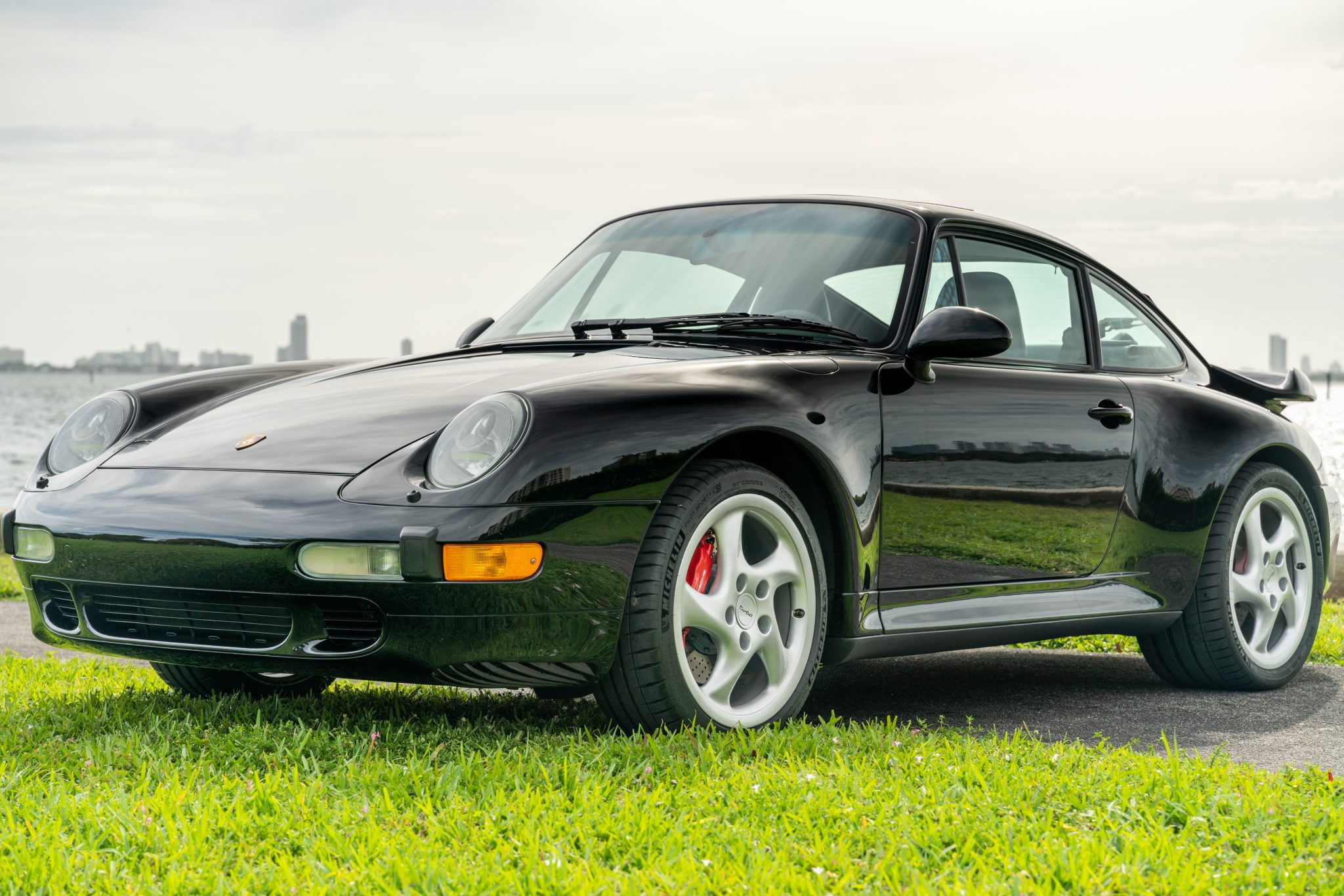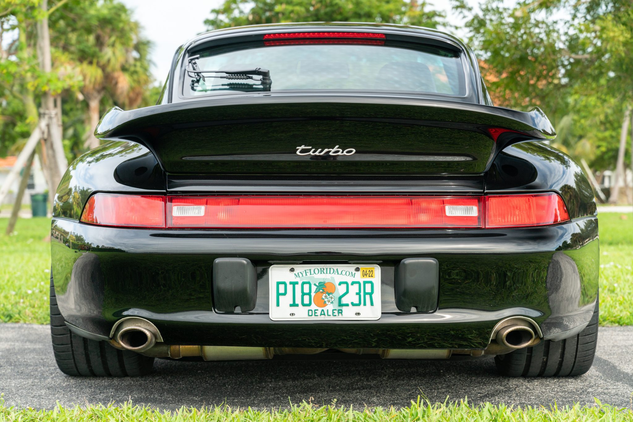 Turbo Twist 18″ wheels with Turbo-script center caps wear staggered-width Michelin Pilot Sport tires fitted during prior ownership and bearing 2020 and 2021 date codes. Braking is provided by four-piston front and two-piston rear red-finished calipers with cross-drilled rotors, and a brake fluid flush was performed and the front pads and rotors were replaced in 2021. The inspection report from June 2021 notes that the rear subframe, front and rear cross members, and right-front suspension components have been replaced, and repairs were made on the left side of the tub.