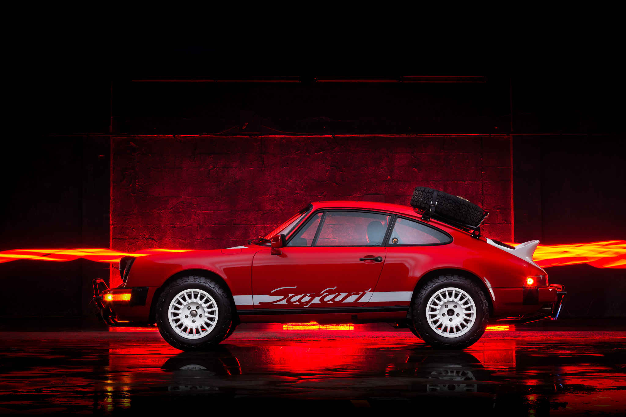 16″ BRAID wheels wear 215/65 BFGoodrich All-Terrain A/T K02 tires, and a matching spare is mounted on the roof rack. A custom Elephant Racing coilover suspension has been added, along with hollow front and rear RSR-style sway bars. Braking is handled by four-wheel discs with red-painted calipers. In December 2020, the ball joints, camber plate, and trailing arm bushings were replaced, and 930 Turbo tie rods were added. In February 2021, the brake pads, rotors, and wheel bearings were replaced.
