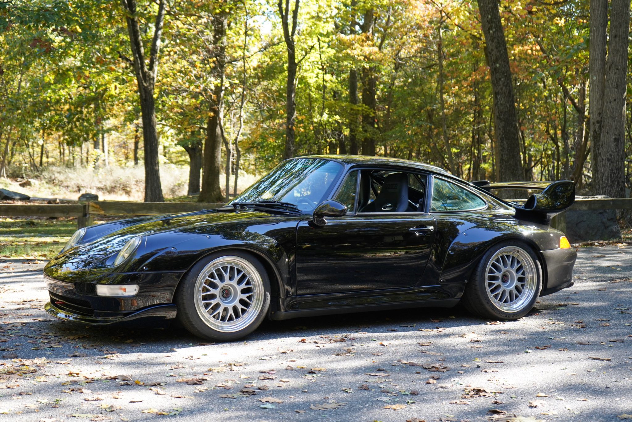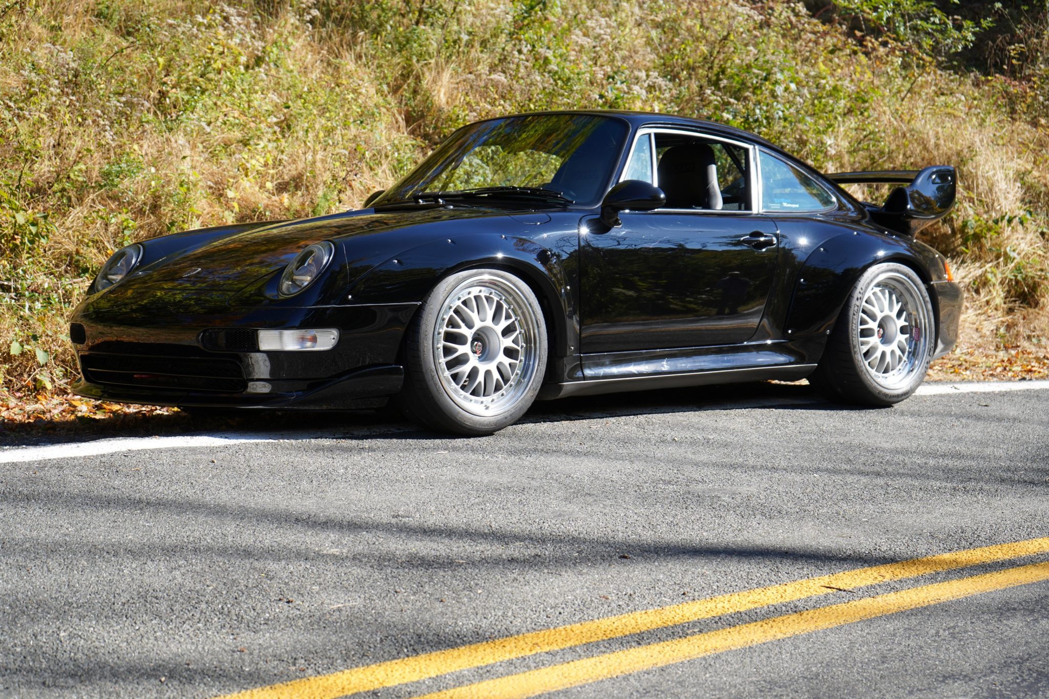 Center-lock GT2 18″ BBS Motorsports Cup wheels are wrapped in Michelin Pilot Sport Cup 2 tires that show 2017 date codes. The suspension is fitted with Moton adjustable shock absorbers with remote reservoirs, along with Porsche Motorsport uprights, toe links, and control arms. Brakes sourced from the Porsche Motorsport GT2 system includes Brembo calipers and slotted rotors. The owner notes that the shocks were recently rebuilt.