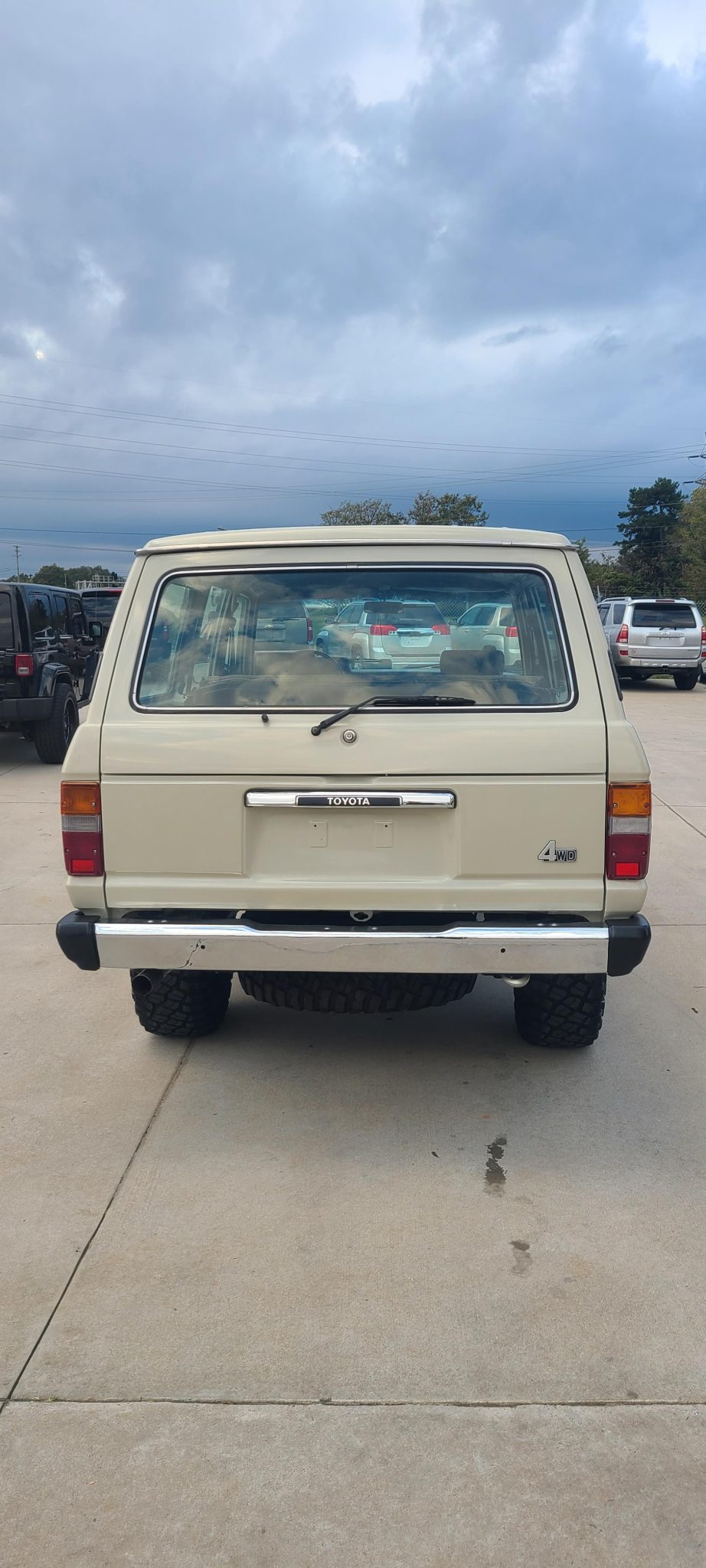 Black-finished 16″ steel wheels wear 285/75 BFGoodrich Mud-Terrain T/A tires that were reportedly installed in 2021. The truck is equipped with manually locking front hubs together and an Old Man Emu suspension lift. The seller reports that the brakes and power-steering system were overhauled during the refurbishment.