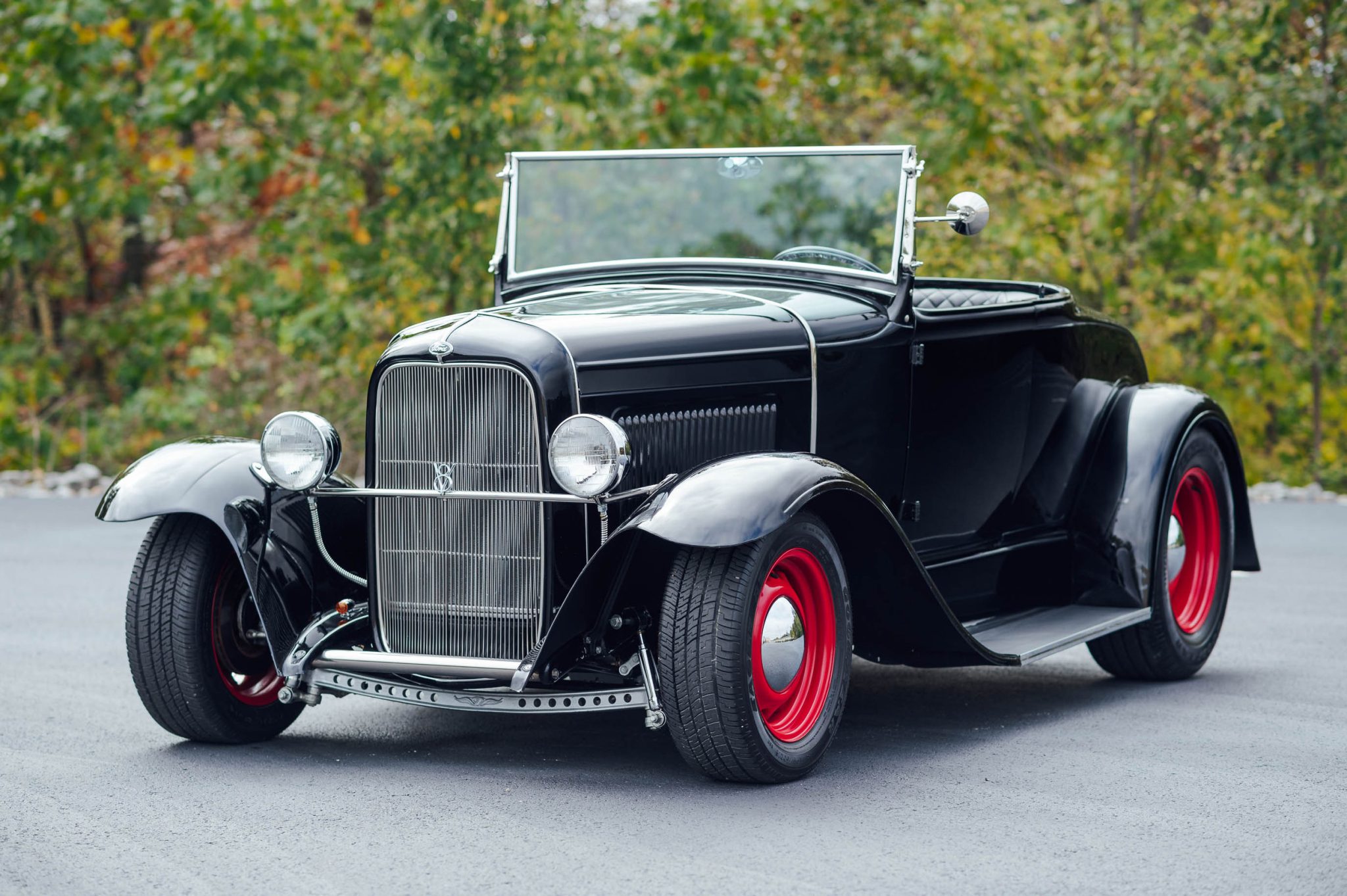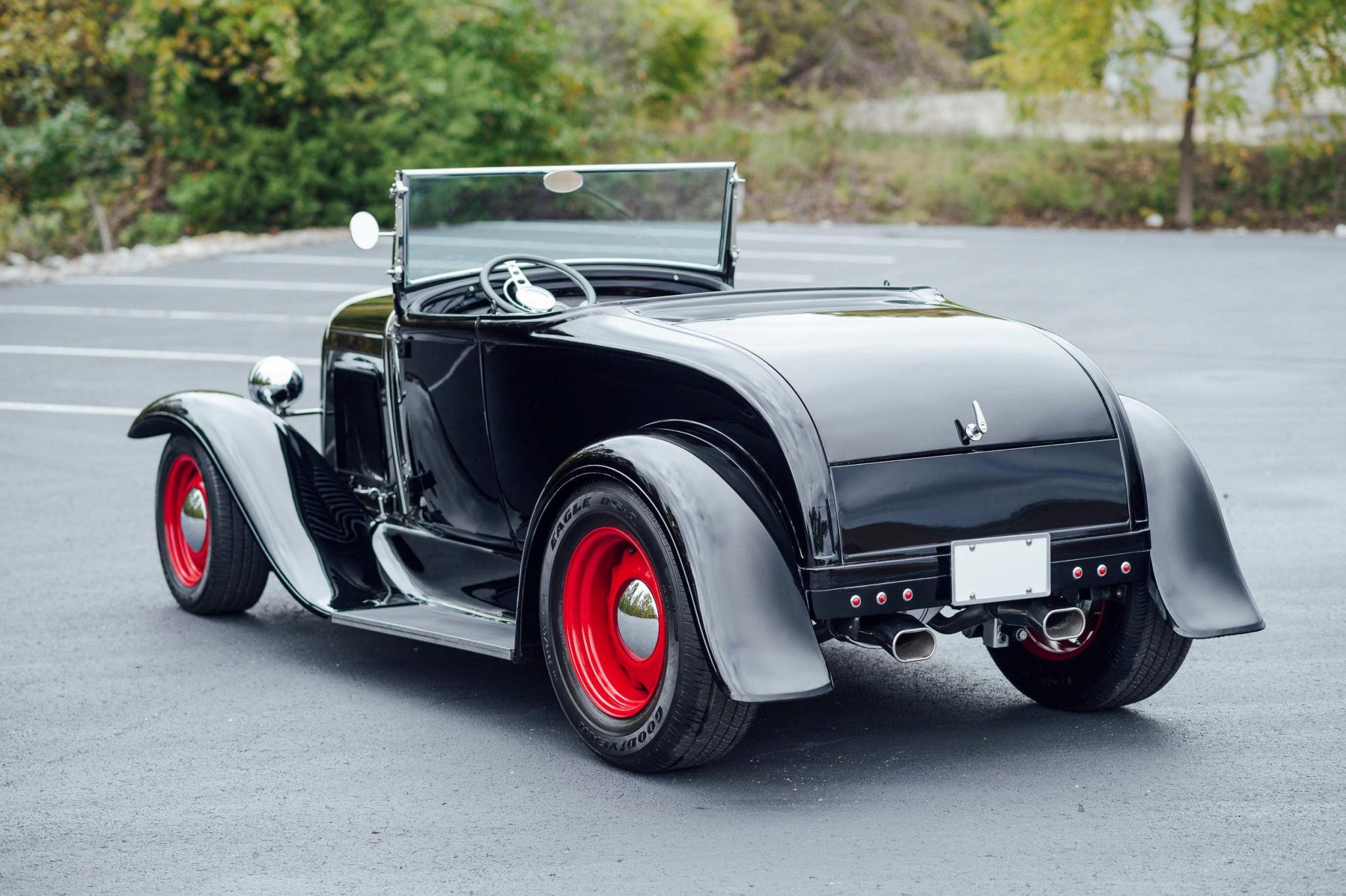 Artillery-style 15″ front and 17″ rear wheels are finished in red with chrome hubcaps and mounted with “big and little” Goodyear Eagle RS-A tires. Stopping power is provided by disc brakes at all four wheels.