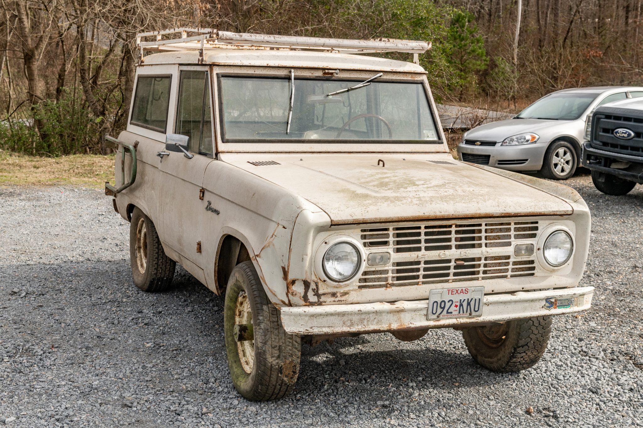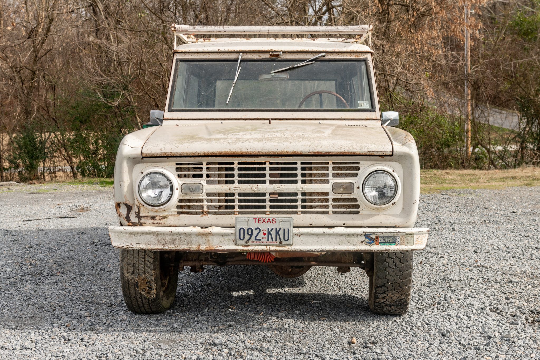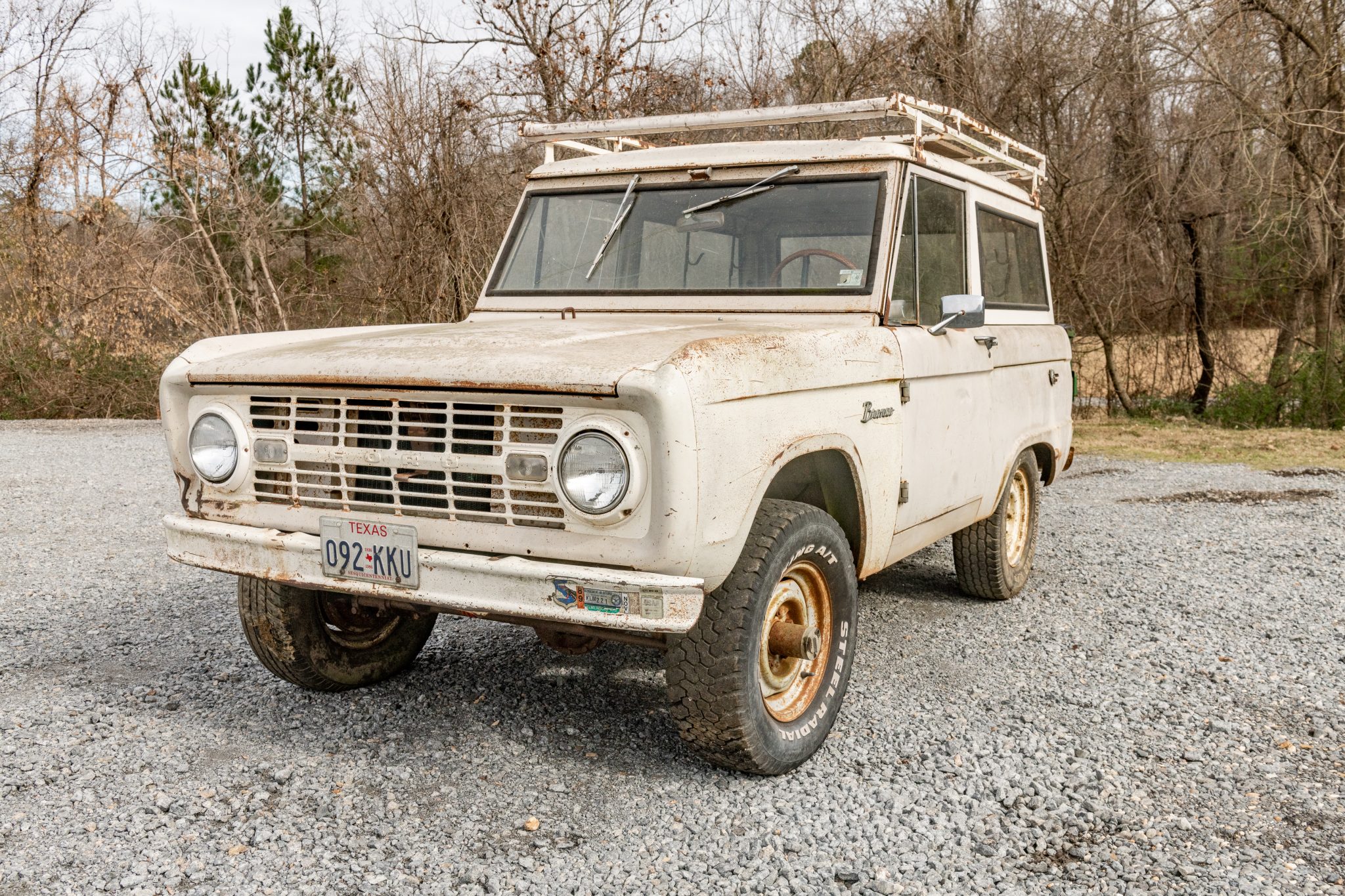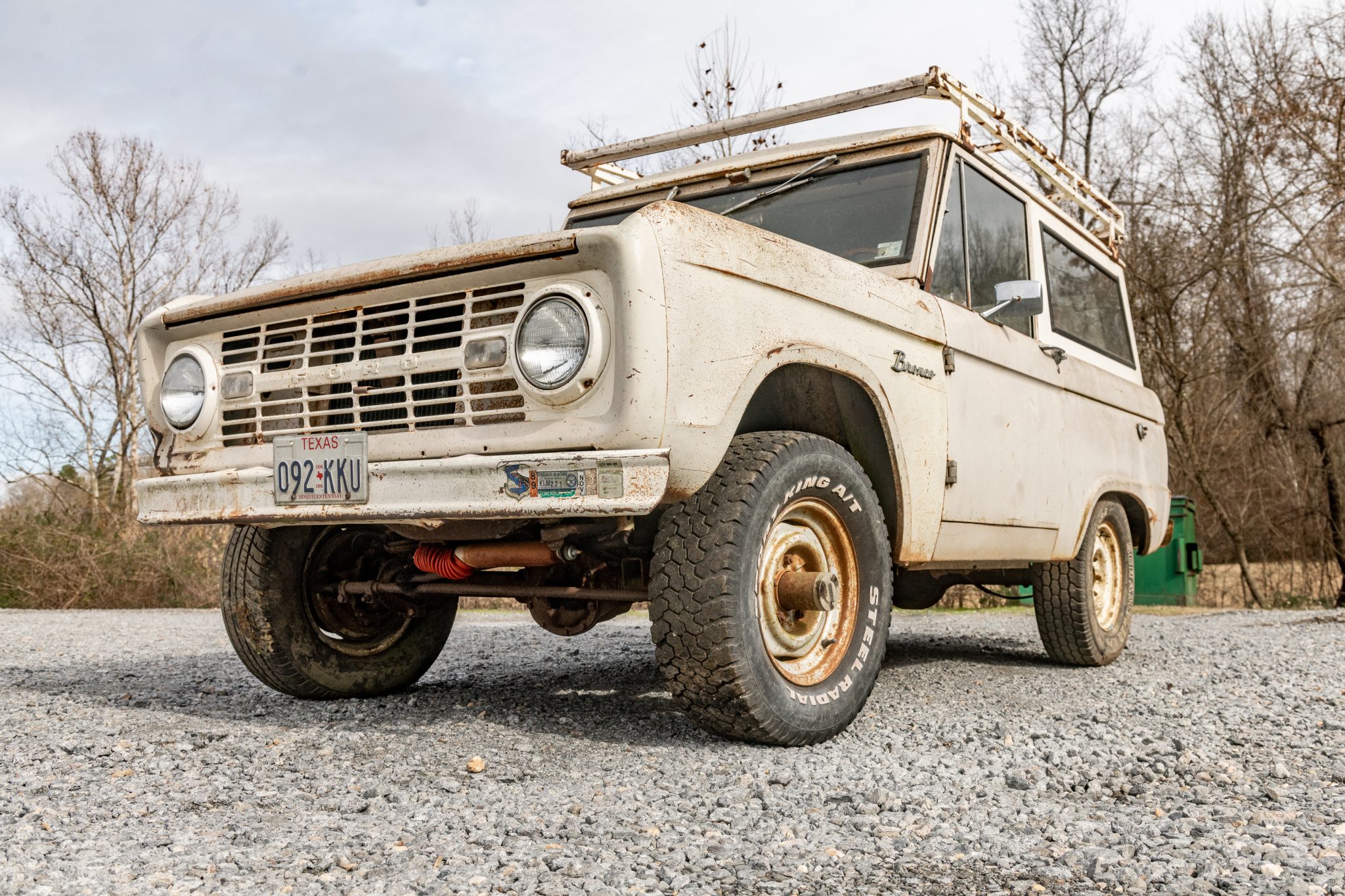 White 15″ steel wheels exhibit corrosion and wear mixed tires that require replacement. Equipment includes manually-locking front hubs and four-wheel drum brakes. Work performed in 2006 reportedly included repacking the wheel bearings and replacement of the brake master cylinder, drums, shoes, and wheel cylinders.