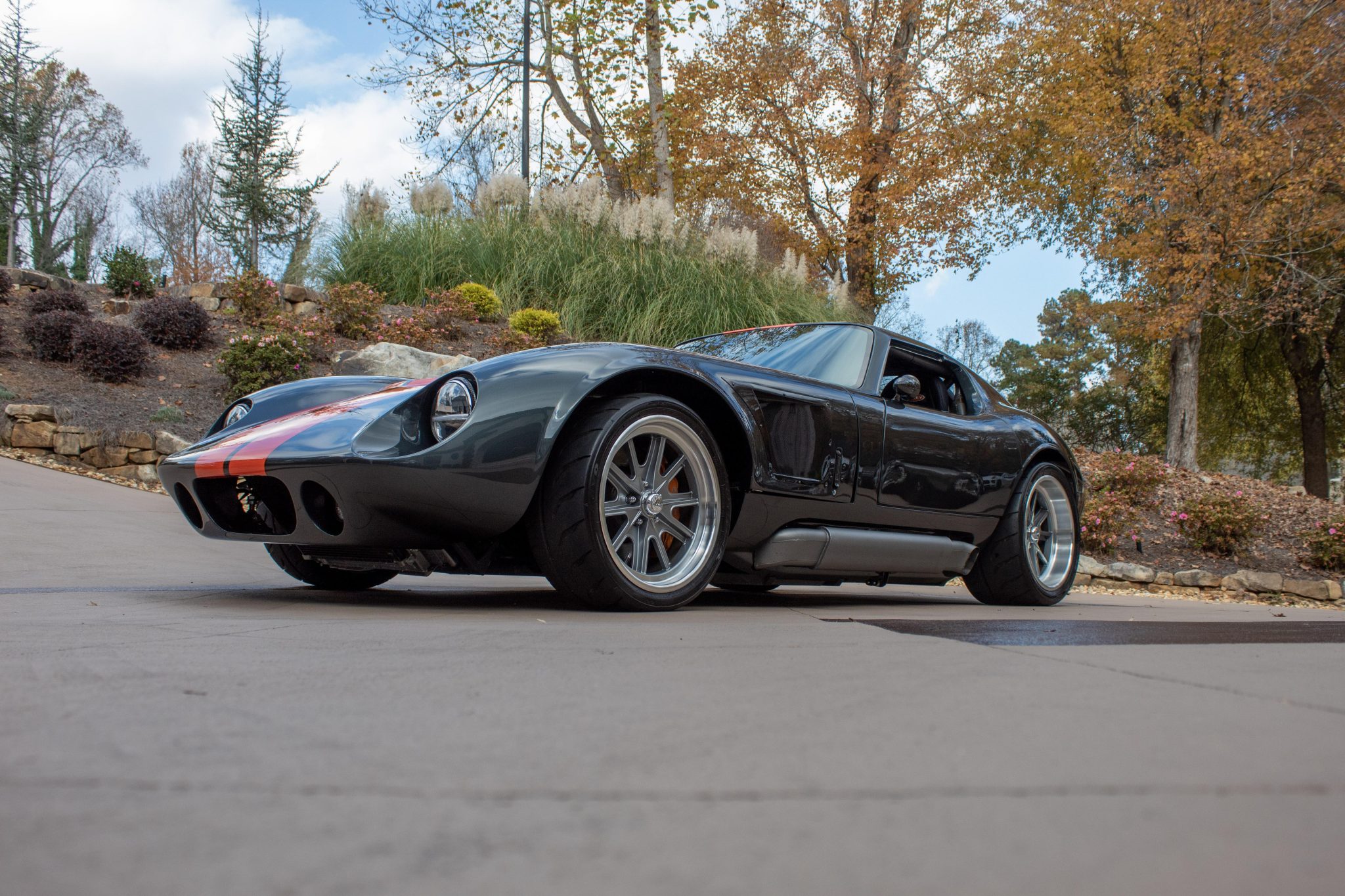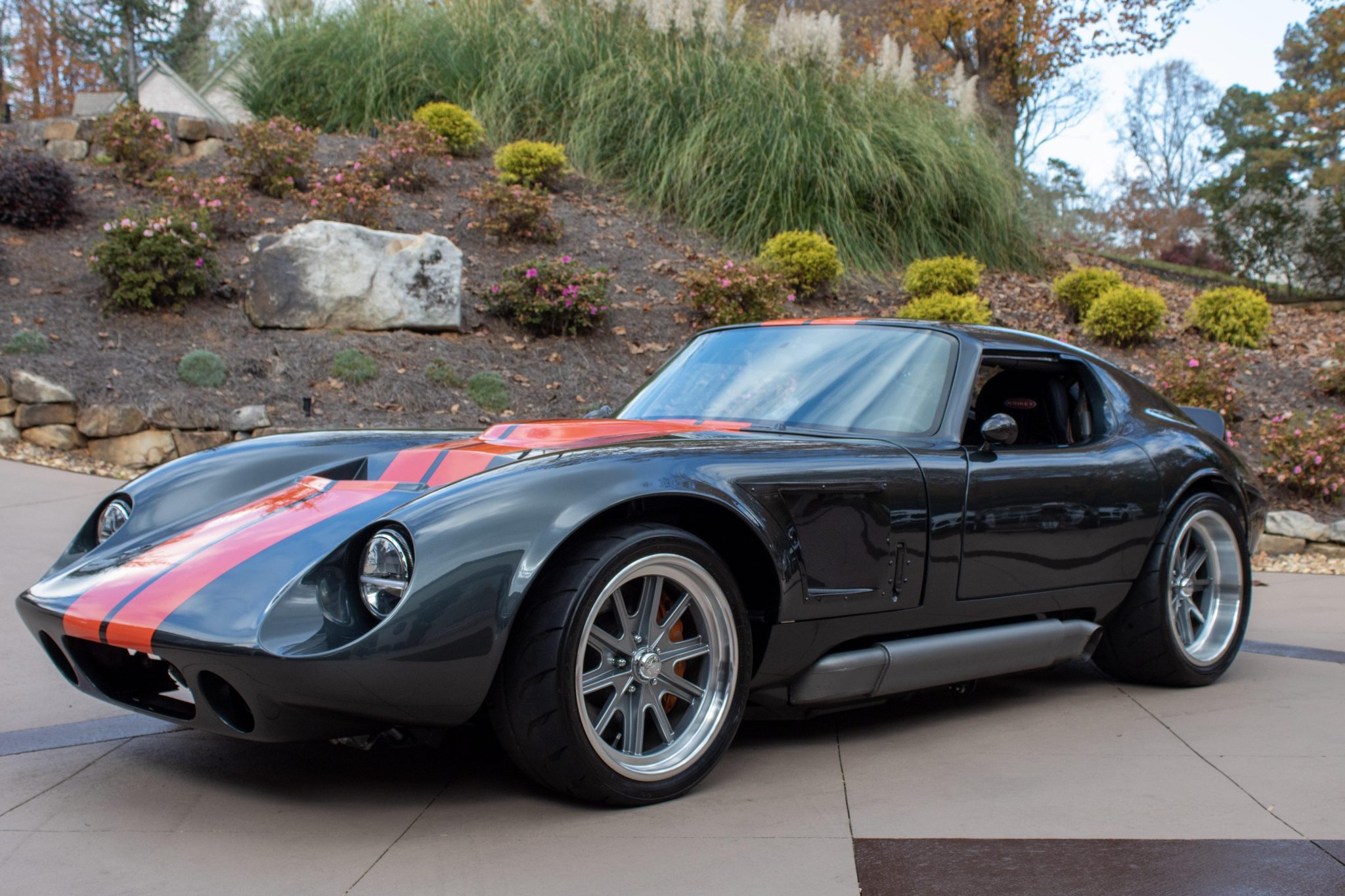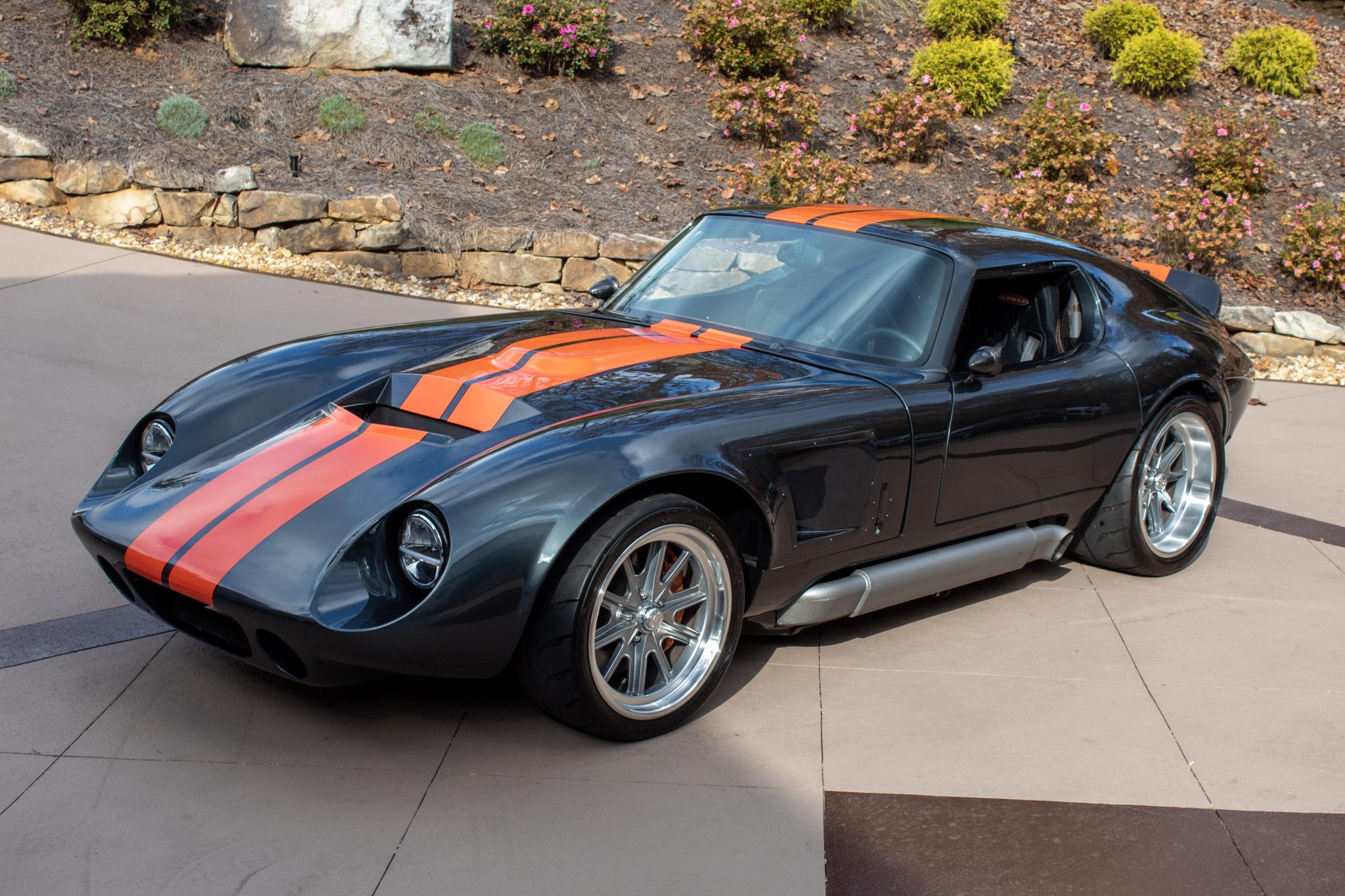 Staggered-width 18″ Halibrand-style alloy wheels are wrapped in Toyo Proxes R888R tires measuring 255/35 up front and 315/30 out back. The car is equipped with power steering, independent rear suspension, Koni height-adjustable coilovers, and four-wheel disc brakes with orange-finished Brembo calipers over 14″ rotors up front.