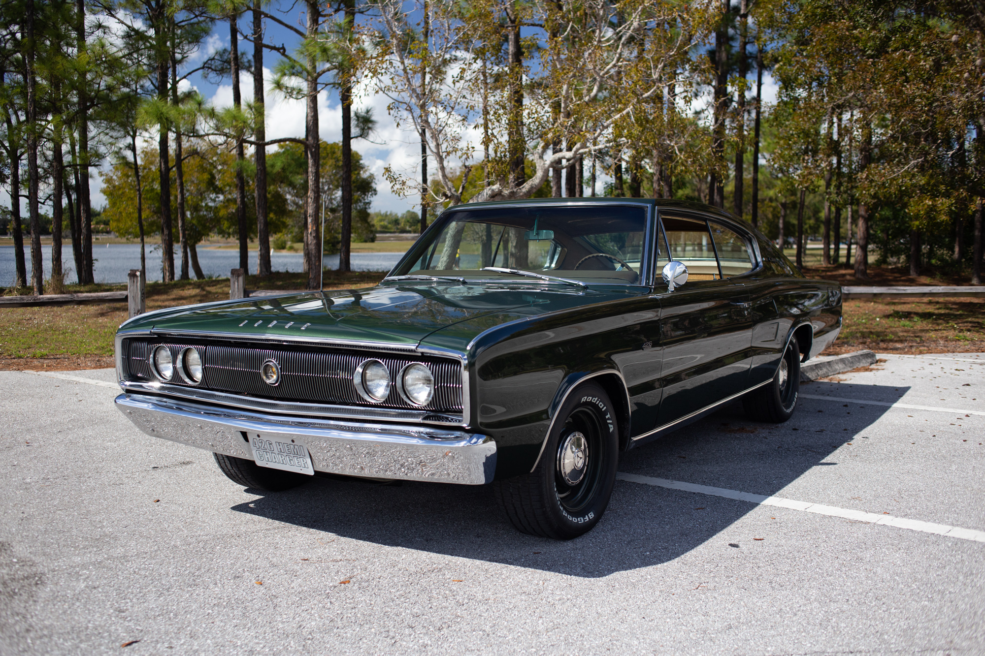 Color-matched 15″ steel wheels wear chrome dog-dish hubcaps and are mounted with 235/60 BFGoodrich Radial T/A tires. Front disc brakes have been installed to complement rear drums.