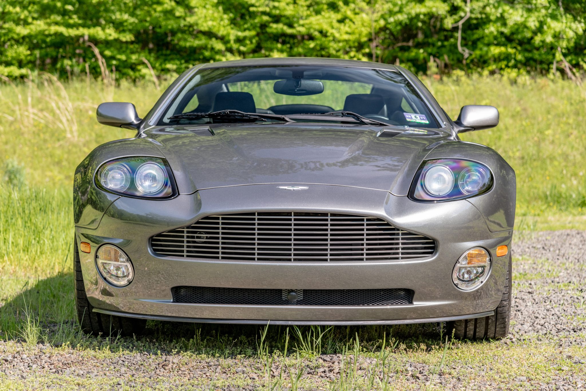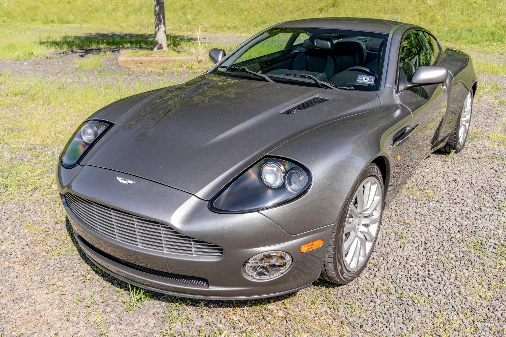 Silver-finished 12-spoke 19″ alloy wheels are mounted with 255/40 front and 285/40 rear Yokohama Advan Sport V105 tires showing 2014 production date codes. The car is equipped with a carbon-fiber front strut tower brace, and braking is handled by cross-drilled rotors and Aston Martin-branded calipers.