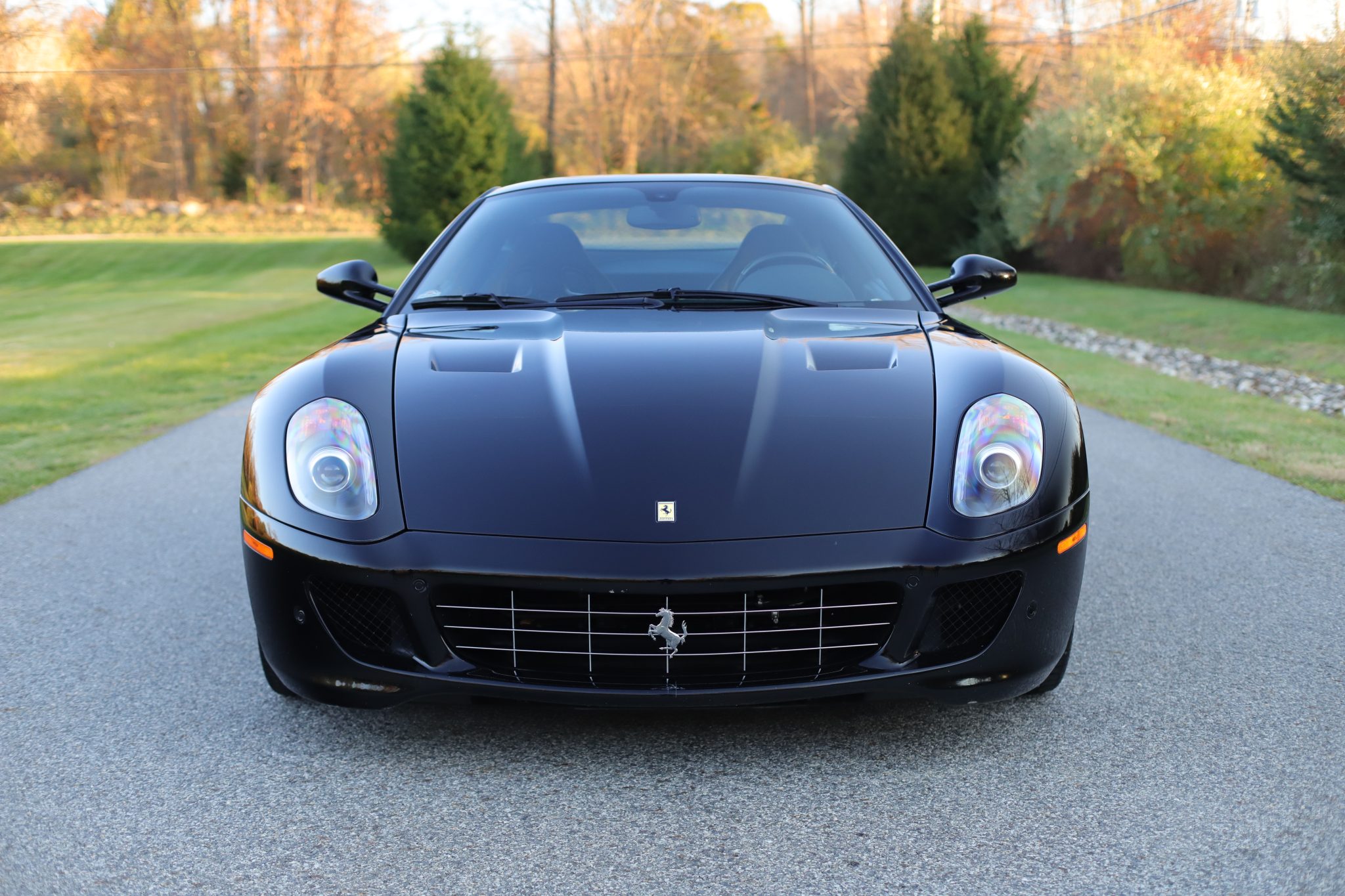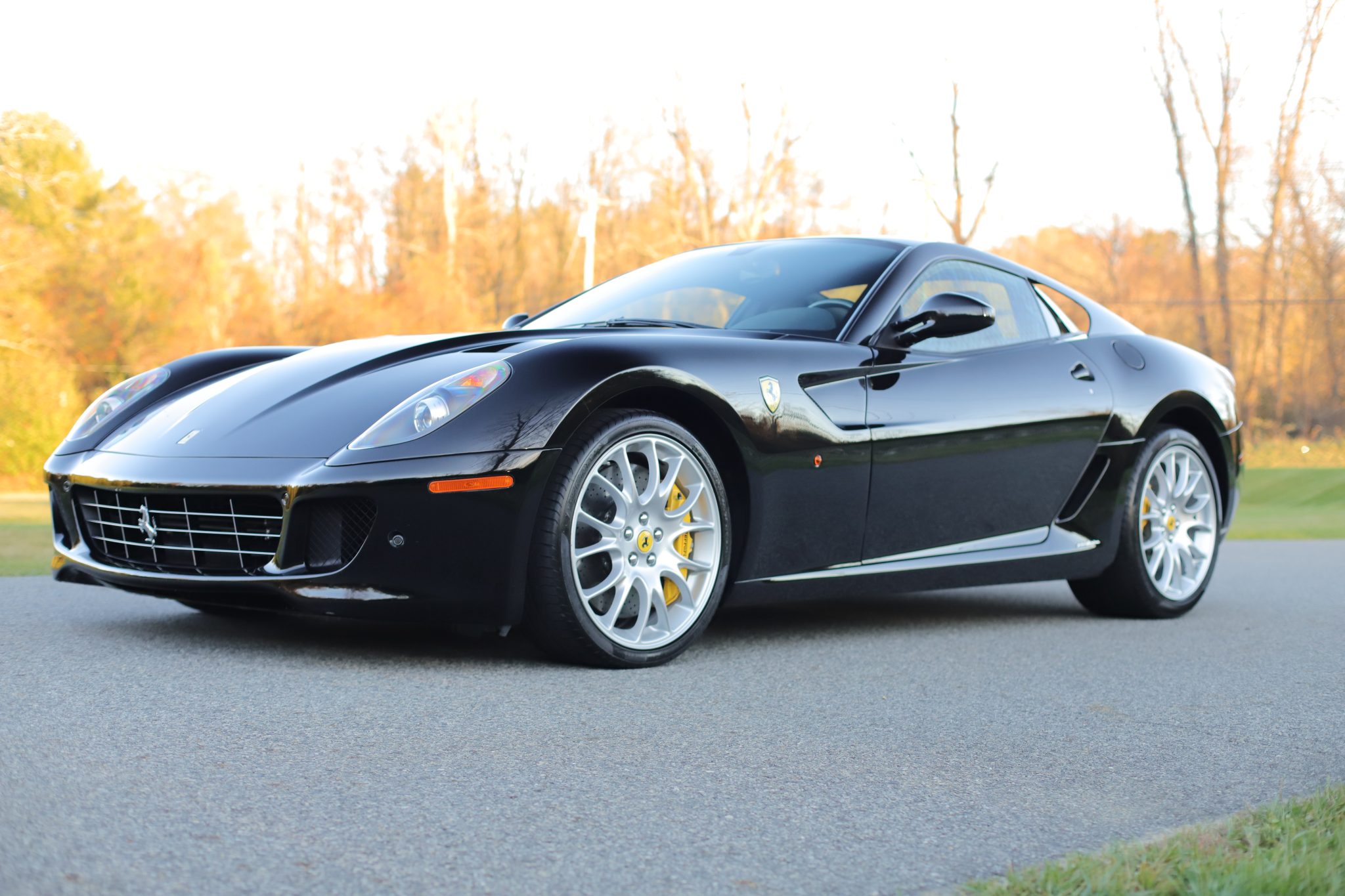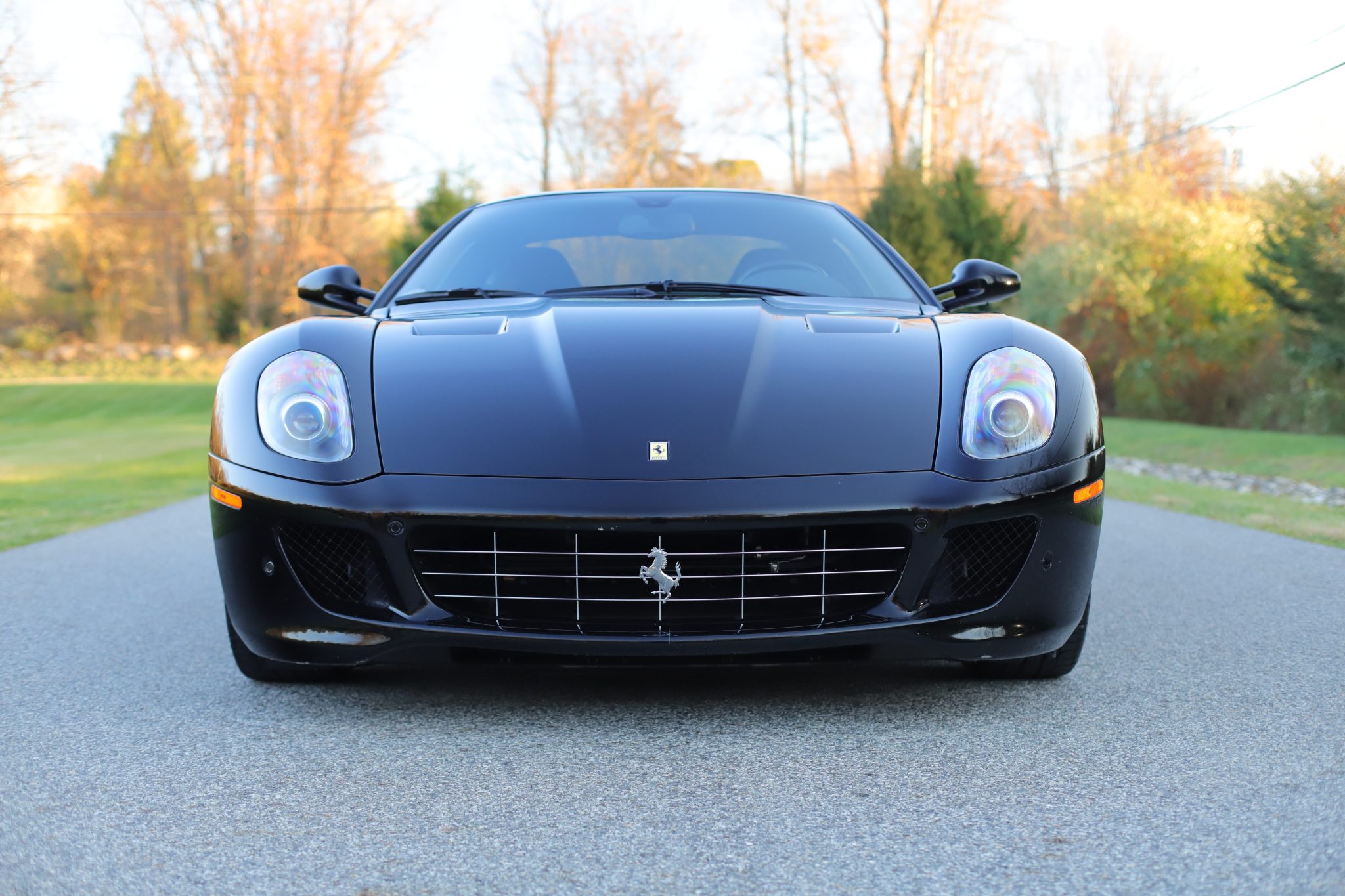 Optional 20″ Monolithic alloy wheels are finished in silver and wear 245/35 front and 305/35 rear Pirelli P Zero tires showing 2013 and 2015 date codes, respectively. The 599 rides on an aluminum chassis with a semi-active magnetorheological suspension system, while stopping power is from cross-drilled carbon-ceramic brake rotors clamped by yellow Ferrari-branded calipers at all four corners.