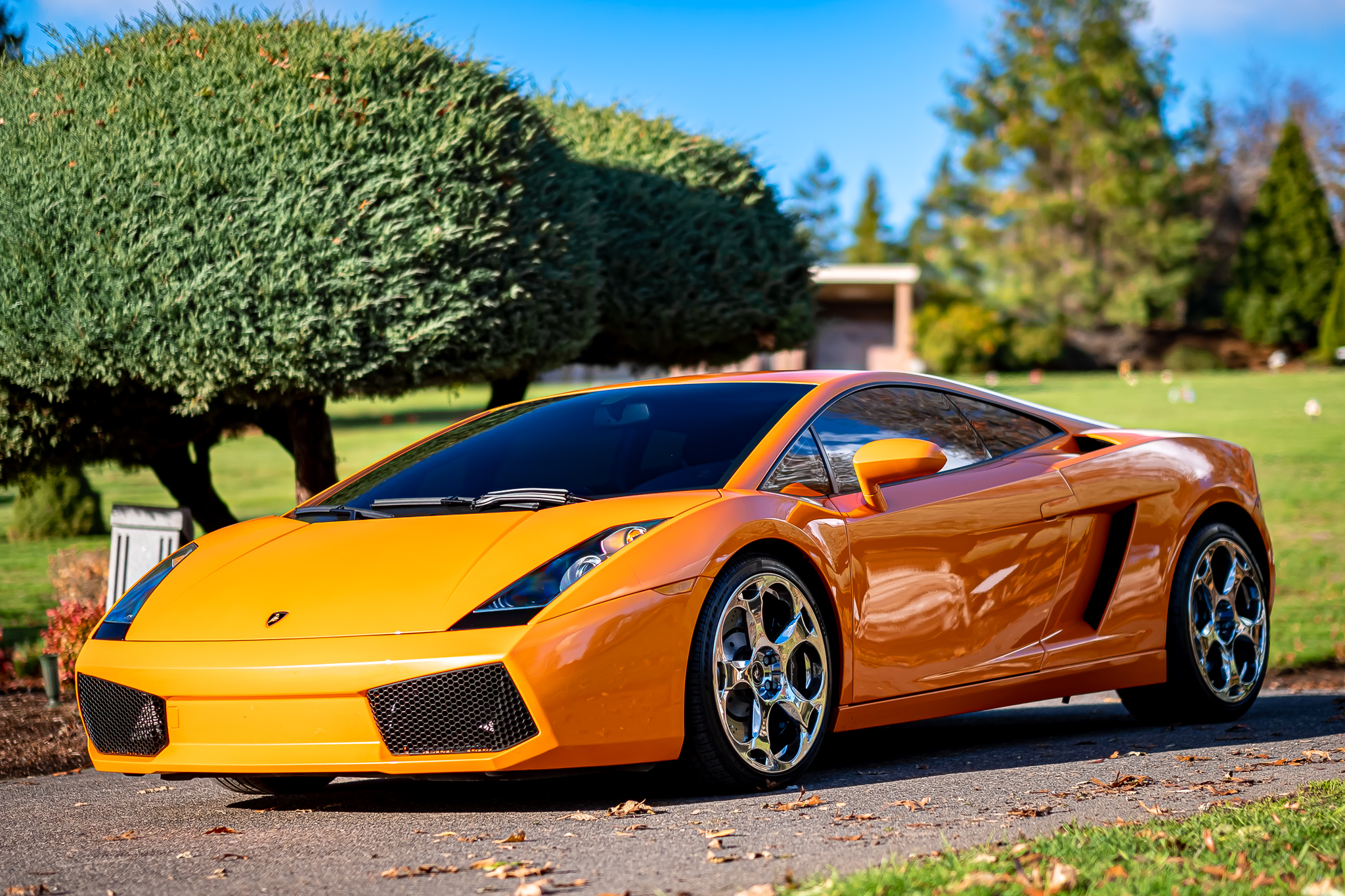 Chrome-finished 19″ Cassiopeia wheels are wrapped in Pirelli P Zero Rosso tires sized 235/35 up front and 295/30 out back. Braking is handled by four-wheel ventilated and cross-drilled discs with black Lamborghini-branded calipers and ABS.