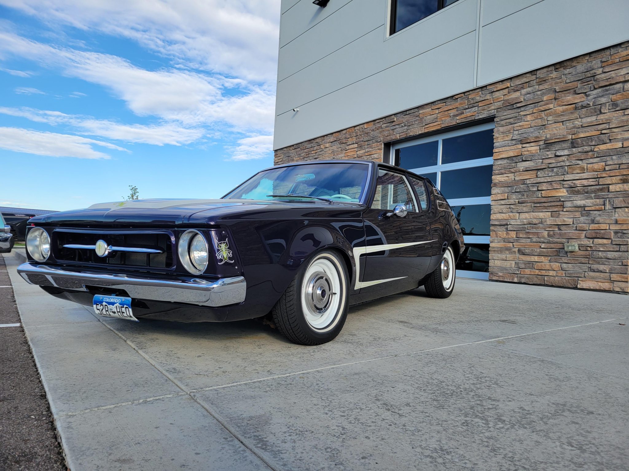 White-finished 14″ steel wheels wear bright center hubcaps and are mounted with 185/70 Uniroyal Tiger Paw whitewall tires showing 2013 date codes. The car is equipped with power steering, and braking is handled by front discs and rear drums. Adjustable Viking Performance coil-over shocks have been installed up front and KYB shocks and removable lowering blocks are installed with the rear leaf-spring suspension.