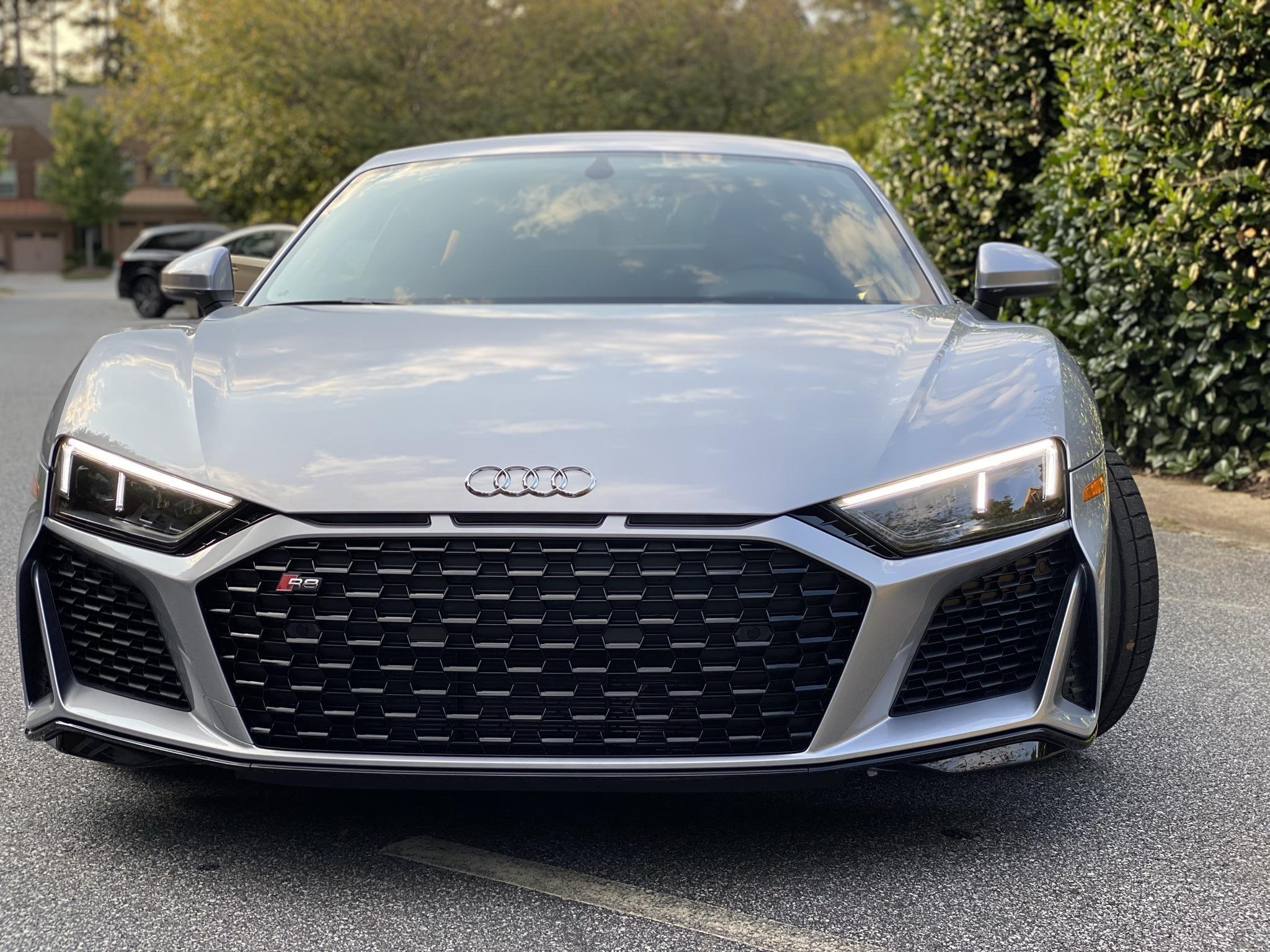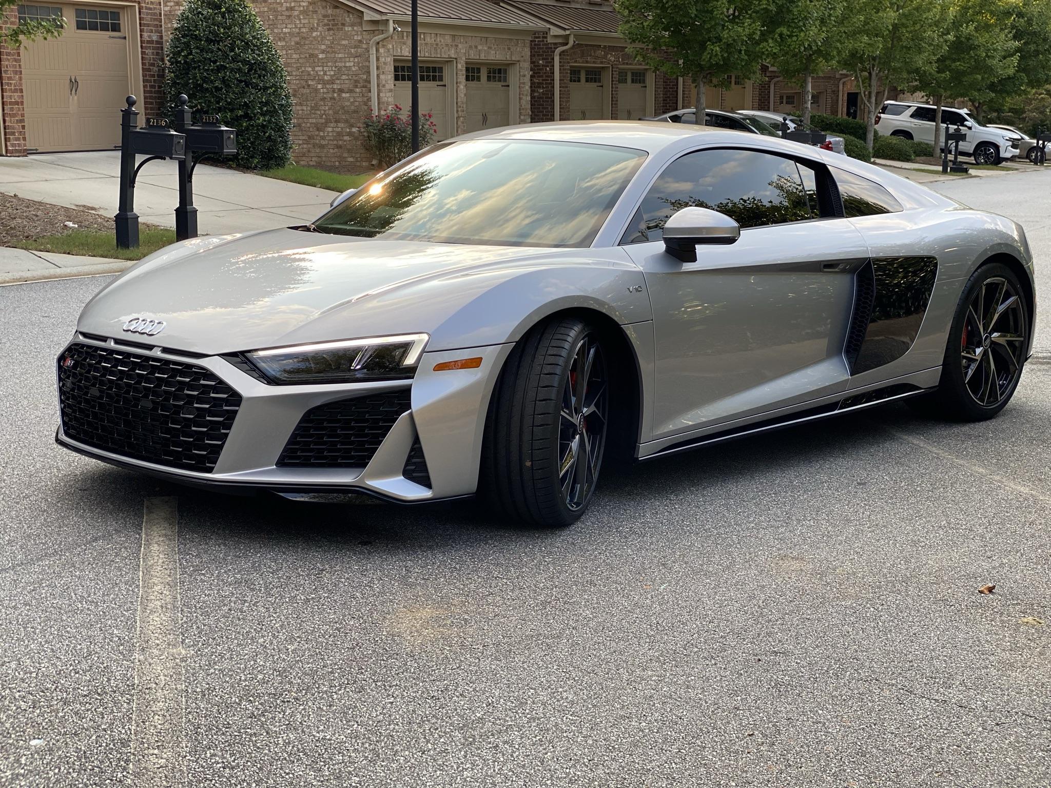Bi-color anthracite-finished 20″ alloy wheels wear staggered-width Michelin Pilot Sport 4s tires. Stopping power is provided by wave-design four-wheel disc brakes fitted with red R8-branded multi-piston calipers.