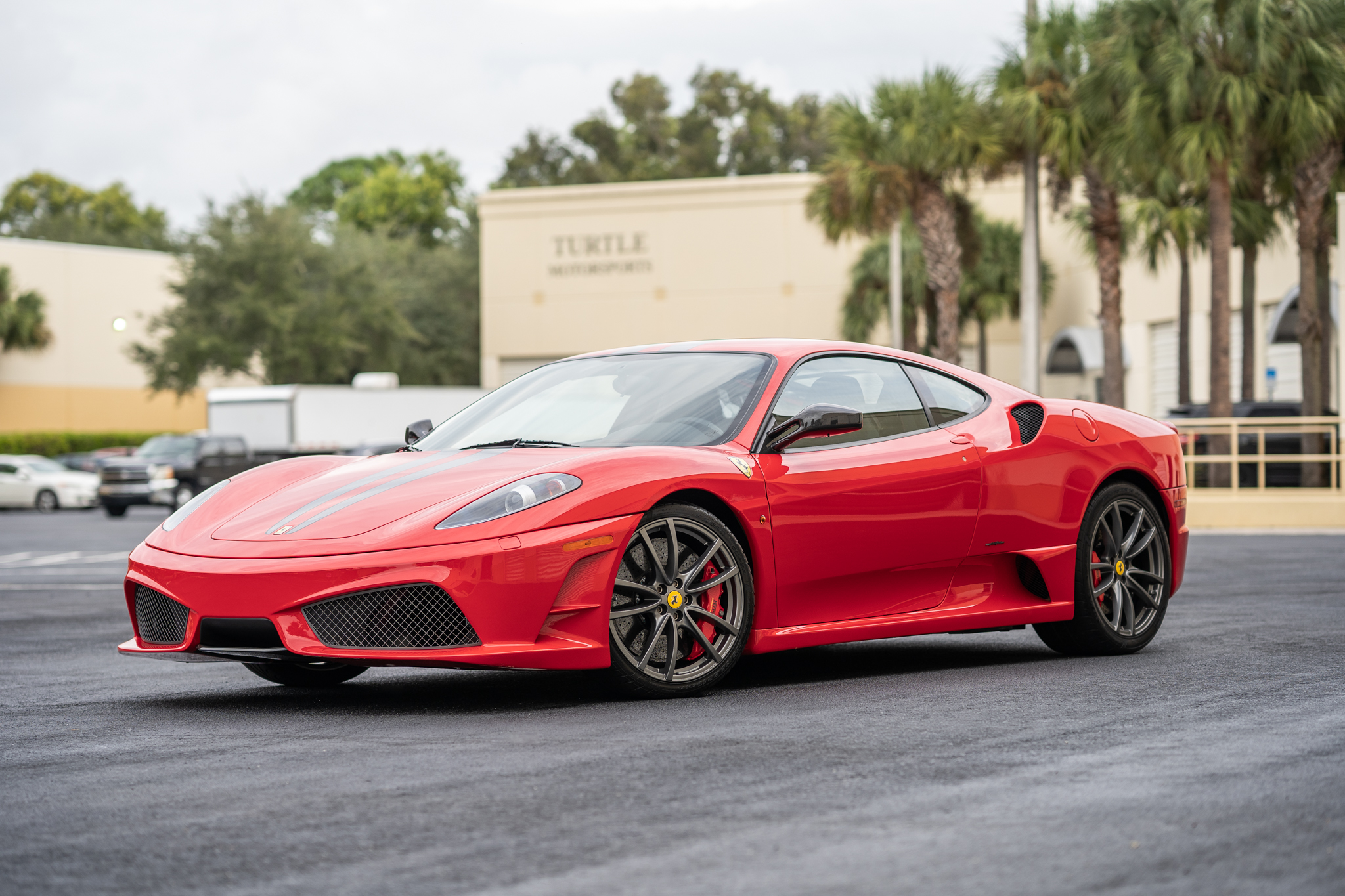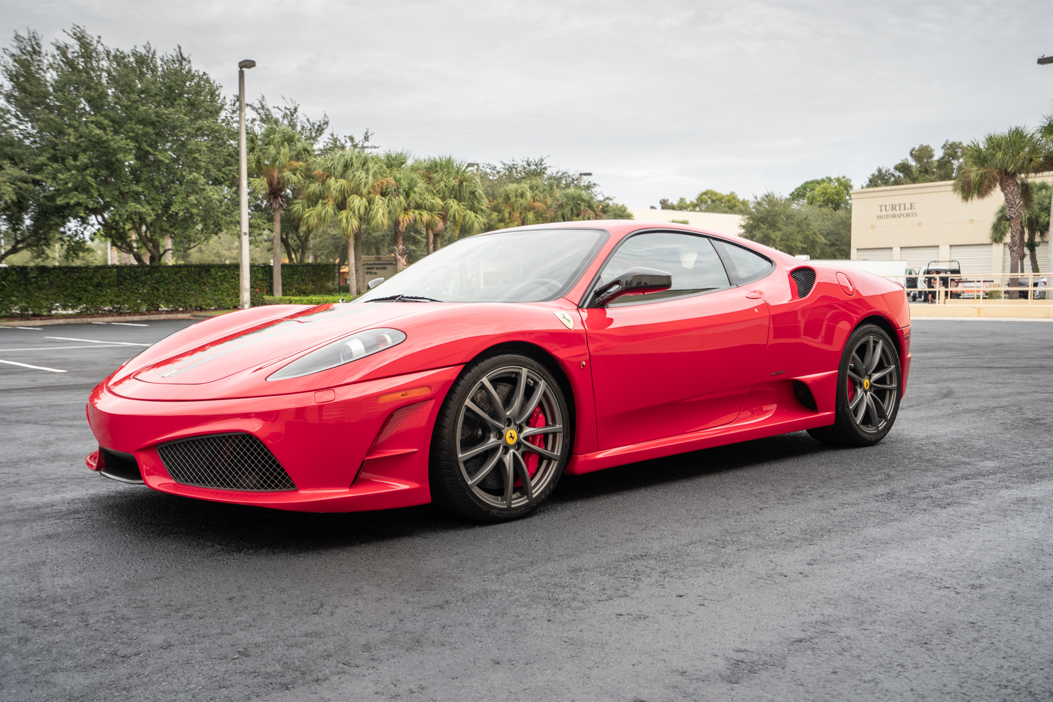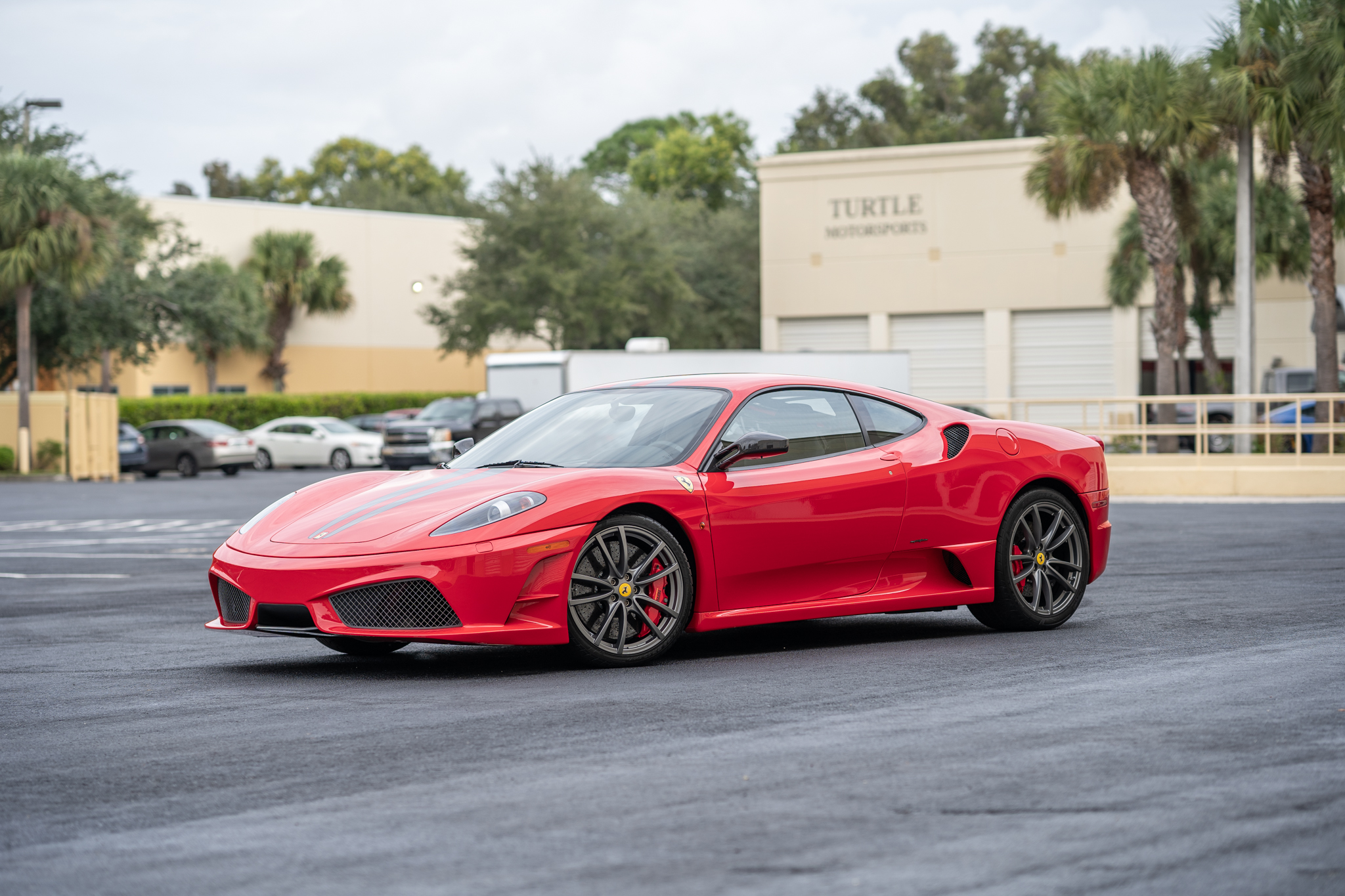 Ten-spoke 19″ alloy wheels are mounted with 235/35 front and 285/35 rear Pirelli P Zero Corsa tires showing 2008 and 2009 date codes, respectively. Optional red-finished brake calipers are fitted over carbon-ceramic rotors.