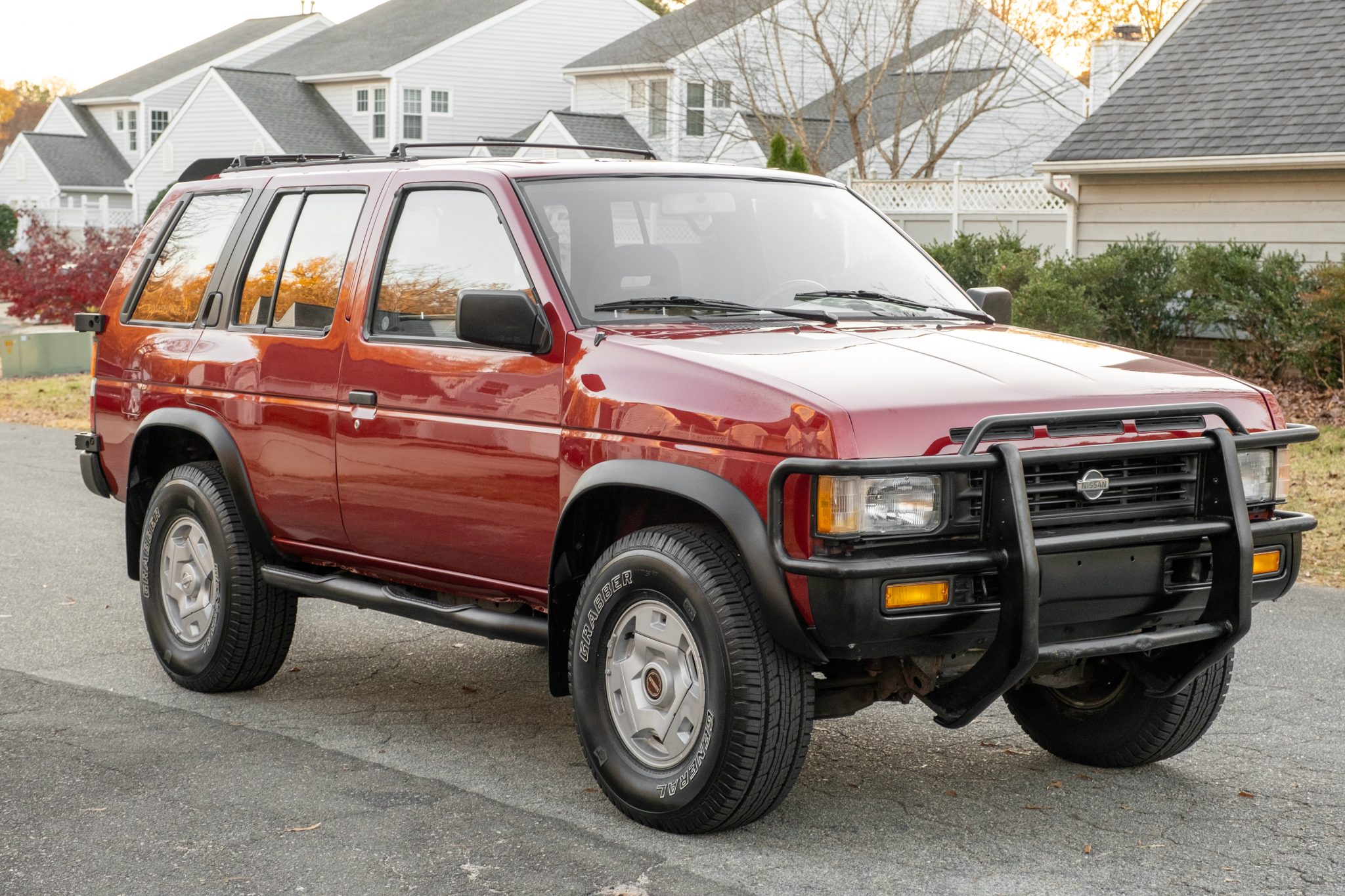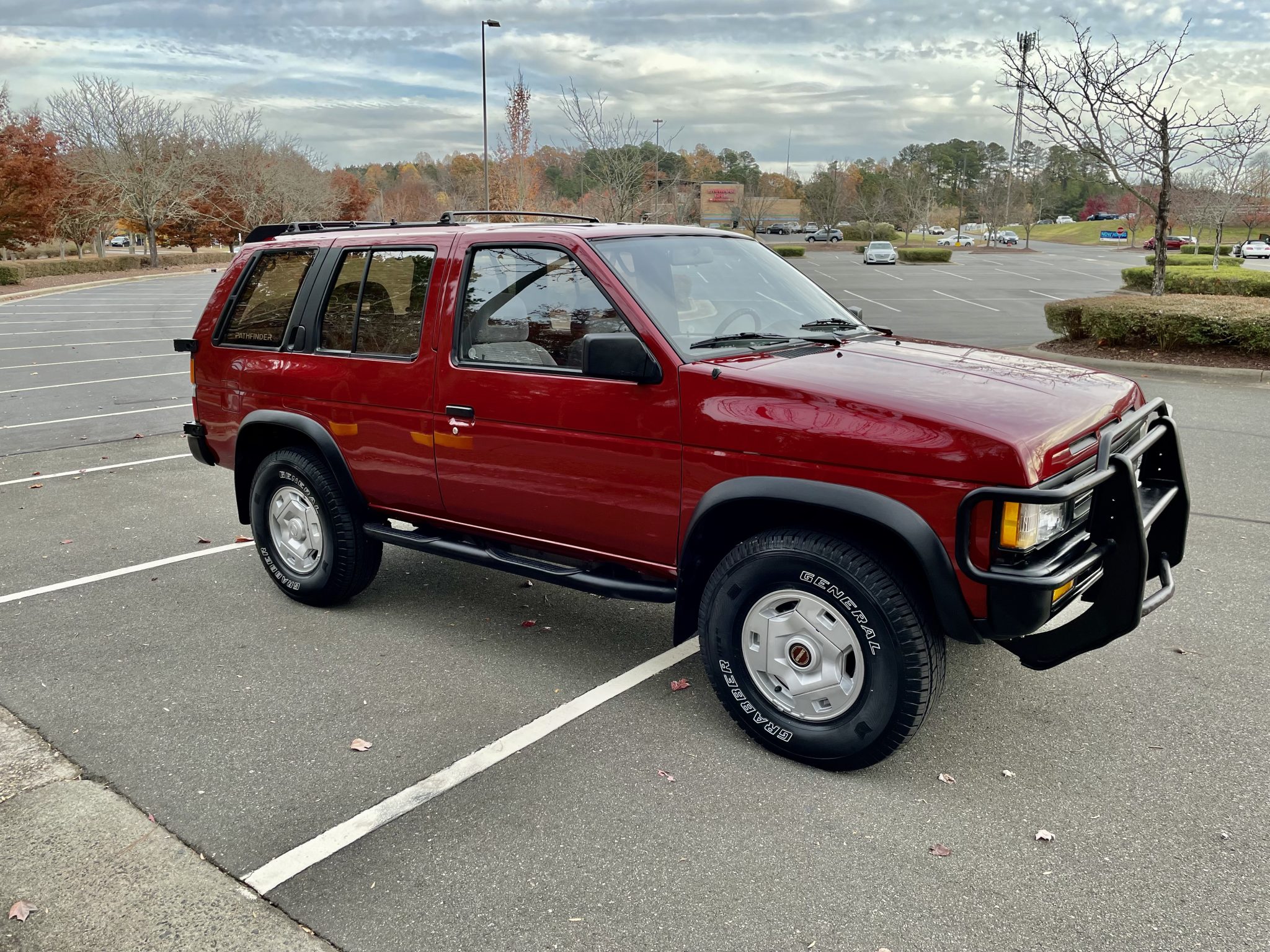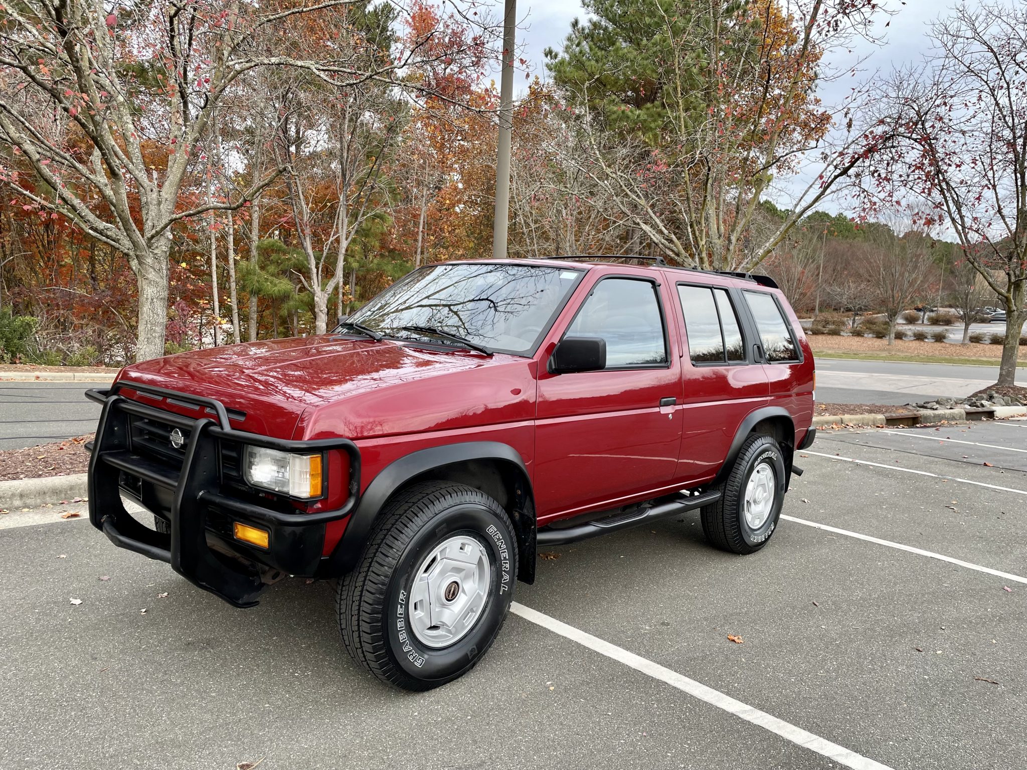 Factory 15″ alloy wheels are mounted with 31×10.50″ General Grabber HTS tires that were installed in November 2021. A spare wheel and tire with a vinyl cover is stored on a rear-mounted swing-out carrier. A 2″ body lift was fitted in November 2021, and the truck is equipped with automatically locking front hubs.