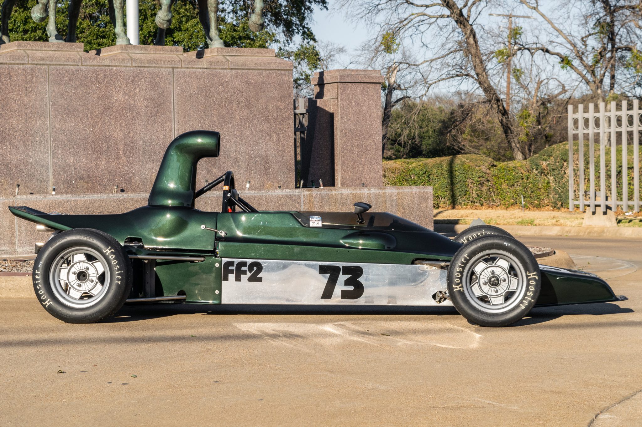 Silver-painted 13″ ATS five-spoke wheels are mounted with 20.5×7.0″ front and 22.5×7.2″ rear Hoosier racing slicks. Braking is provided by four-wheel discs with inboard-mounted rear rotors. The suspension is said to have been nickel plated during prior ownership and is equipped with coilovers at all four corners. Recent work reportedly included a brake fluid change and replacement rear uprights.