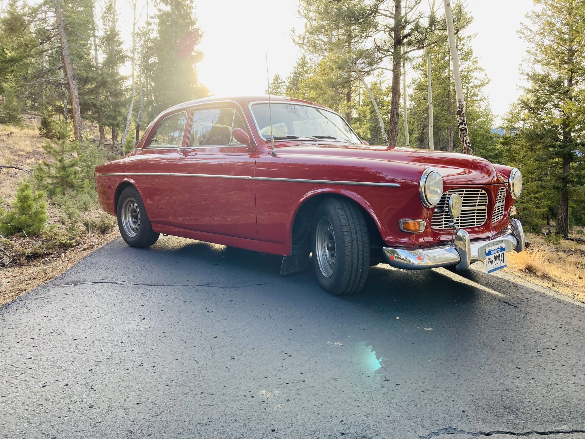Silver 14″ steel wheels were reportedly sourced from a Ford Torino and are mounted with 195/70 Michelin Defender tires that show 2016 date codes. Braking is handled by front discs and rear drums, and the suspension has been modified with Bilstein shock absorbers, IPD front and rear sway bars, and IPD lowering springs. A spare set of OEM Volvo 15” steel wheels, and two additional 14″ Torino wheels are included in the sale.