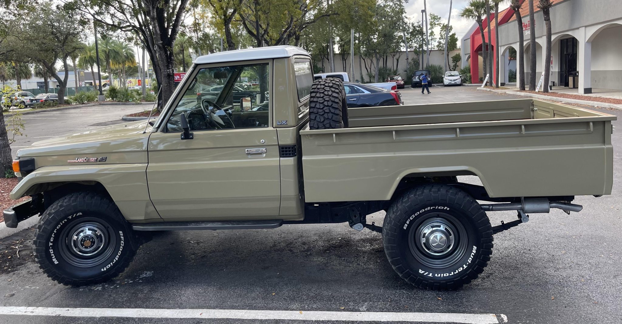 Black-finished steel wheels are accented with silver hubcaps and wear BFGoodrich Mud-Terrain T/A tires, with a matching spare located in the truck bed. Dobinsons suspension components were installed during the refurbishment.