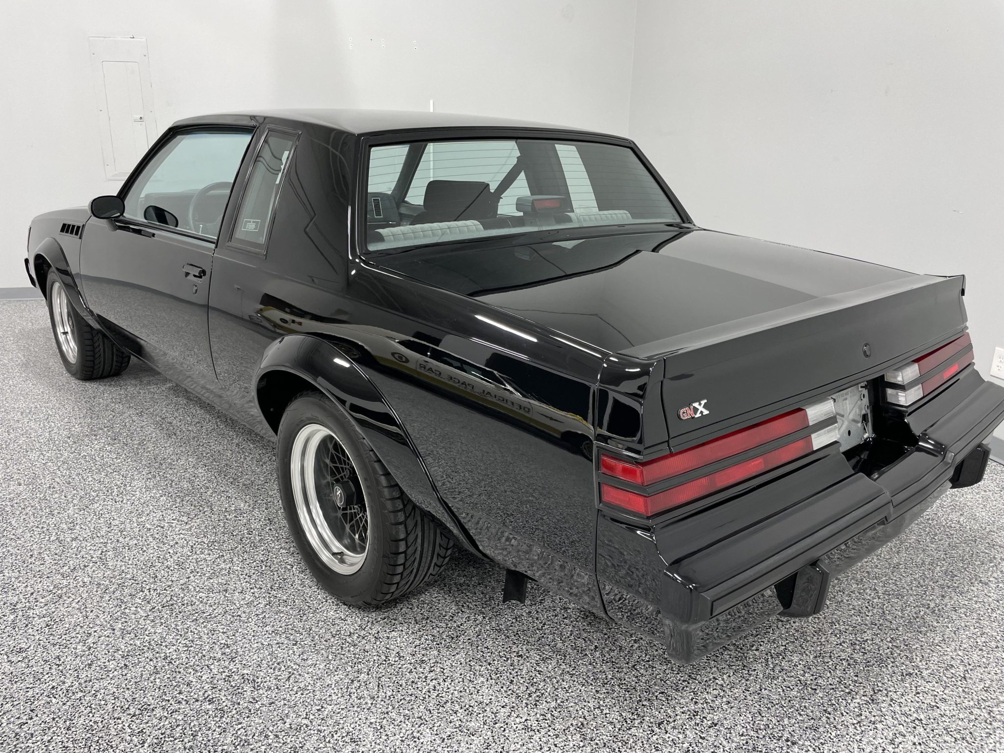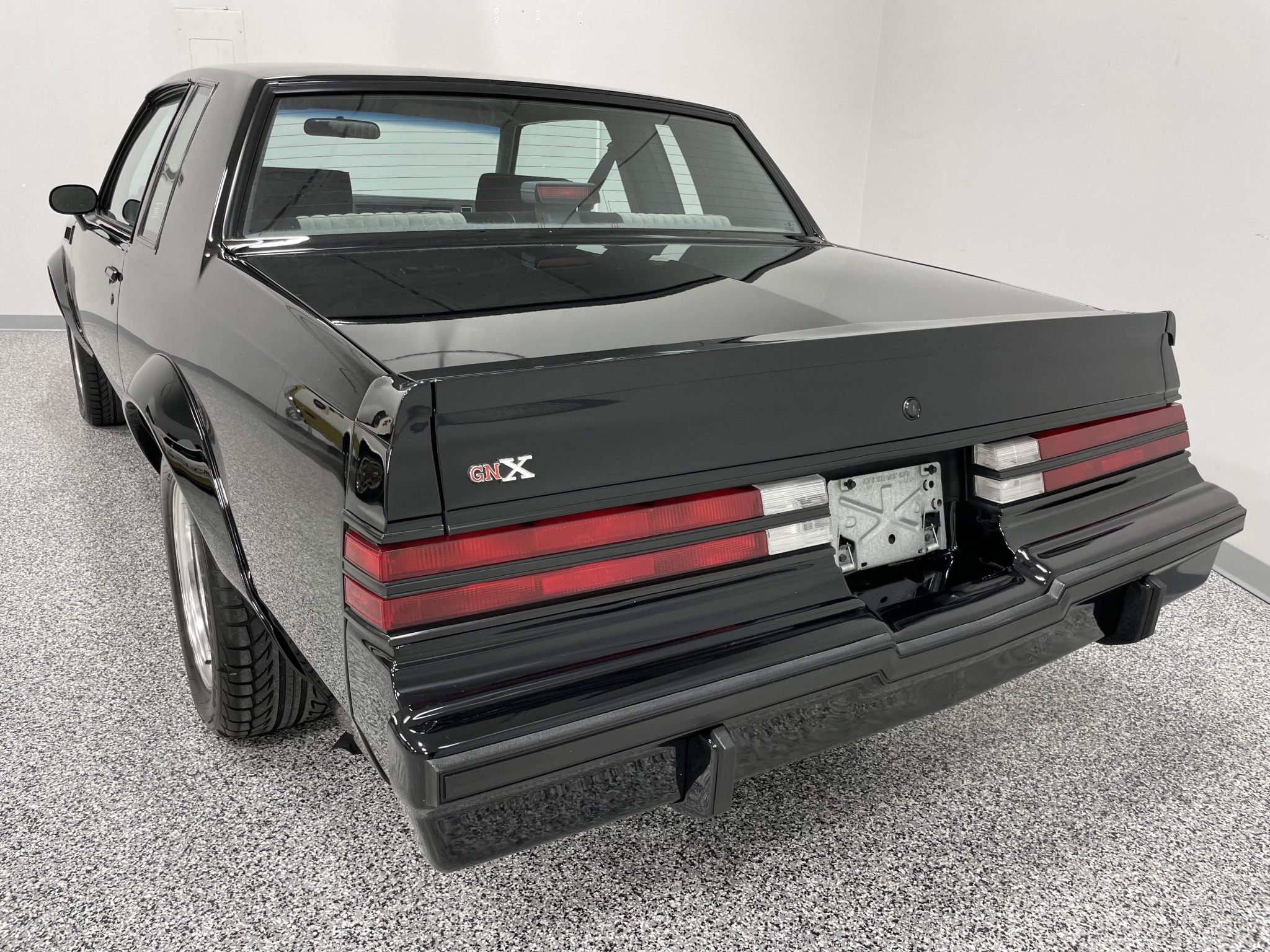 Basketweave 16″ wheels with black centers and polished lips wear GNX-branded center caps and 245/50 front and 255/50 rear BFGoodrich g-Force Sport Comp-2 tires that show 2019 date codes. A performance rear suspension was fitted from the factory as part of the GNX package, and braking is handled by power-assisted front discs and rear drums.