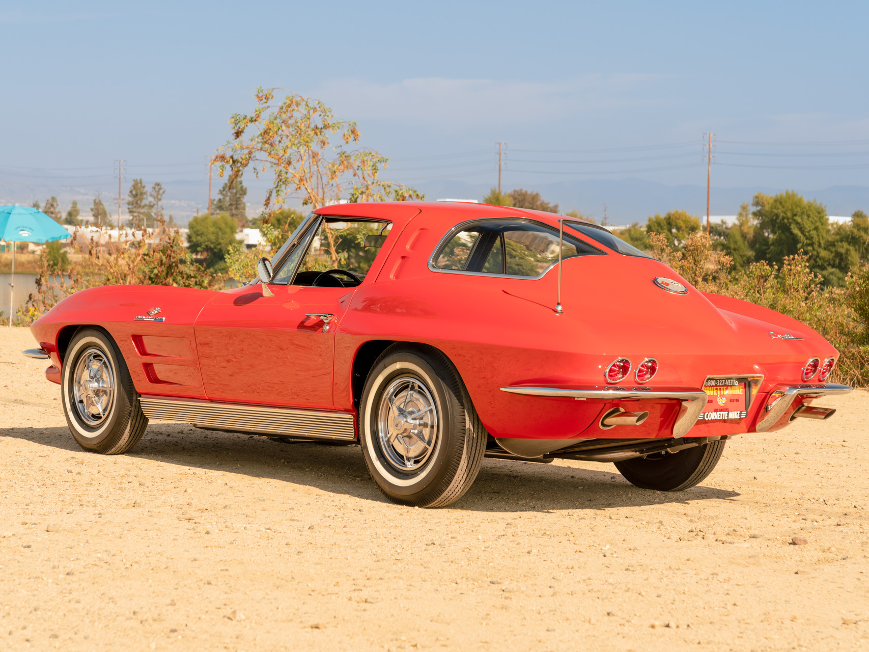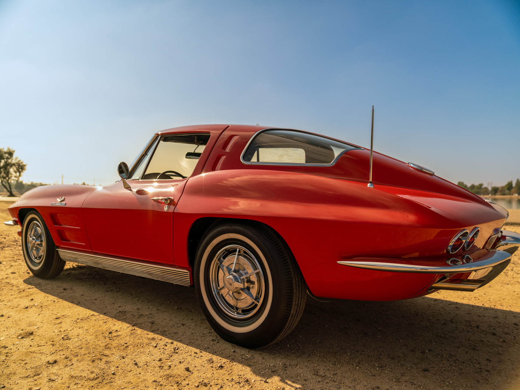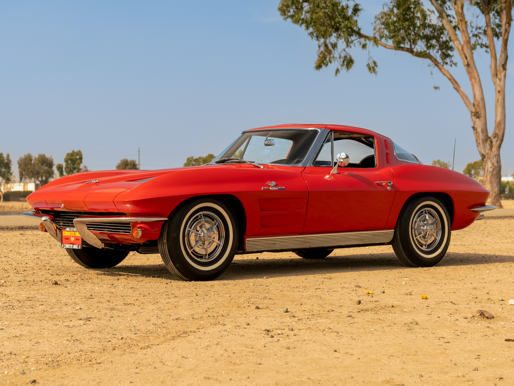 This example is equipped with 15″ steel wheels wearing wheel covers and vintage-look whitewall tires. The C2 was the first Corvette to offer fully independent suspension, with upper and lower control arms at the front and a three-link setup with a transverse leaf spring in the rear.
