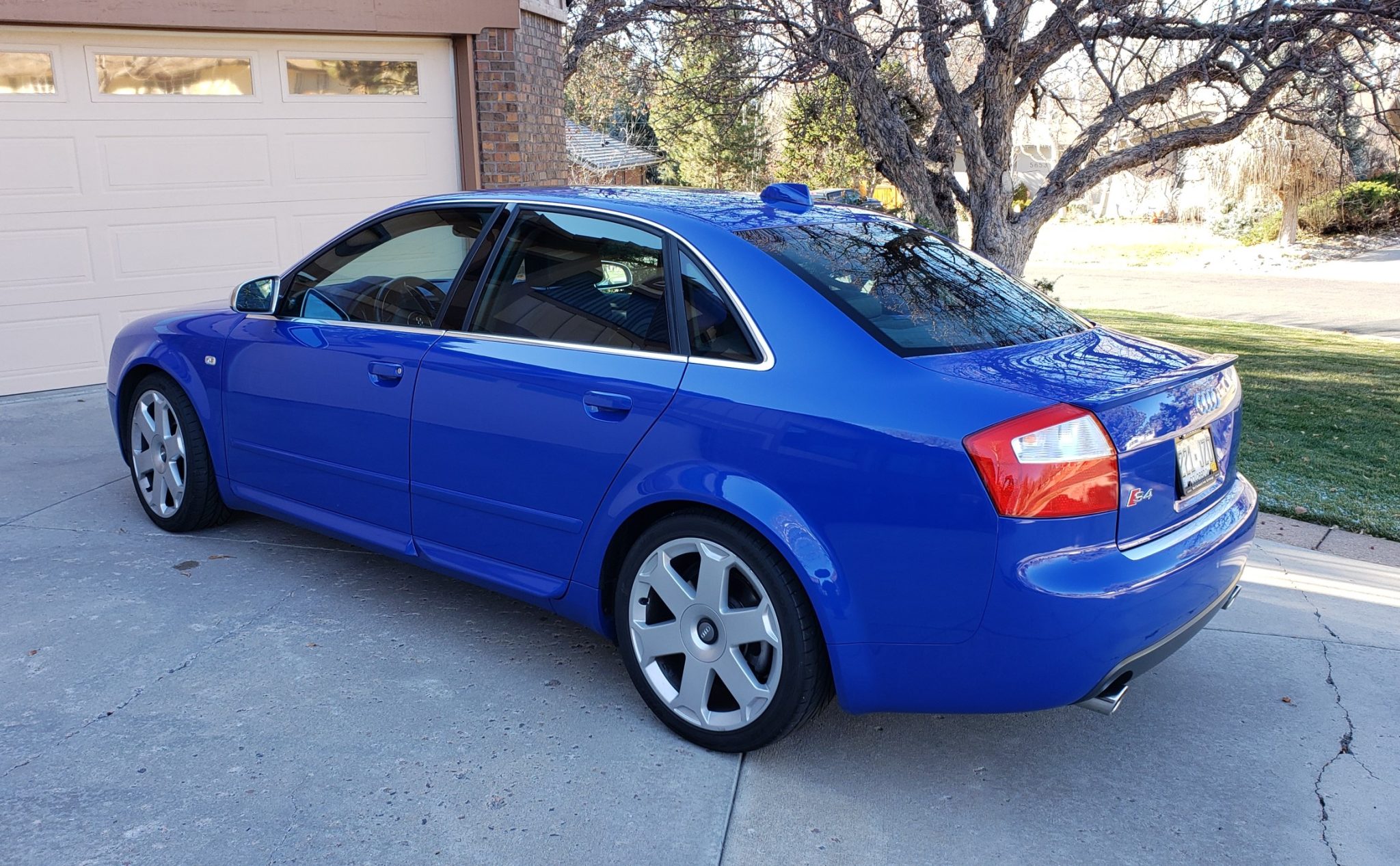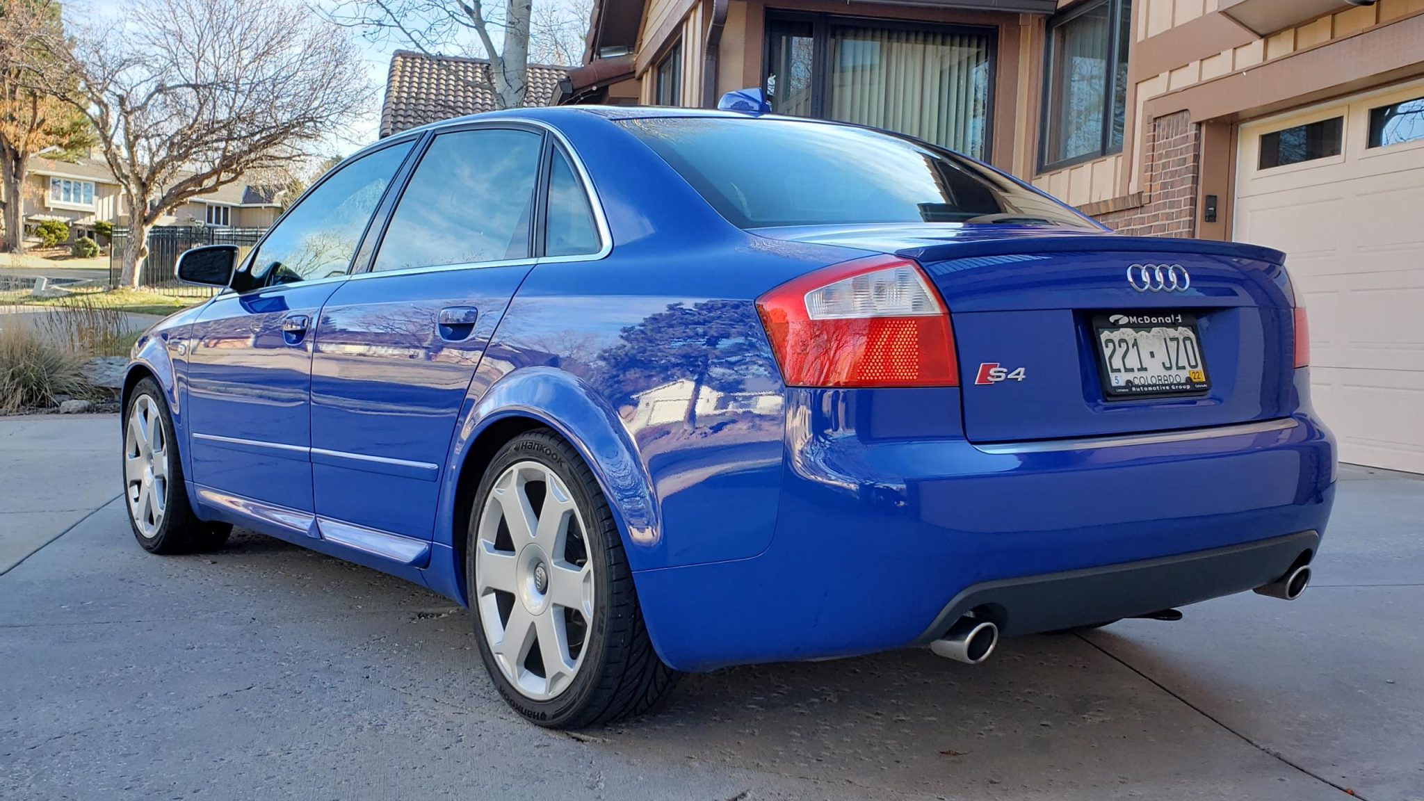 Factory 18″ Avus wheels wear 235/40 Hankook Ventus V12 Evo tires. The seller notes curb damage on some of the wheels. The S4 featured a lowered ride height compared to the contemporary A4, and the four-wheel disc brakes featured larger calipers and rotors.