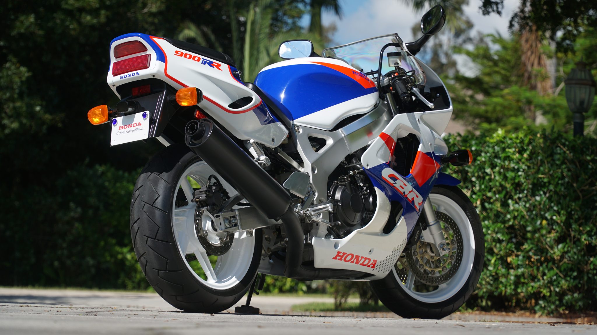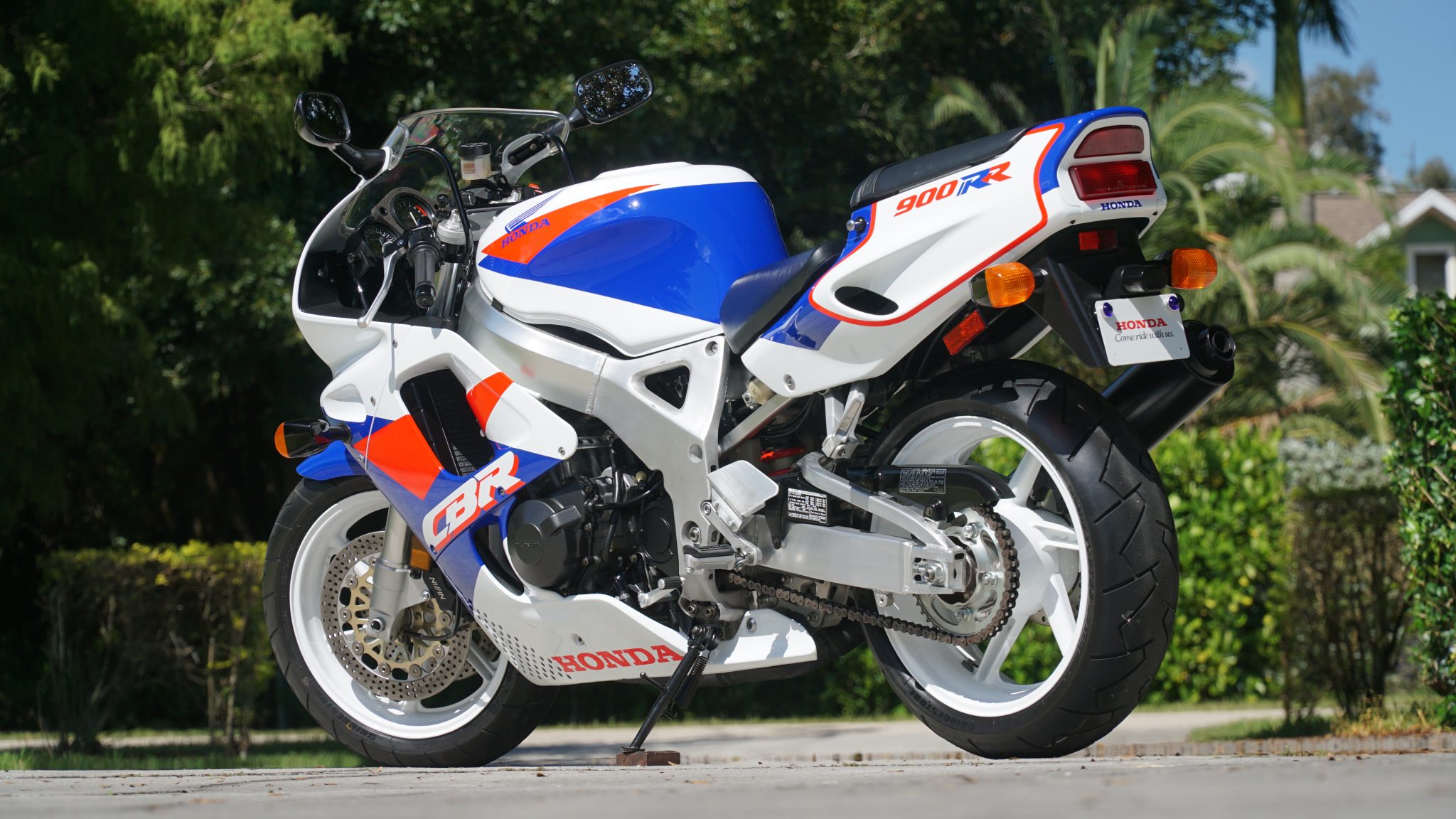 Six-spoke alloy wheels measure 16″ up front and 17″ out back and wear Bridgestone Battlax BT65 tires. Braking is provided by dual discs with four-piston Nissin calipers up front and a disc with a single-piston caliper at the rear. Suspension consists of a Showa cartridge-type front fork and a Pro-Link rear coilover assembly, with adjustments for compression, rebound, and spring preload.