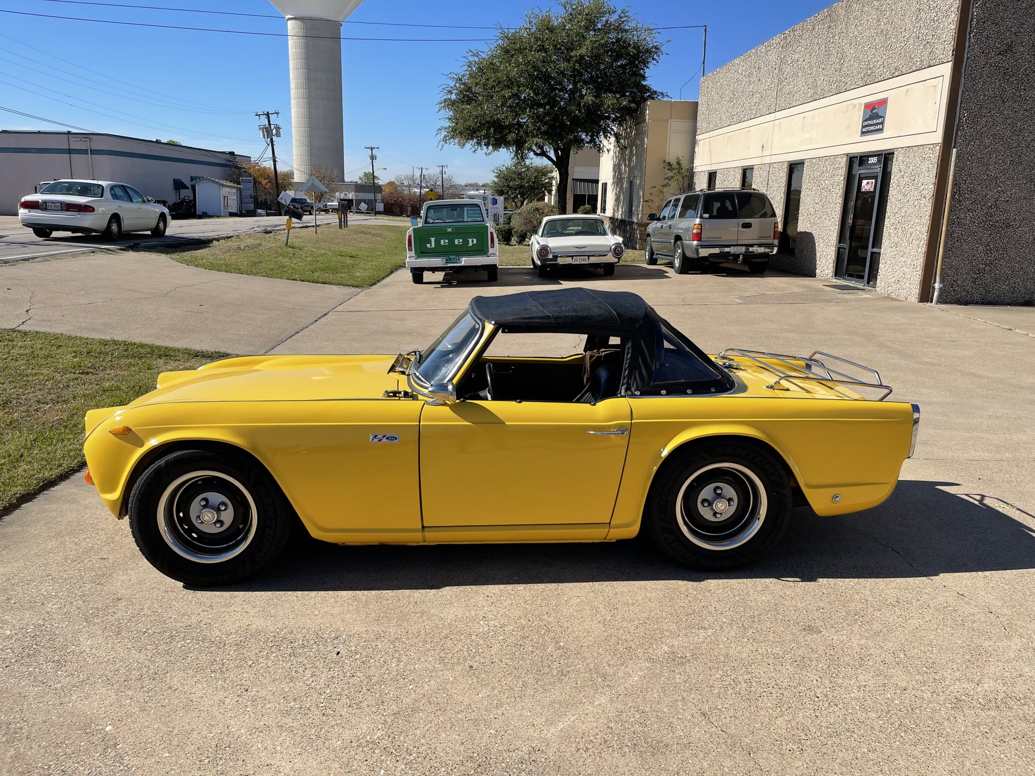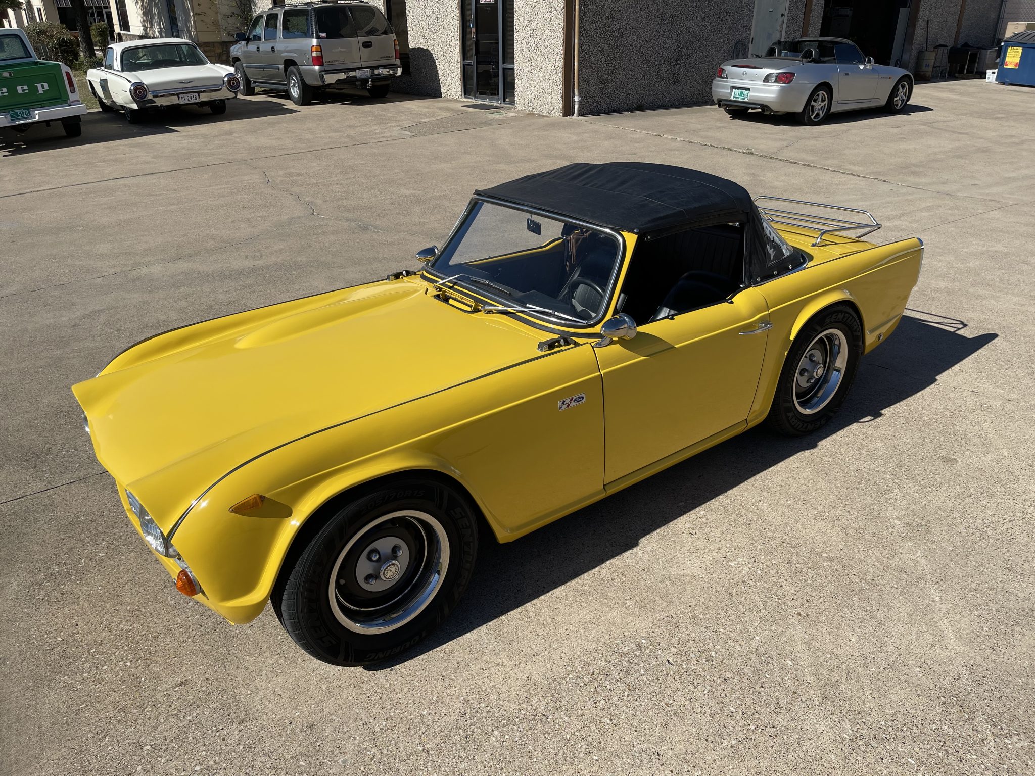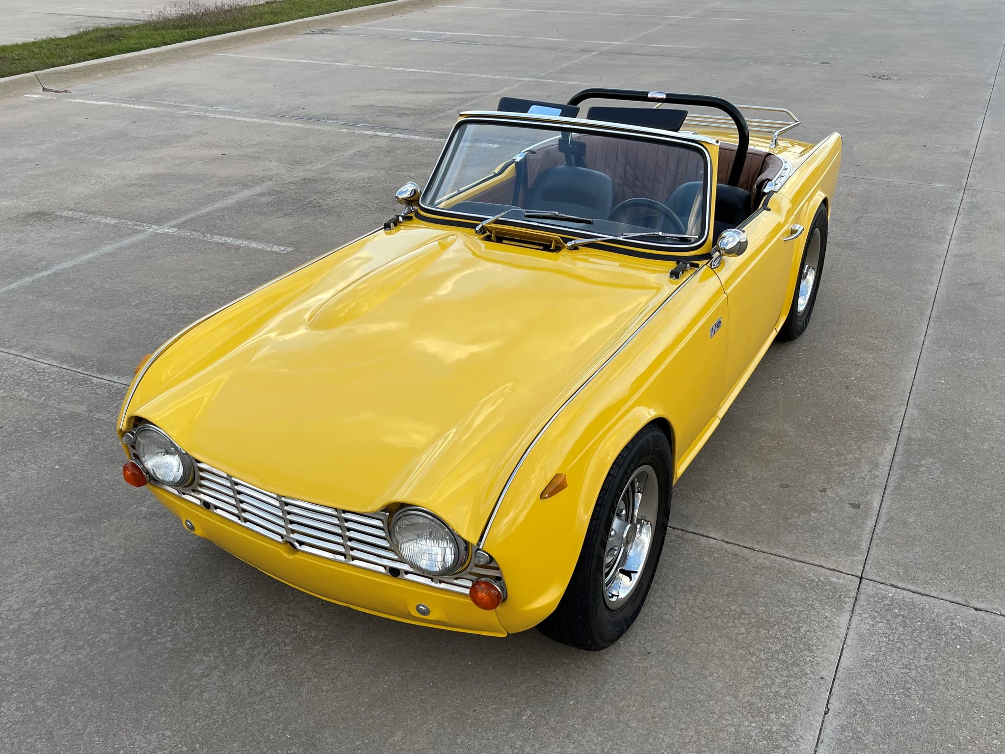 Steel 15″ wheels sourced from a Triumph TR6 wear polished trim rings and are wrapped in 205/70 Sentury Touring tires. The car is equipped with a front sway bar, aftermarket coilover suspension, and a modified shock tower brace.