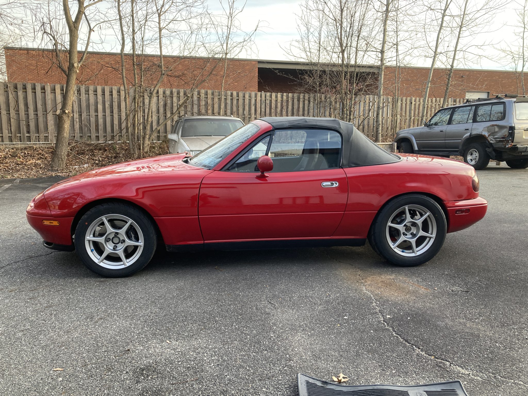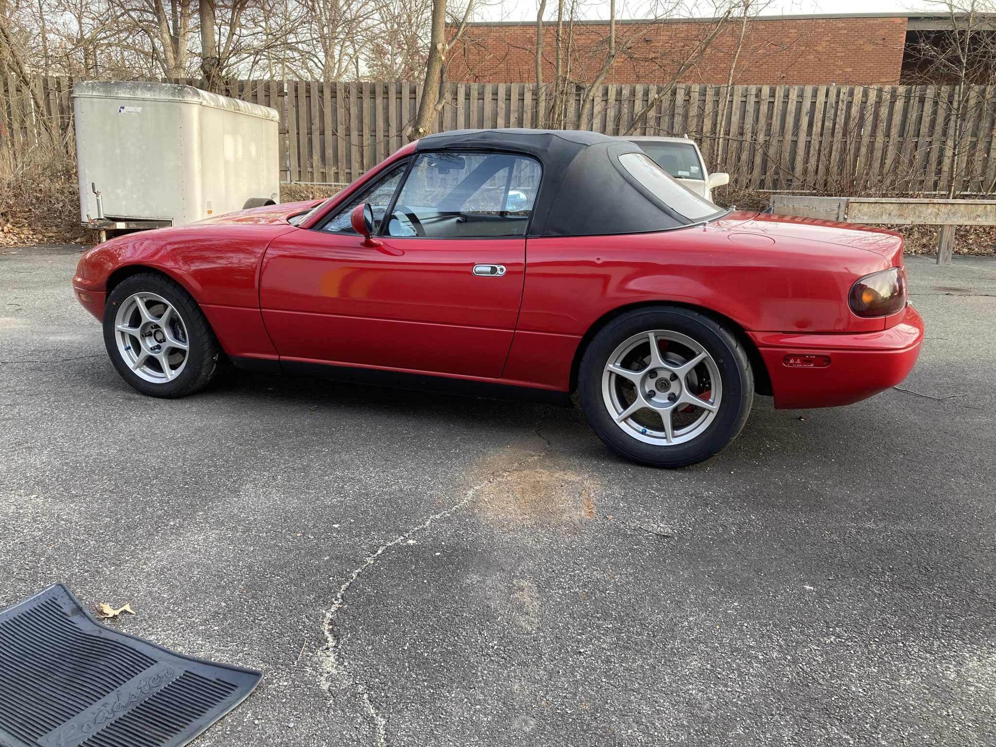 Silver-finished 15″ Kosei K1 wheels are mounted with 225/45 Hankook Ventus RS4 rubber up front and 225/50 Toyo Proxes R888R tires out back. The fully independent suspension has been fitted with a Flyin’ Miata V8 front sway bar and V-Maxx coilovers, and the car is also equipped with Wilwood front calipers, Boss Frog fender braces, and Flyin’ Miata aluminum lug nuts.