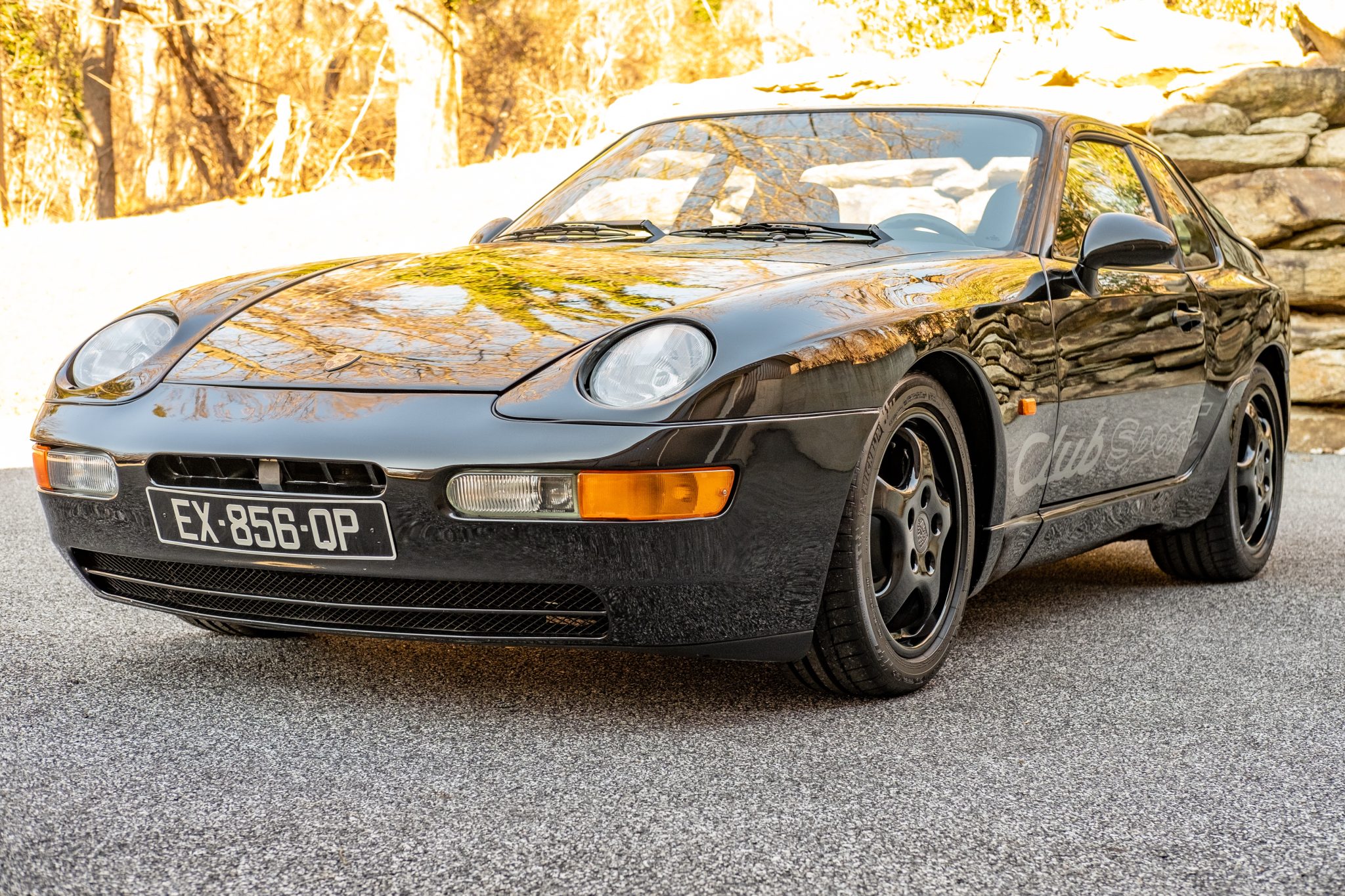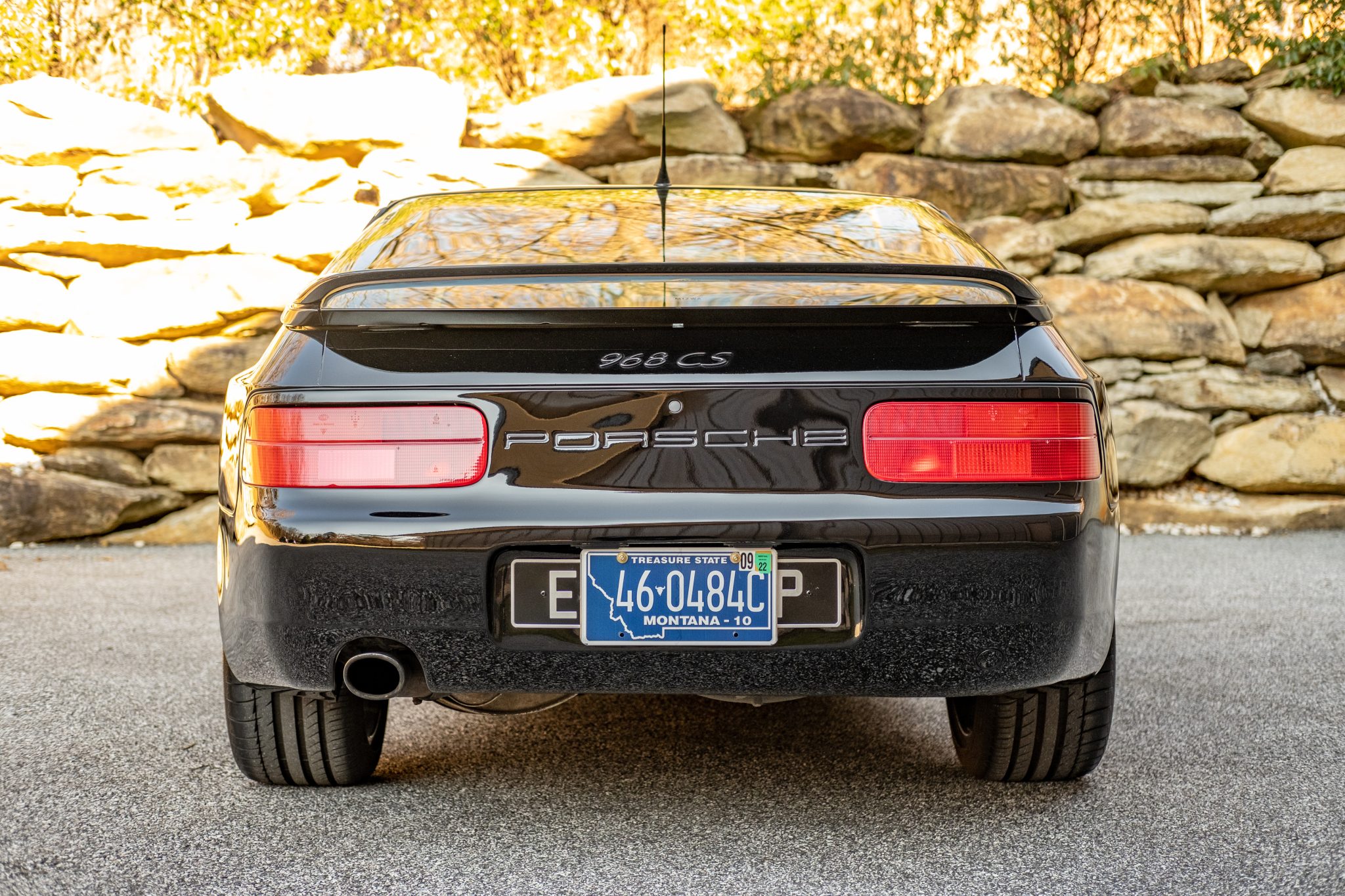 Black 17″ Cup 1 alloy wheels are mounted with 225/45 and 255/40 Michelin Pilot Sport N3 tires that show 2019 date codes. The Clubsport models featured stiffer suspension with a 20mm-lower ride height when compared to the standard 968. Stopping power is provided by black Porsche-branded calipers over cross-drilled and ventilated rotors at all four corners. Service performed in September 2019 involved a brake fluid flush and replacement of the brake pads, rotors, and front upper strut mounts. A peeling finish is noted on the brake calipers.