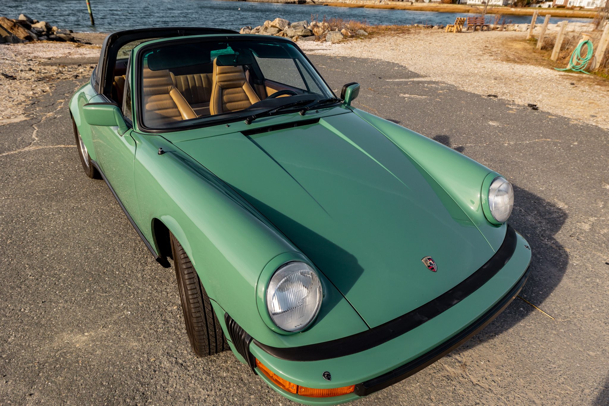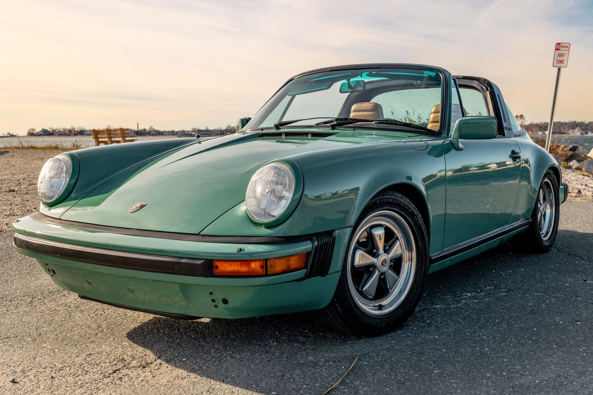 Polished 16″ Fuchs wheels wear center caps with full-color crests. Dunlop Signature HP tires are mounted up front with Dunlop Sport Signature tires out back. The car came from the factory with sport suspension, and the shocks and struts were replaced with Bilstein units by the previous owner. The front and rear wheel bearings were replaced in February 2021.