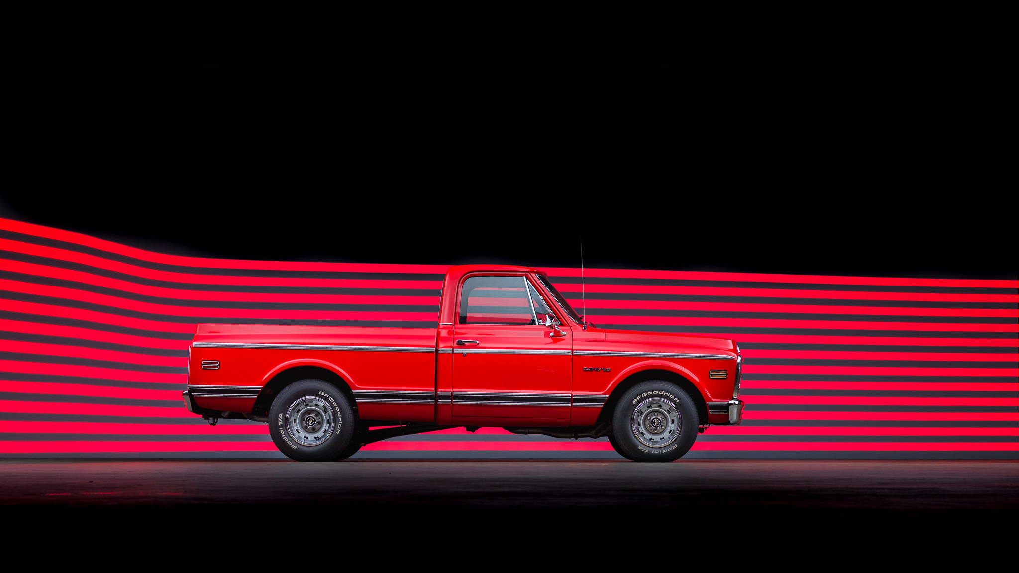 Steel 15″ Rally wheels feature wear 255/70 BFGoodrich Radial T/A tires. The truck is equipped with rack and pinion steering, tubular A-arms, coil springs, Bilstein shocks, and four-wheel disc brakes with drilled slotted rotors.