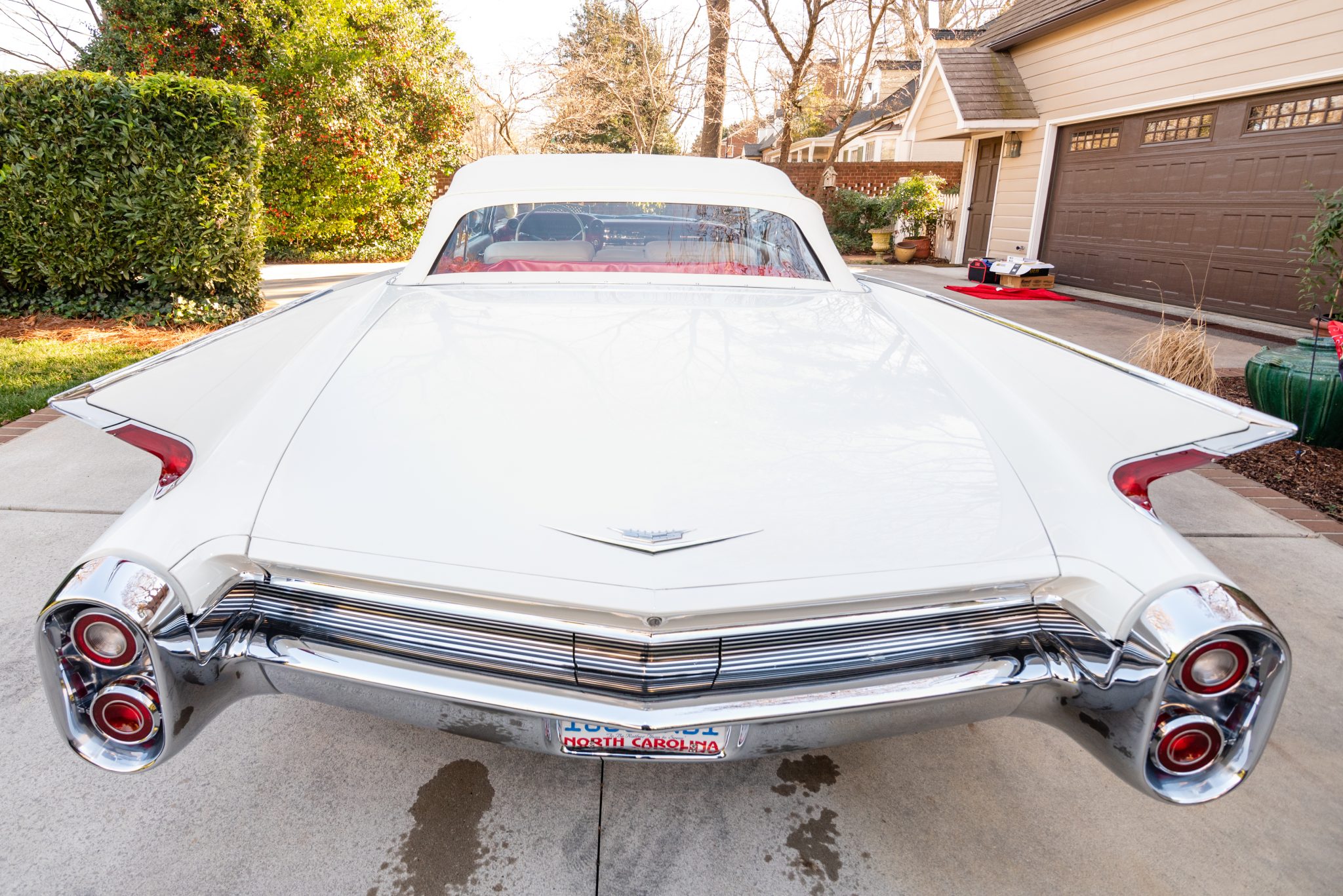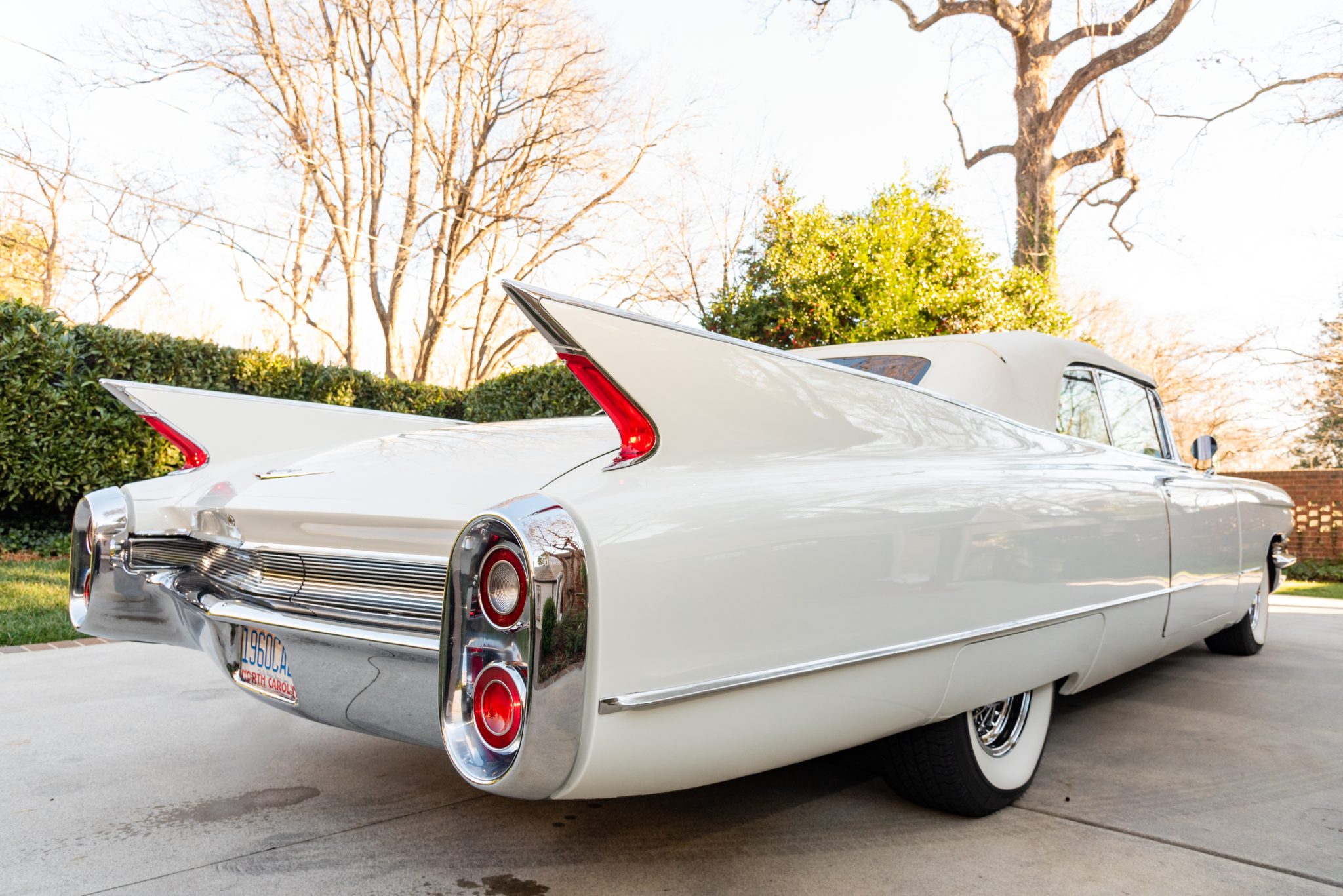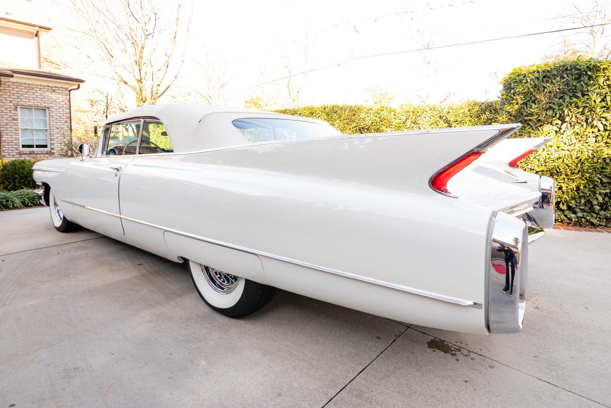 Chrome 15″ wire wheels wear Cadillac crest center caps and are mounted with 235/75 Coker Classic whitewall tires which were reportedly installed under current ownership. The car is equipped with power steering, and braking is provided by power-assisted four-wheel drums which are said to have been recently serviced. Chrome factory wheel covers are included in the sale.