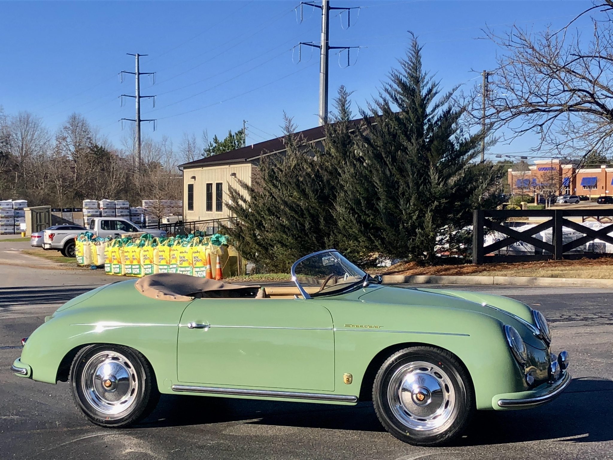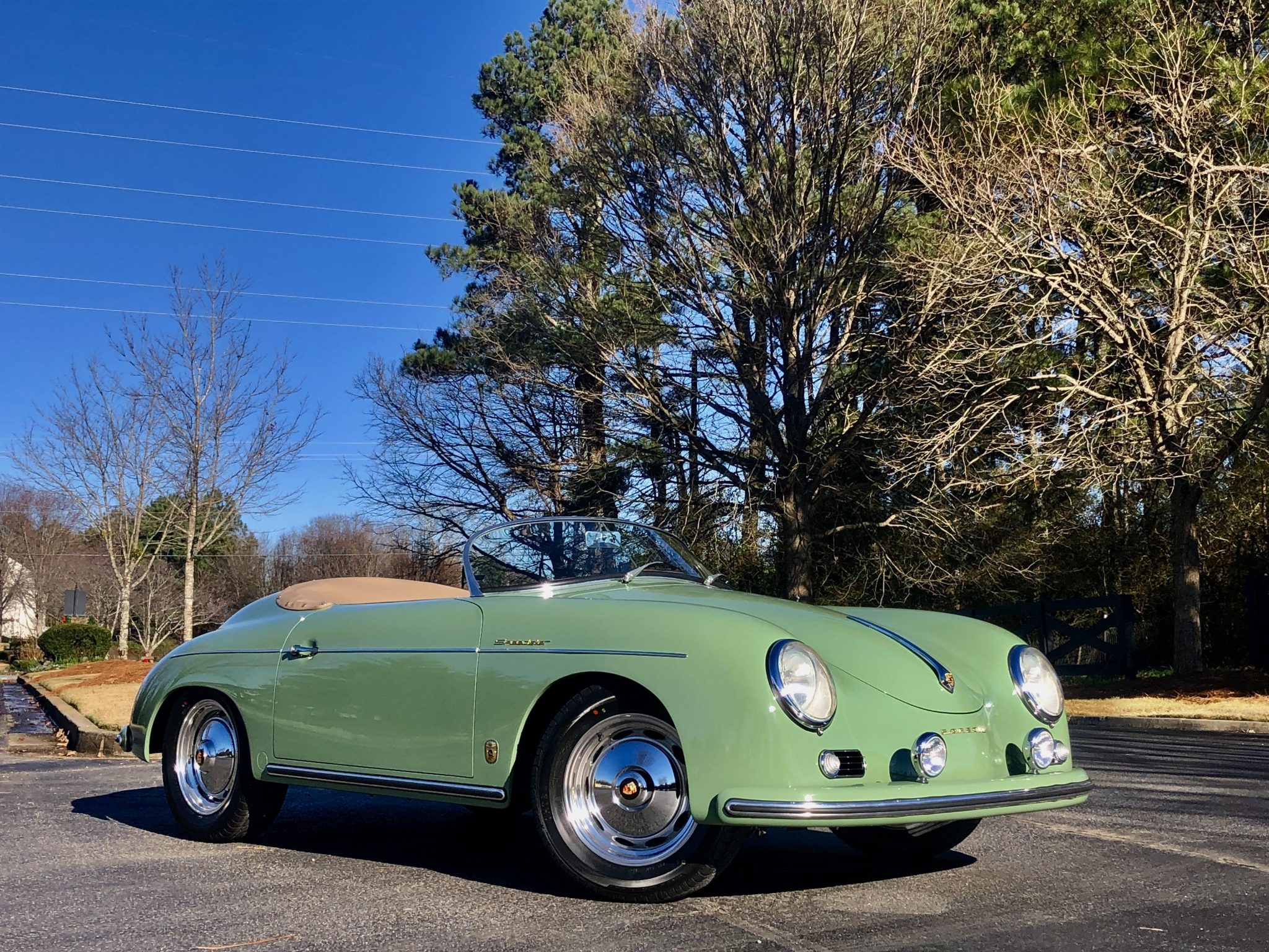 Polished 15″ Vintage 190 aluminum five-lug wheels wear matching hubcaps with Porsche crests and 195/65 Ohtsu FP7000 tires. Stopping power is provided by four-wheel disc brakes.