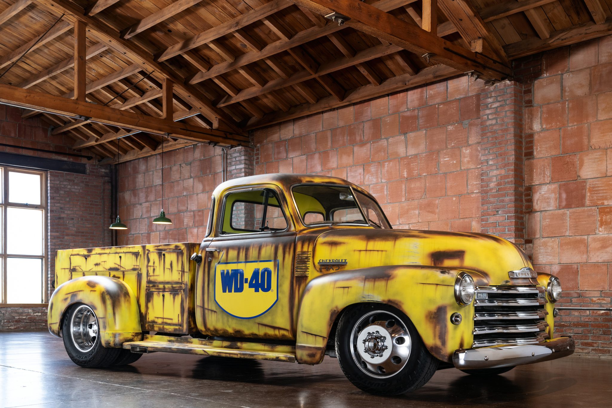Custom paintwork by Airhead Designs in Crandon, Wisconsin, incorporates simulated corrosion and wear to mimic the appearance and texture of a weathered yellow finish. Features include a matching windshield visor, yellow headlight lenses, WD-40 branding on each door, and custom “TRAD” badges on the hood corners. Weatherstripping is said to have been refreshed during the build, while the glass was retained and is said to exhibit areas of etching. Various imperfections in panel alignment are noted, and the doors are said to require exertion to shut.