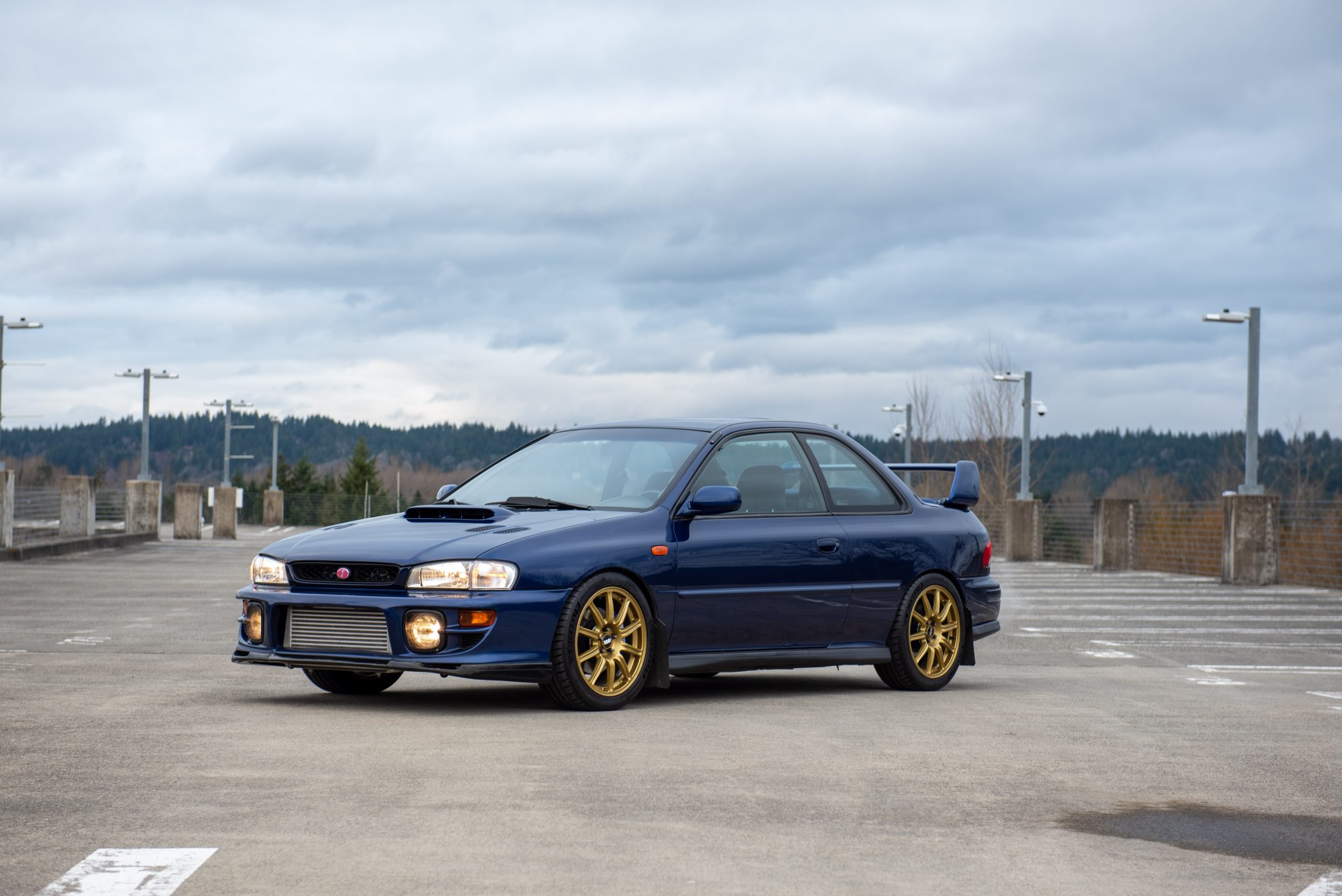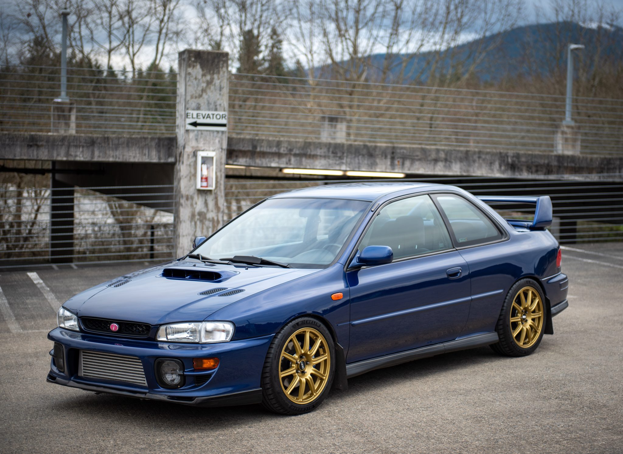 Gold-finished 17″ BBS wheels are mounted over 8mm hub-centric spacers and wear 225/45 Michelin Pilot Sport 4S tires that were installed by the selling dealer. A WRX steering rack and extended wheel studs are installed. The suspension and braking systems have been modified with the following components: