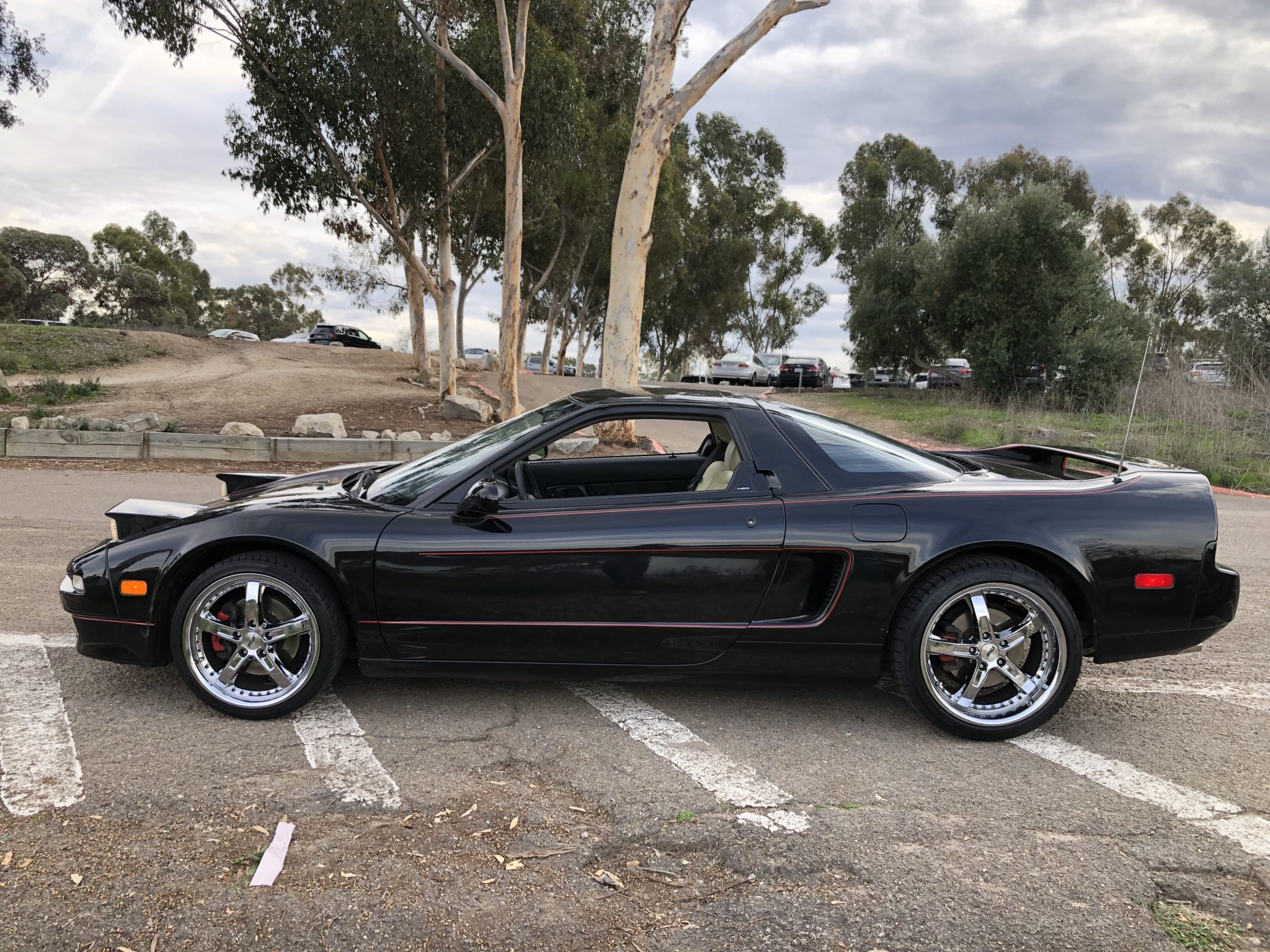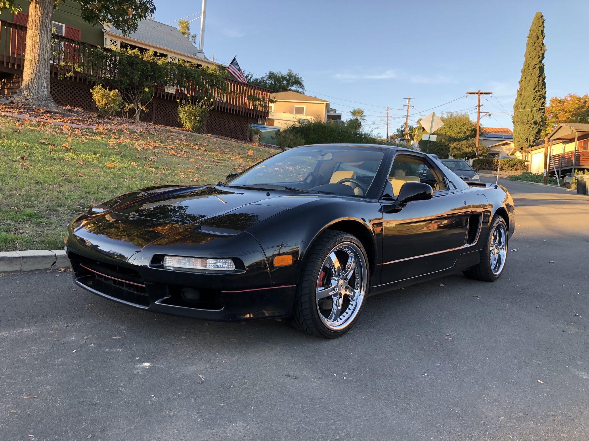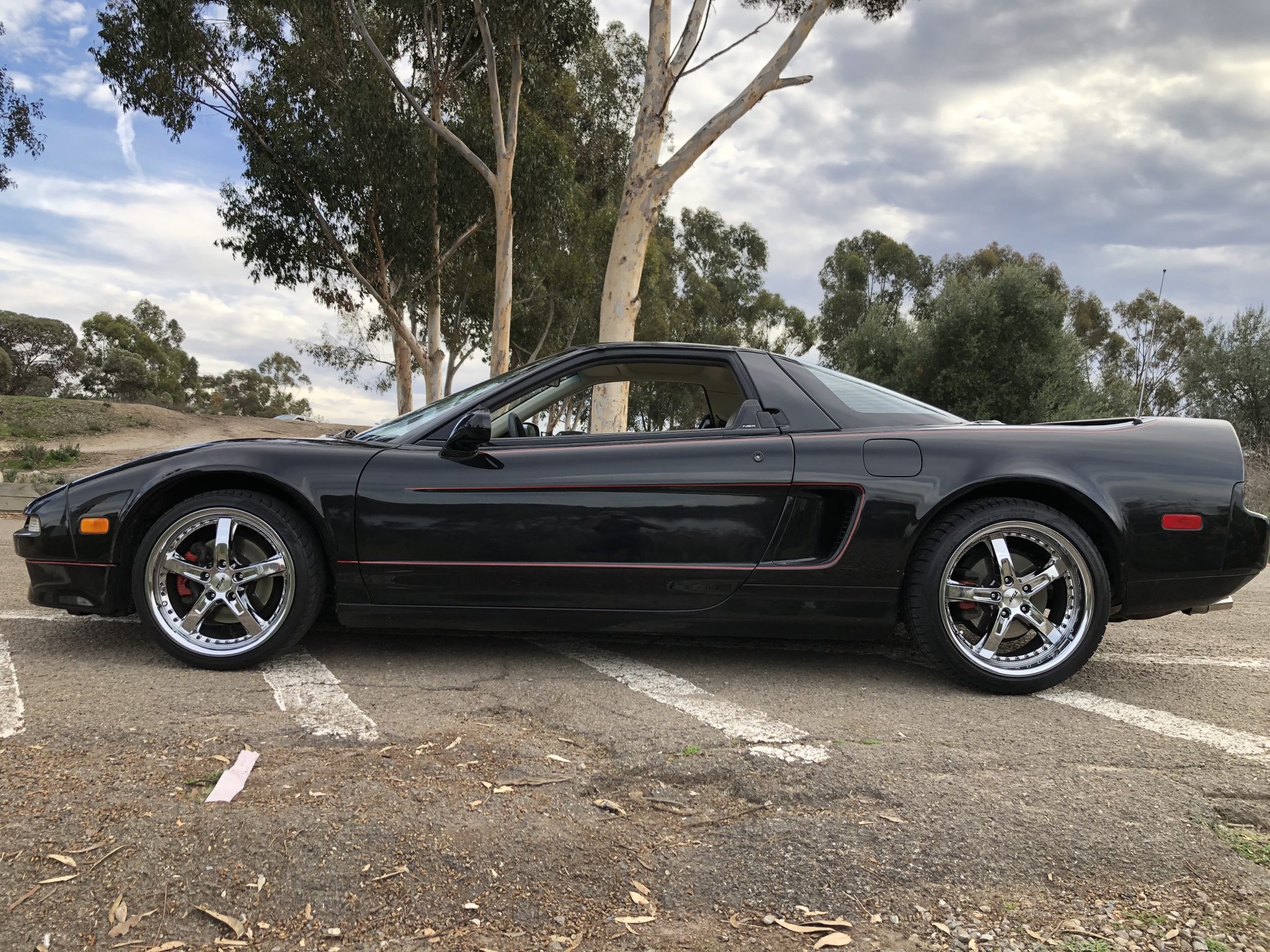 TSW Jarama 17″ and 18″ wheels are mounted with 225/35 front and 265/35 rear Falken tires, and the rear tires were replaced in 2021. Stopping is handled by four-wheel disc brakes. The removed factory wheels are included in the sale.