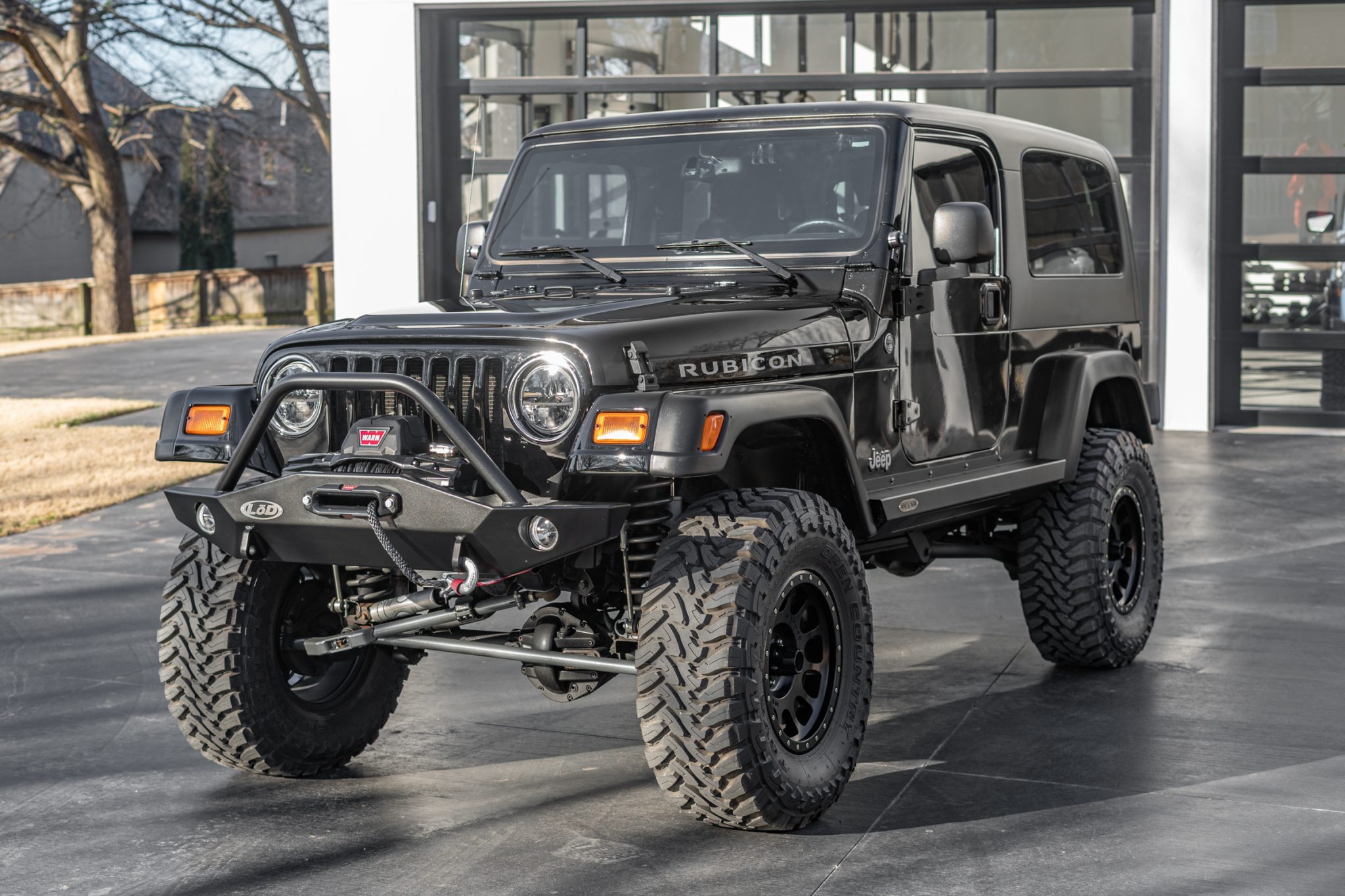 Black-finished 17″ Method alloy wheels wear 35×12.5″ Toyo Open Country M/T tires, and a matching spare is mounted on a rear tire carrier. A lift kit and Fox steering stabilizer have been fitted, and braking is handled by discs at each corner.