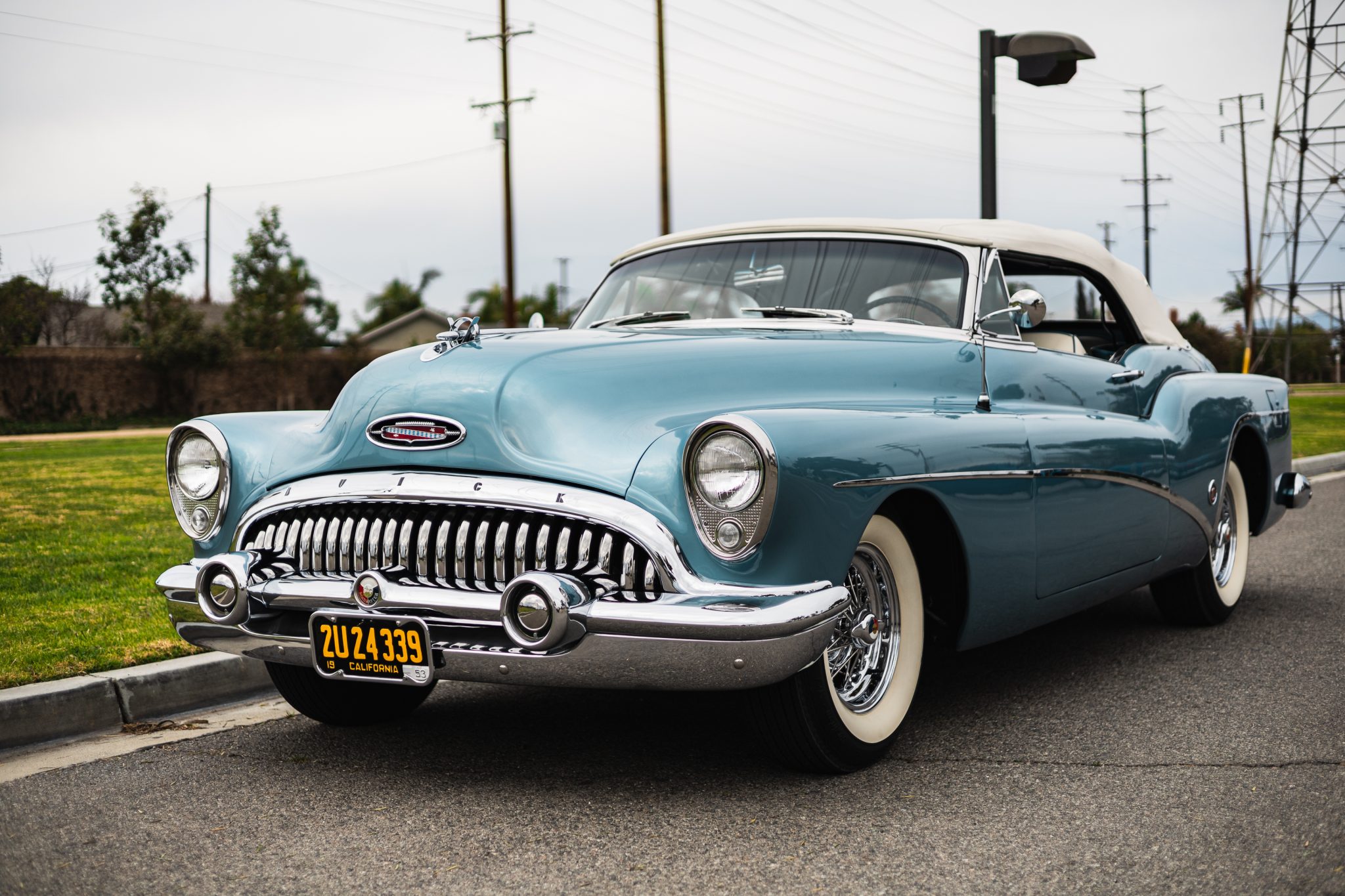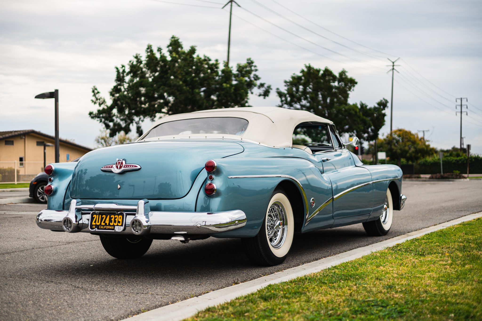 Chrome 15″ wire wheels wear two-eared spinner trim and whitewall tires, and a matching spare is mounted in the trunk.