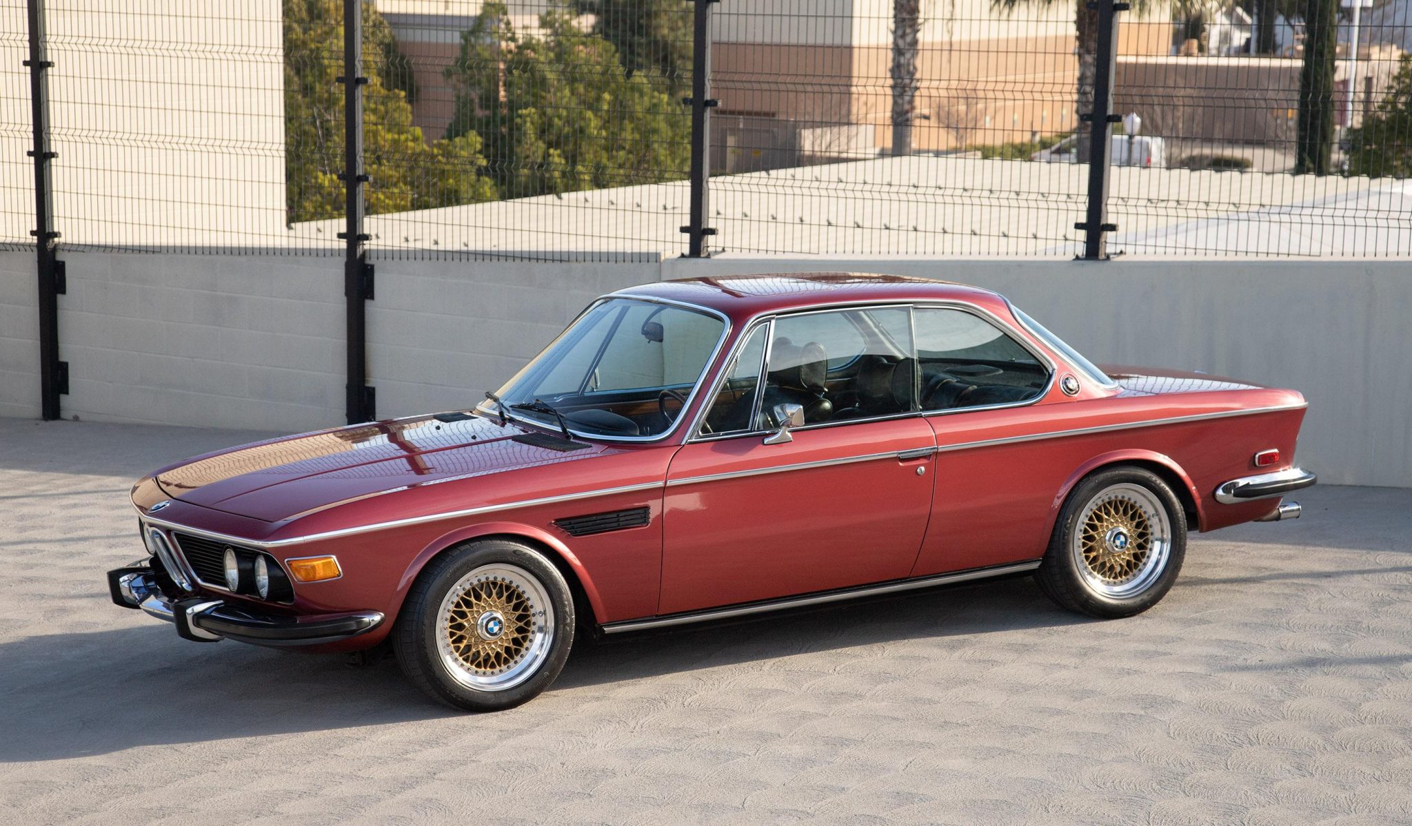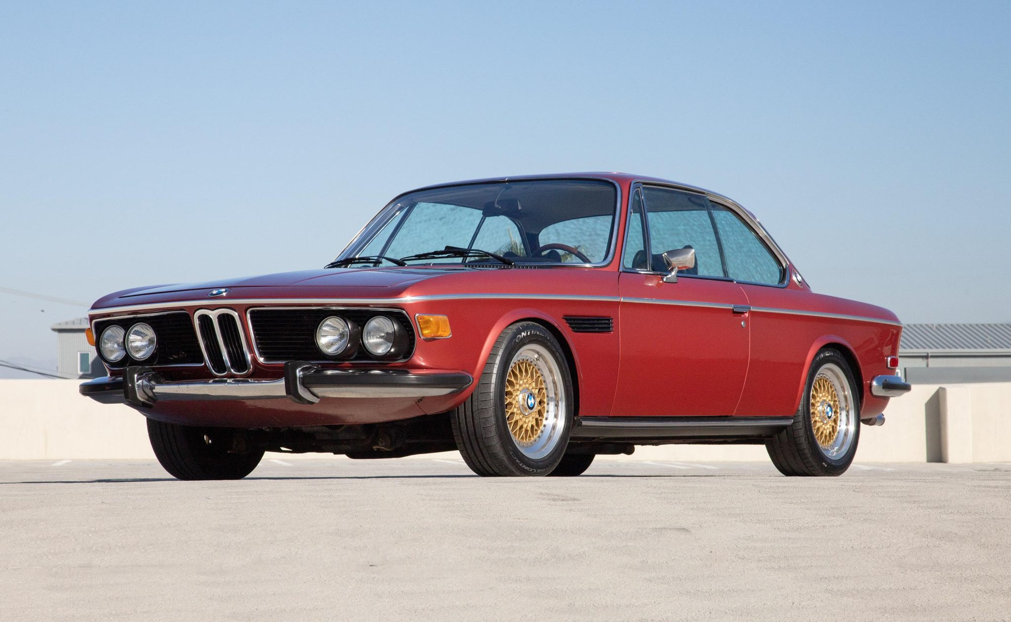 Staggered-width 16″ gold-finished BBS RS wheels feature BMW-branded center caps and wear Continental ExtremeContact tires. Equipment includes an Ireland Engineering front strut tower brace, B&G progressive springs up front, Ground Control adjustable springs out back, and Bilstein shocks all around. Work performed in September 2021 included a brake fluid flush and a repair of the passenger-side front turn signal wiring.