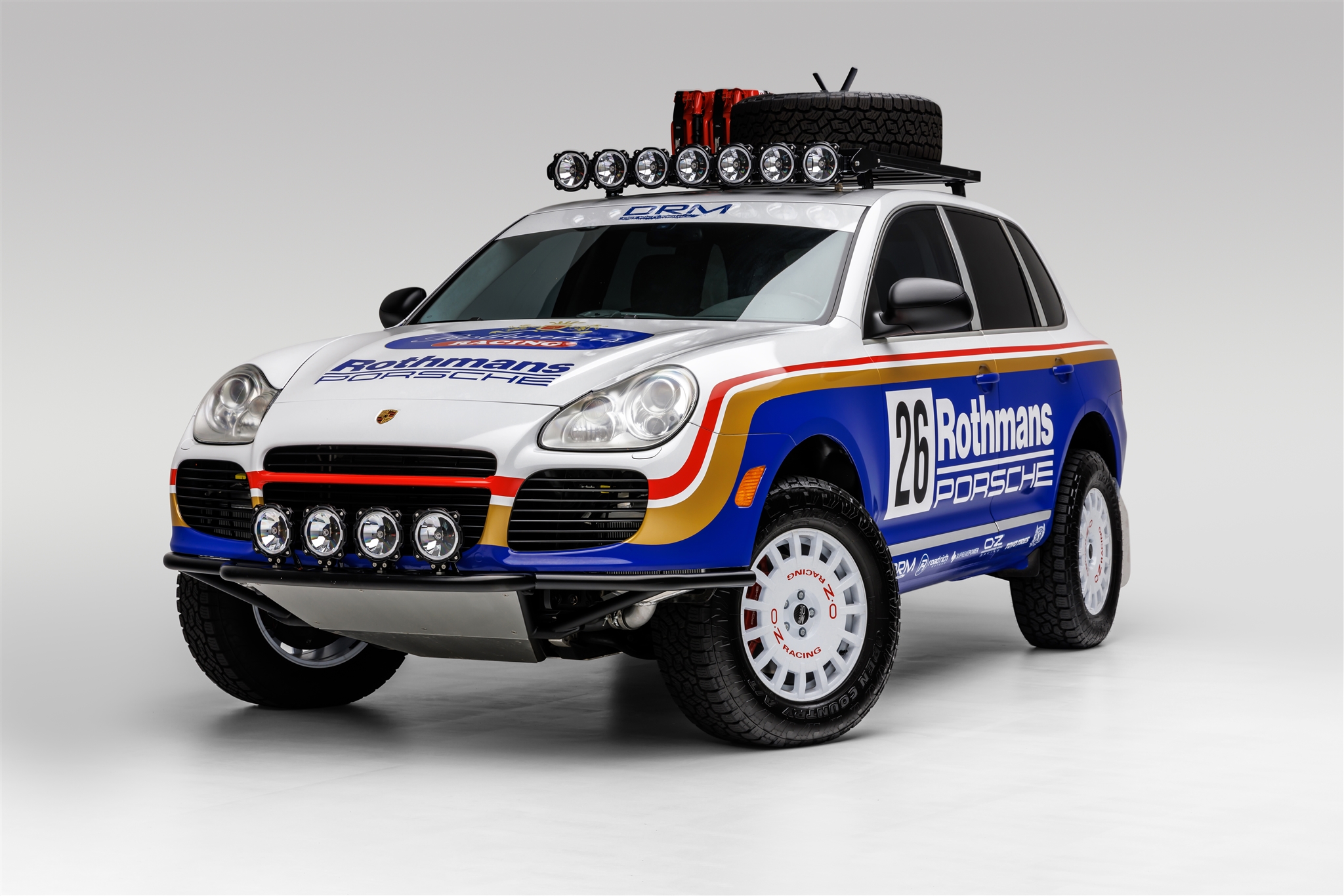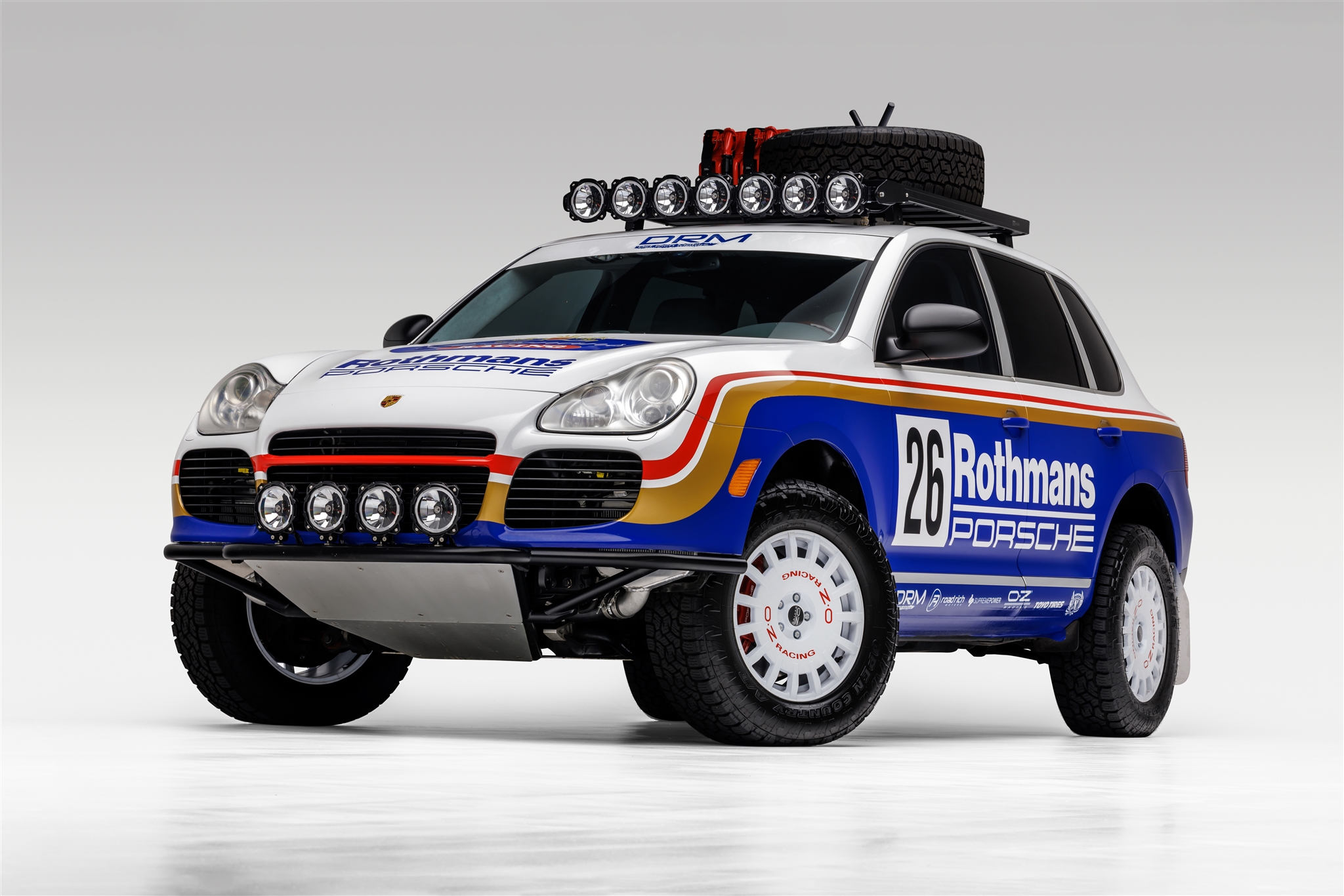 White 18″ OZ wheels are mounted with H&R 25mm wheel adapters and wear 265/65 Toyo Open Country A/T tires. Cayenne Turbo models were factory-equipped with adjustable air suspension, and the selling dealer notes that aftermarket suspension links have been added to raise the height of the vehicle.