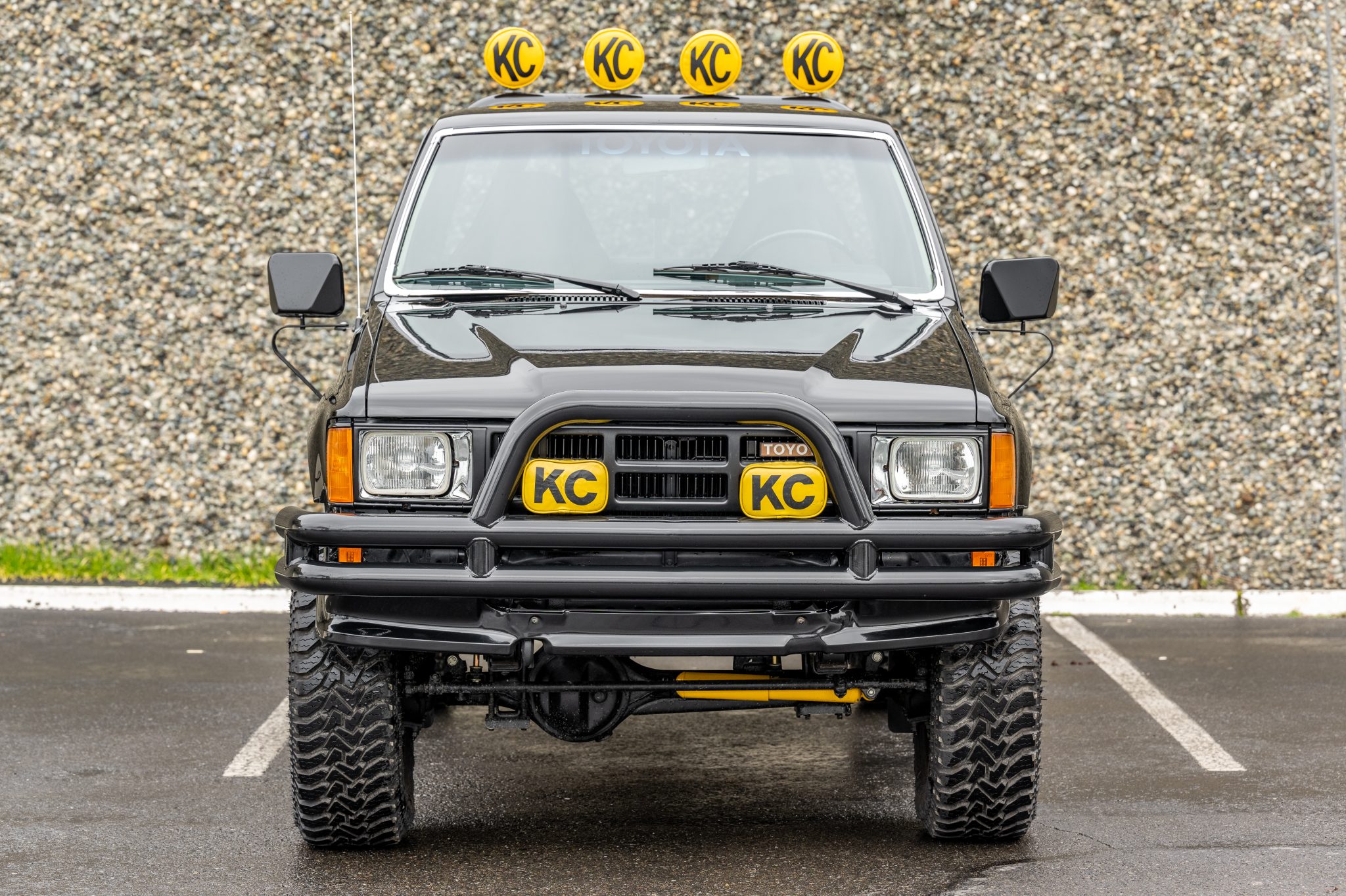 Aftermarket 15″ wheels with black centers and polished lips wear 31×10.5″ Goodyear Wrangler Authority T/A tires. The suspension is lifted and fitted with Bilstein shock absorbers at all four corners. Braking is provided by power-assisted front discs and rear drums.