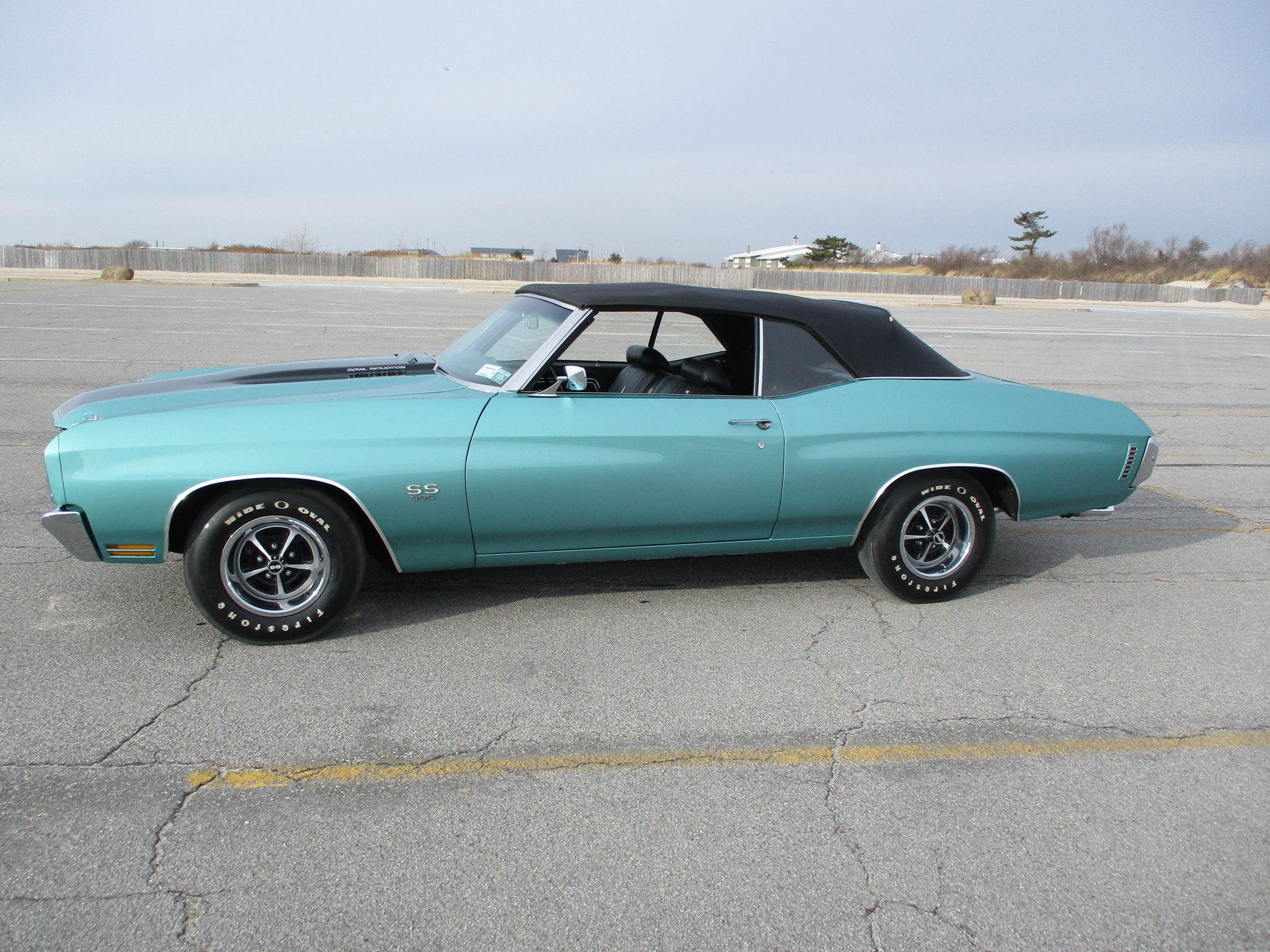 Chrome-accented 14″ Super Sport wheels wear polished trim rings and are wrapped in Firestone Wide Oval tires with raised white letters. The car is equipped with power steering, and braking is handled by power-assisted front discs and rear drums. A spare is located in the trunk.