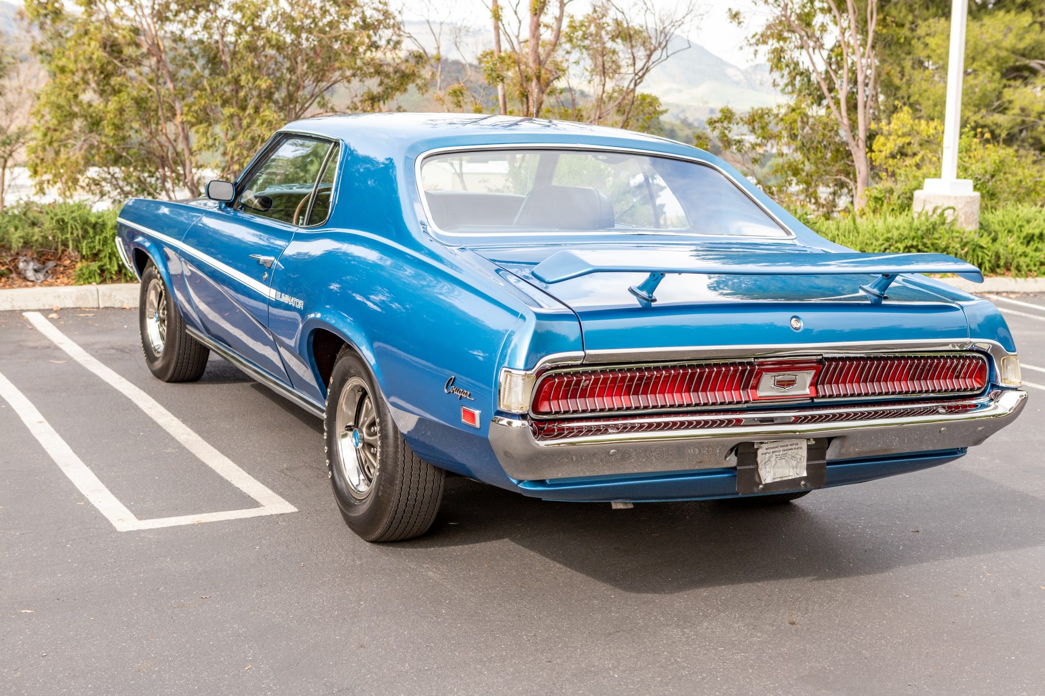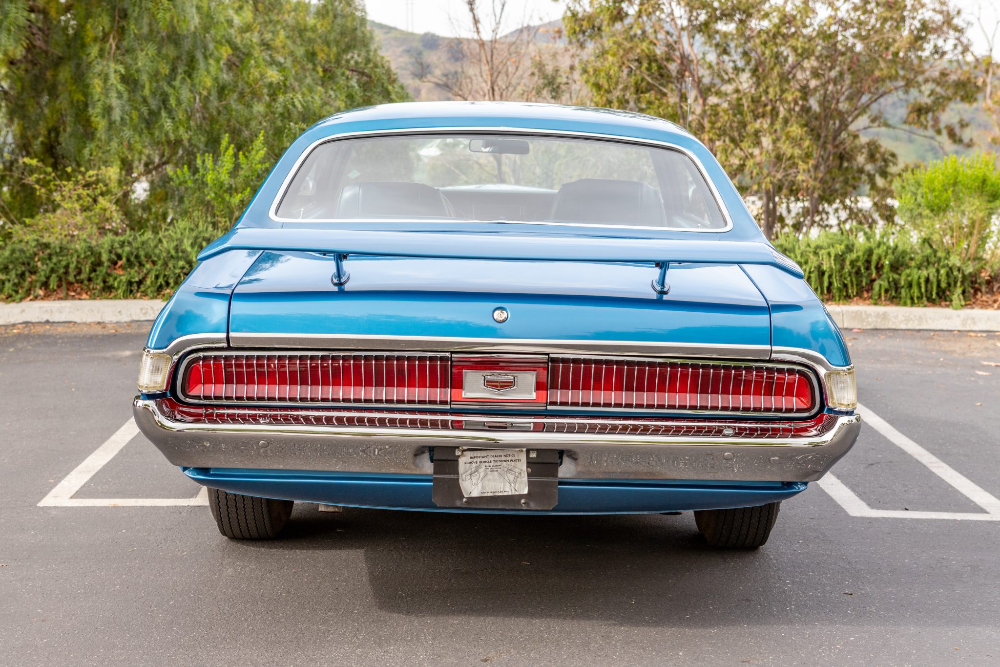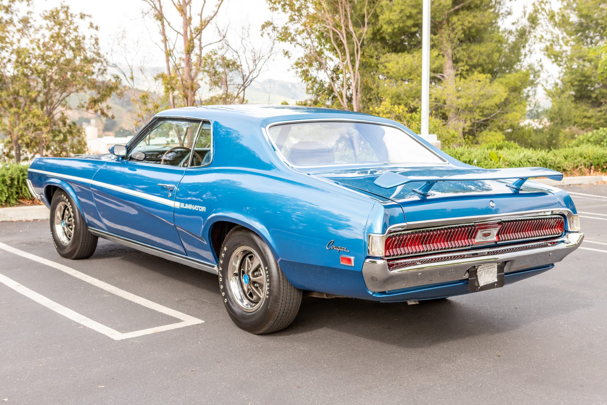 14″ rally wheels are finished in black and wear chrome trim rings and blue center caps. Goodyear Polyglas tires feature raised white lettering, and braking is from four-wheel drum brakes.