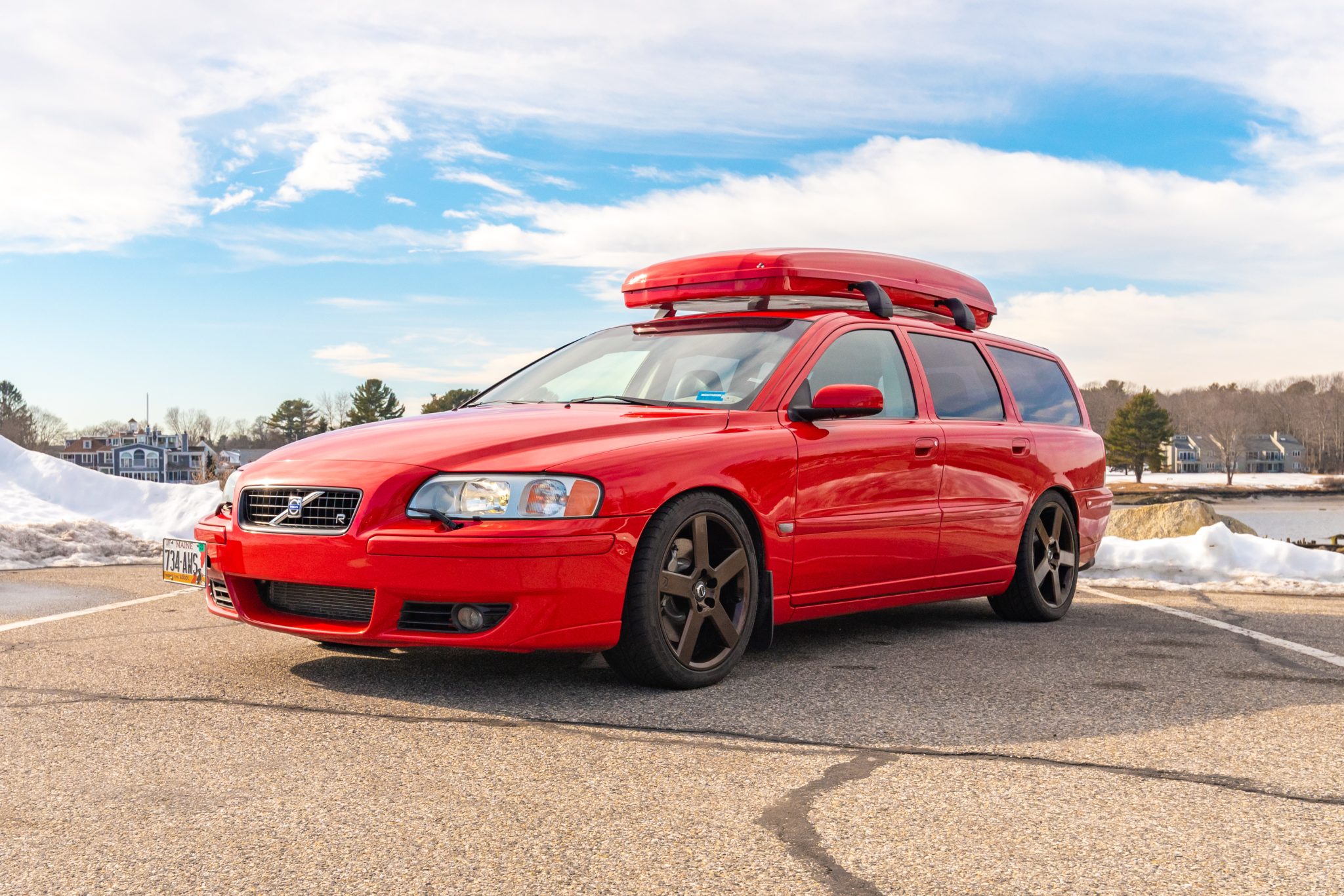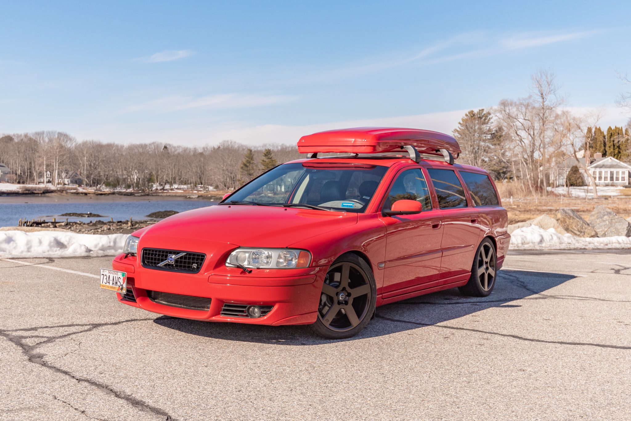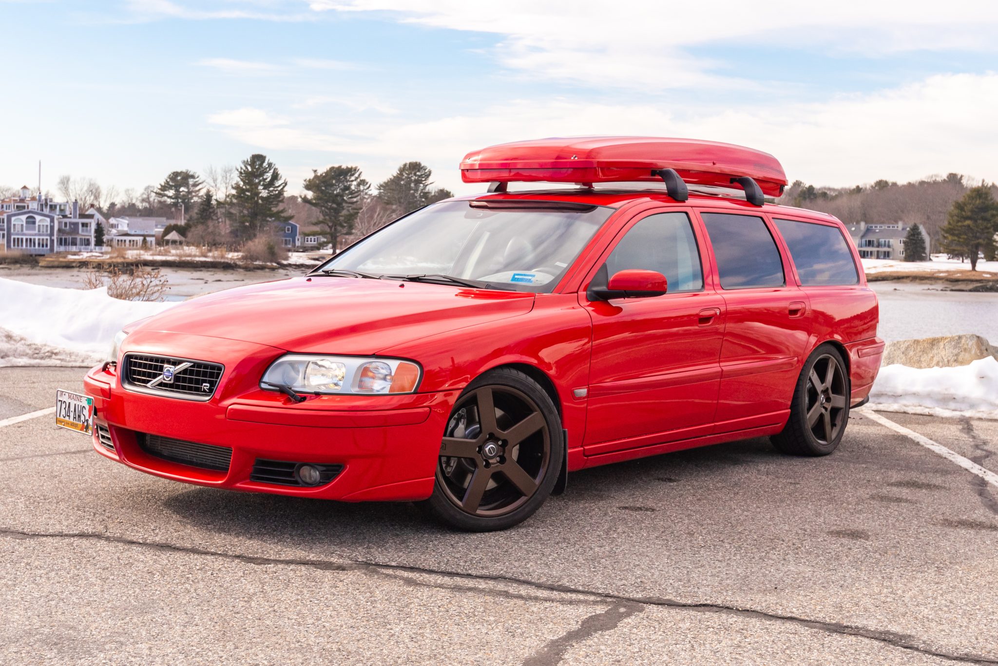 The R-branded Pegasus-style 18″ wheels were refinished in bronze and are mounted with 235/40 Nitto NT555 Extreme ZR tires. A matching set of 17″ wheels wrapped in an older set of Michelin winter tires is included in the sale. Braking is provided by multi-piston calipers front and rear, and the suspension has been modified with lowering springs, sway bars, and polyurethane bushings.